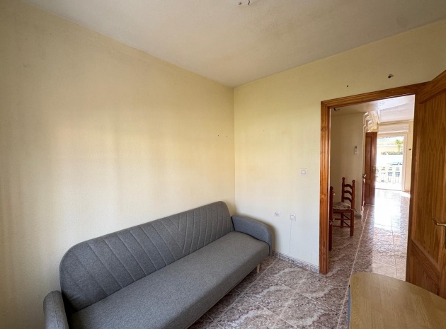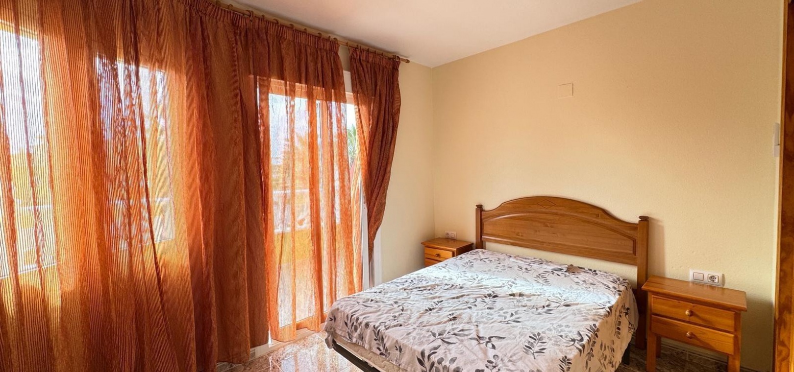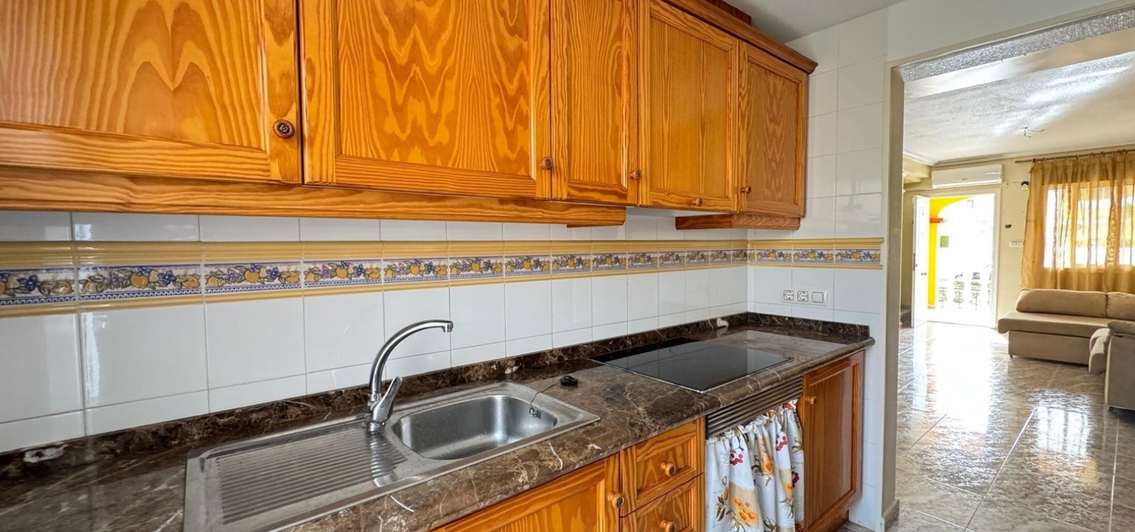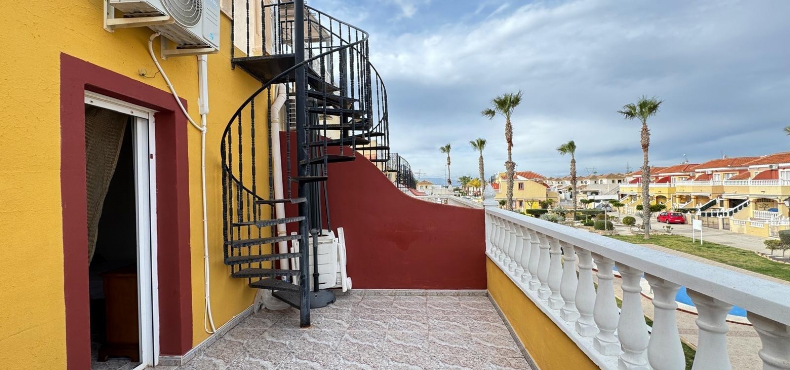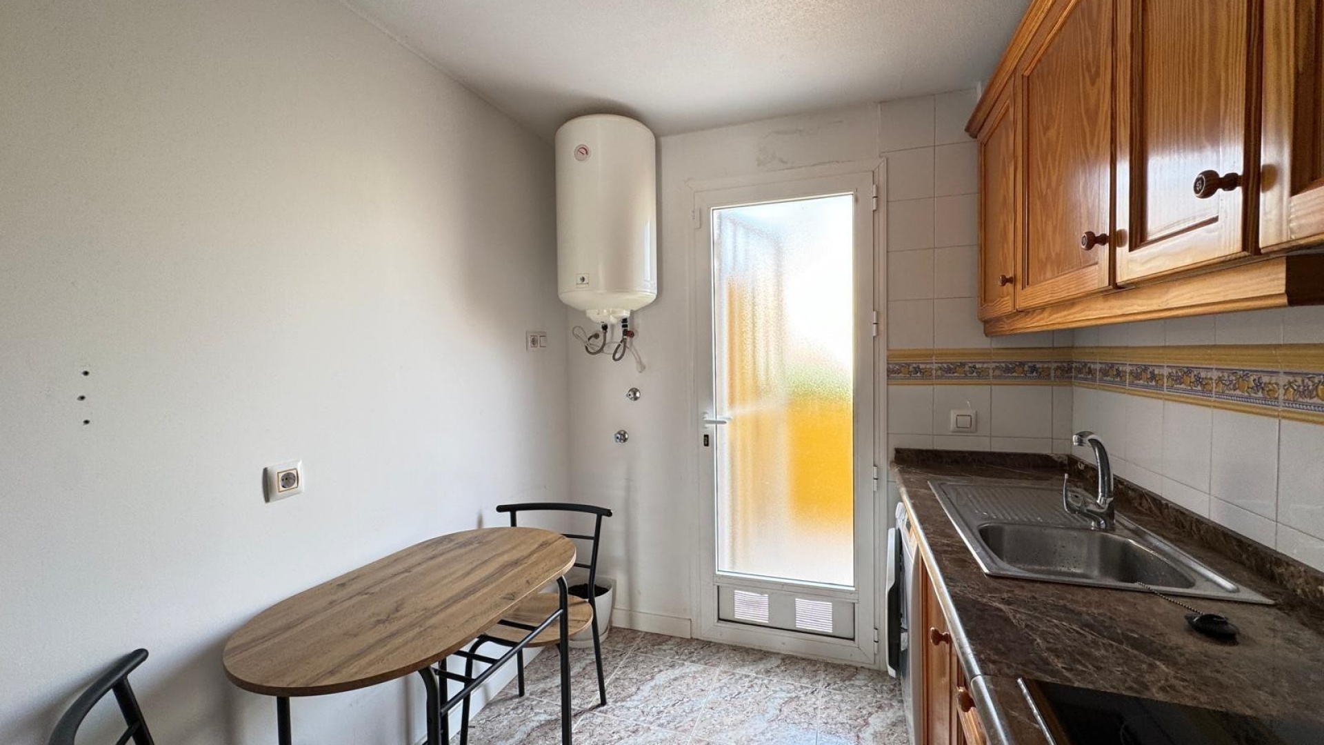 Op de begane grond bevinden zich een woon-/eetkamer met warme en koude airconditioning, een aparte ingerichte keuken, een aparte bijkeuken, een achtertuin met directe toegang tot het gemeenschappelijke zwembad, 1 slaapkamer met tweepersoonsbed en 1 toilet.