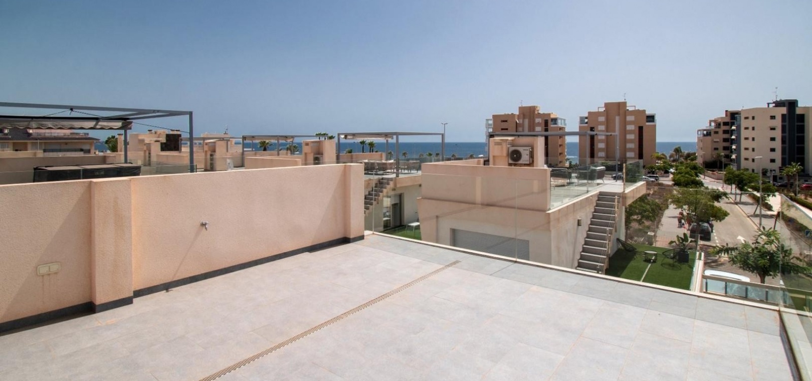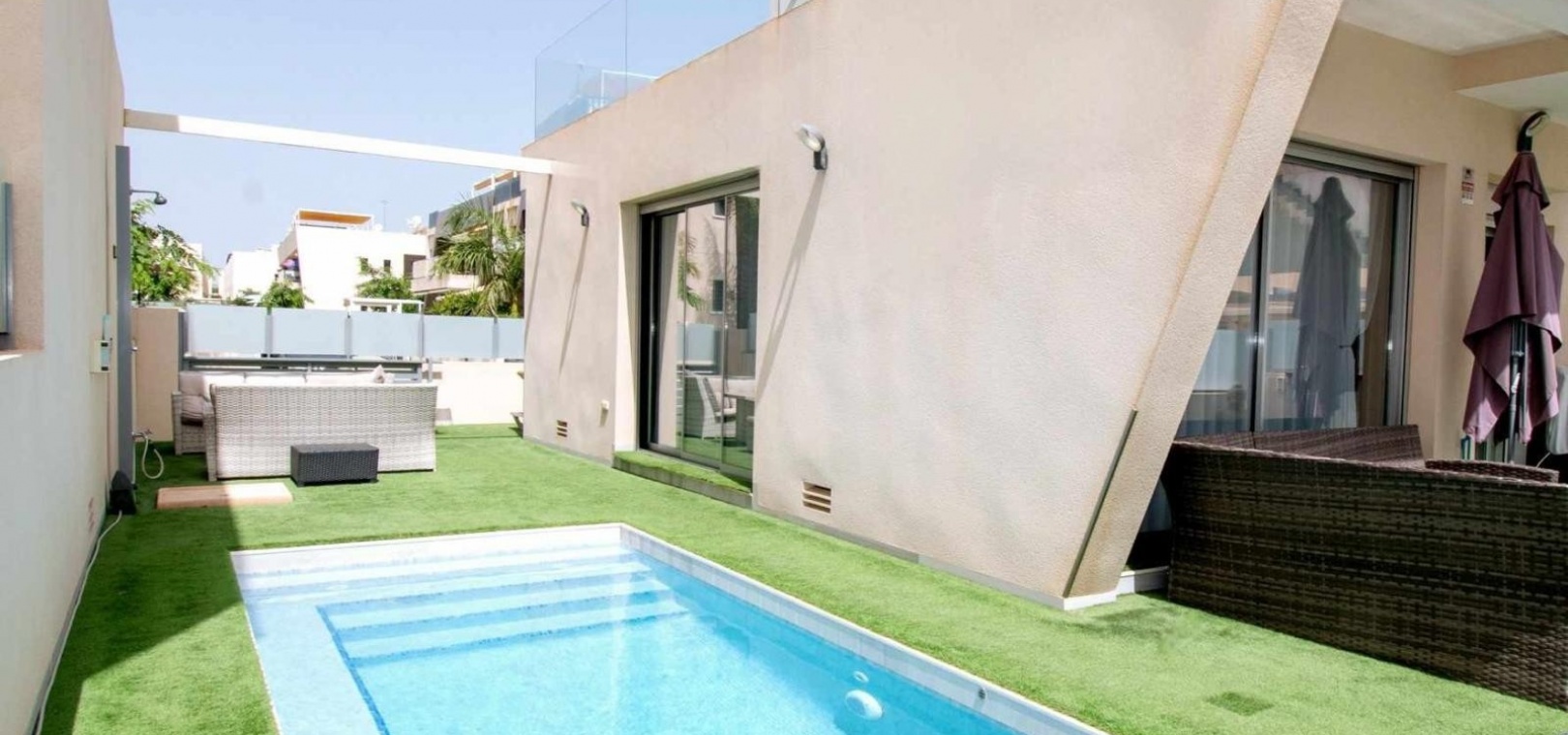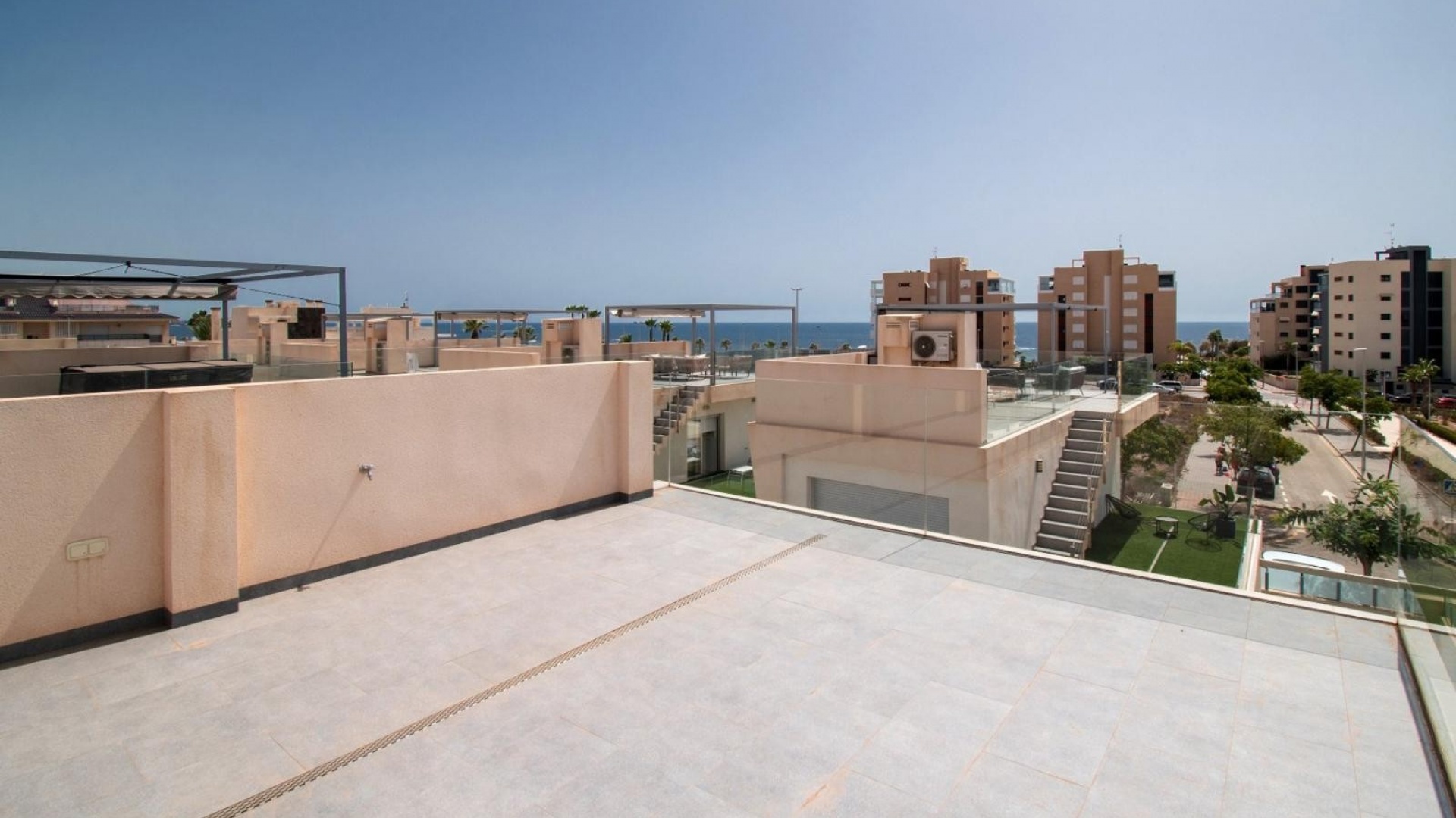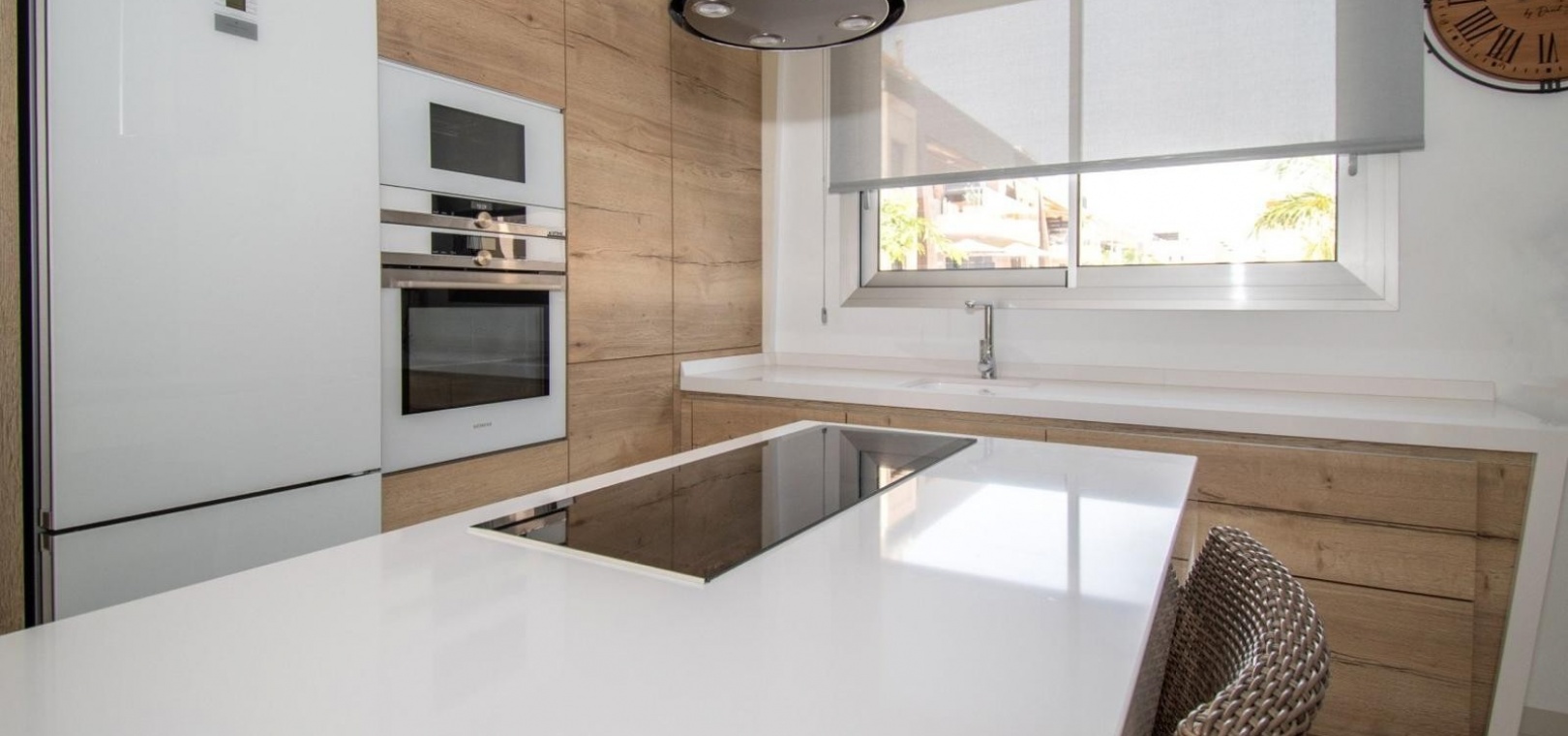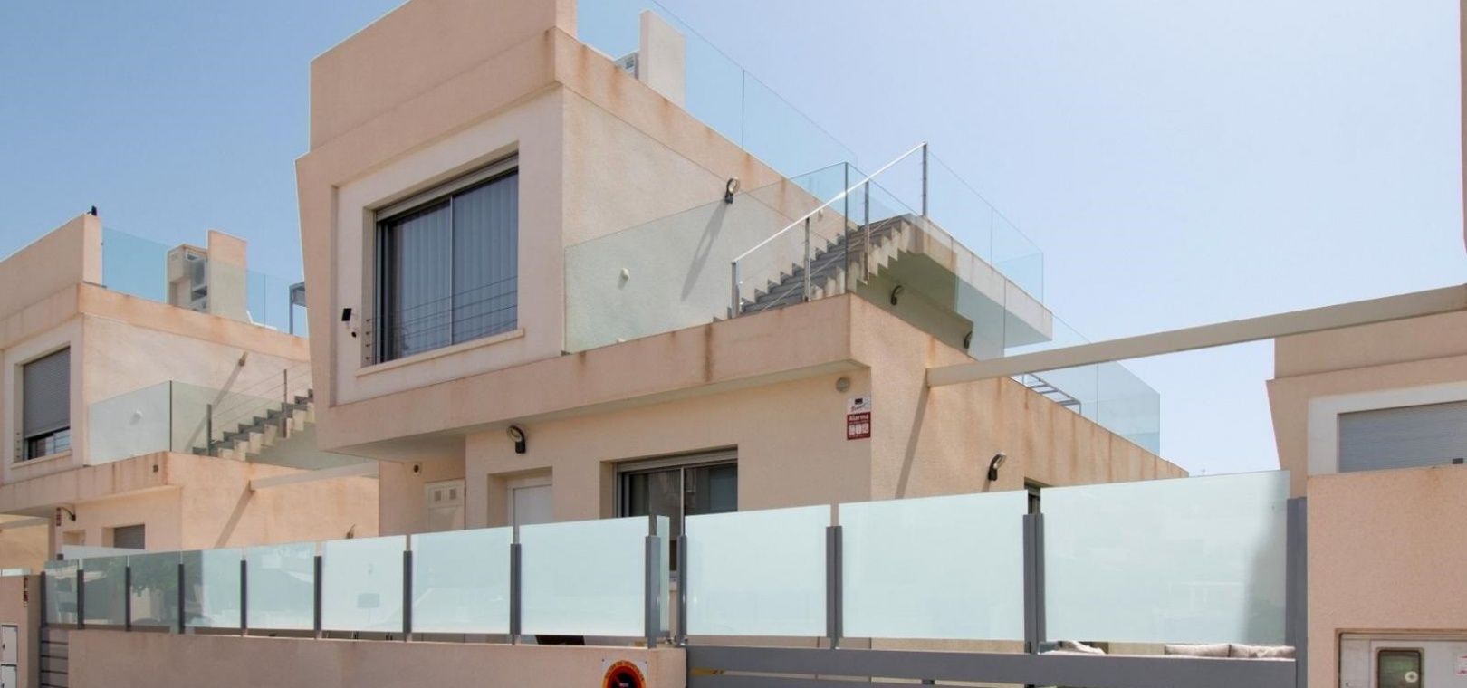 Deze vrijstaande villa met drie slaapkamers op het oosten in Mil Palmeras ligt op slechts 150 meter van de prachtige zee en de stranden van Mil Palmeras, op loopafstand van een scala aan lokale voorzieningen en faciliteiten. Deze moderne, hoogwaardige woning, gebouwd in 2019, beschikt over 3 slaapkamers en 3 doucheruimtes (2 en suite), allemaal met inbouwkasten. Airzone-airconditioning zorgt voor comfort, terwijl de open keuken met een kookeiland en Siemens-apparaten een luxe tintje toevoegt. De villa beschikt ook over een bijkeuken, off-road parkeren en een kunstgrastuin, aangevuld met een overdekt terras naast de woonkamer. Het solarium op twee niveaus biedt een spectaculair uitzicht op zee en de woning beschikt over een aparte privégarage. Een verwarmd privézwembad met een zwembadafdekking verbetert de buitenruimte, terwijl de villa volledig gemeubileerd wordt verkocht met een veiligheidsdeur voor extra gemoedsrust. Deze woning heeft een bebouwde oppervlakte van 120 m² op een perceel van 320 m² en biedt vele extra's. De woning ligt op slechts vijf minuten rijden van Orihuela Costa aan de Costa Blanca Zuid.