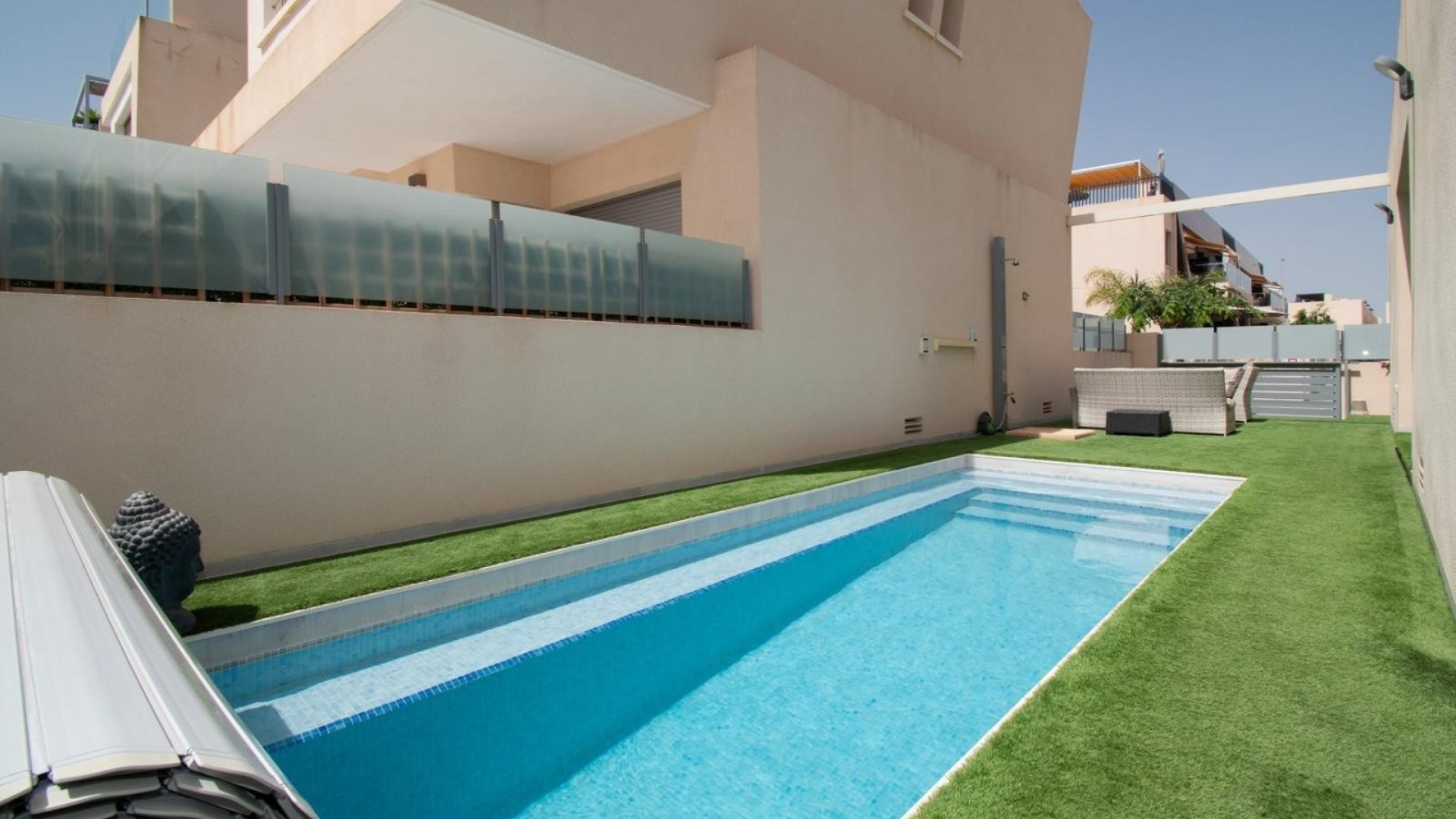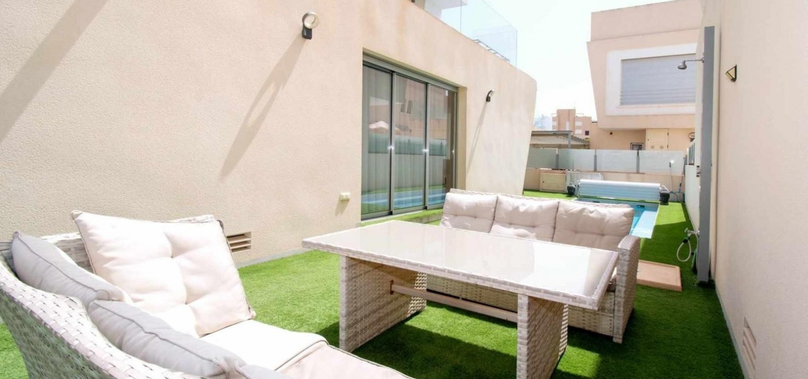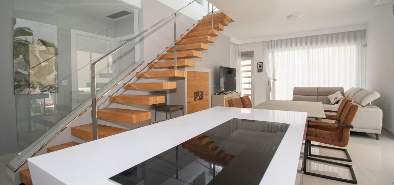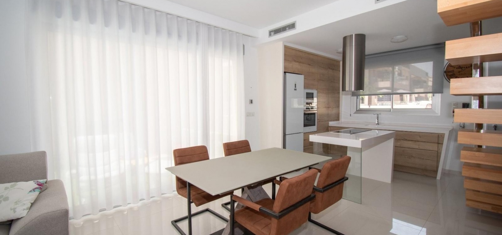 Deze vrijstaande villa met drie slaapkamers op het oosten in Mil Palmeras ligt op slechts 150 meter van de prachtige zee en de stranden van Mil Palmeras, op loopafstand van een scala aan lokale voorzieningen en faciliteiten. Deze moderne, hoogwaardige woning, gebouwd in 2019, beschikt over 3 slaapkamers en 3 doucheruimtes (2 en suite), allemaal met inbouwkasten. Airzone-airconditioning zorgt voor comfort, terwijl de open keuken met een kookeiland en Siemens-apparaten een luxe tintje toevoegt. De villa beschikt ook over een bijkeuken, off-road parkeren en een kunstgrastuin, aangevuld met een overdekt terras naast de woonkamer. Het solarium op twee niveaus biedt een spectaculair uitzicht op zee en de woning beschikt over een aparte privégarage. Een verwarmd privézwembad met een zwembadafdekking verbetert de buitenruimte, terwijl de villa volledig gemeubileerd wordt verkocht met een veiligheidsdeur voor extra gemoedsrust. Deze woning heeft een bebouwde oppervlakte van 120 m² op een perceel van 320 m² en biedt vele extra's. De woning ligt op slechts vijf minuten rijden van Orihuela Costa aan de Costa Blanca Zuid.