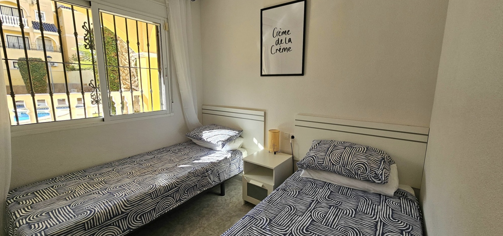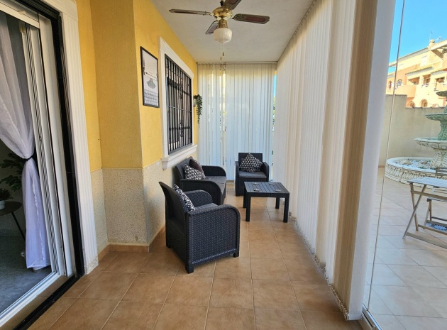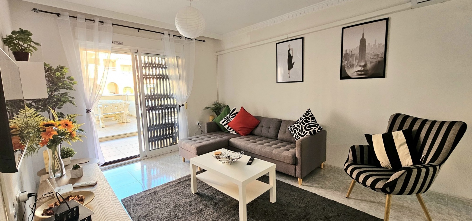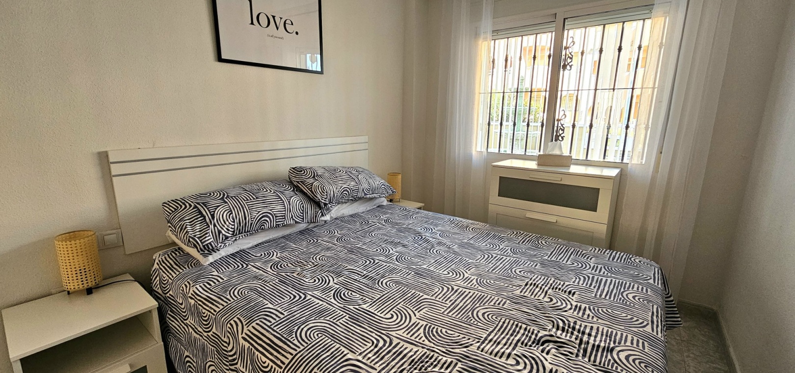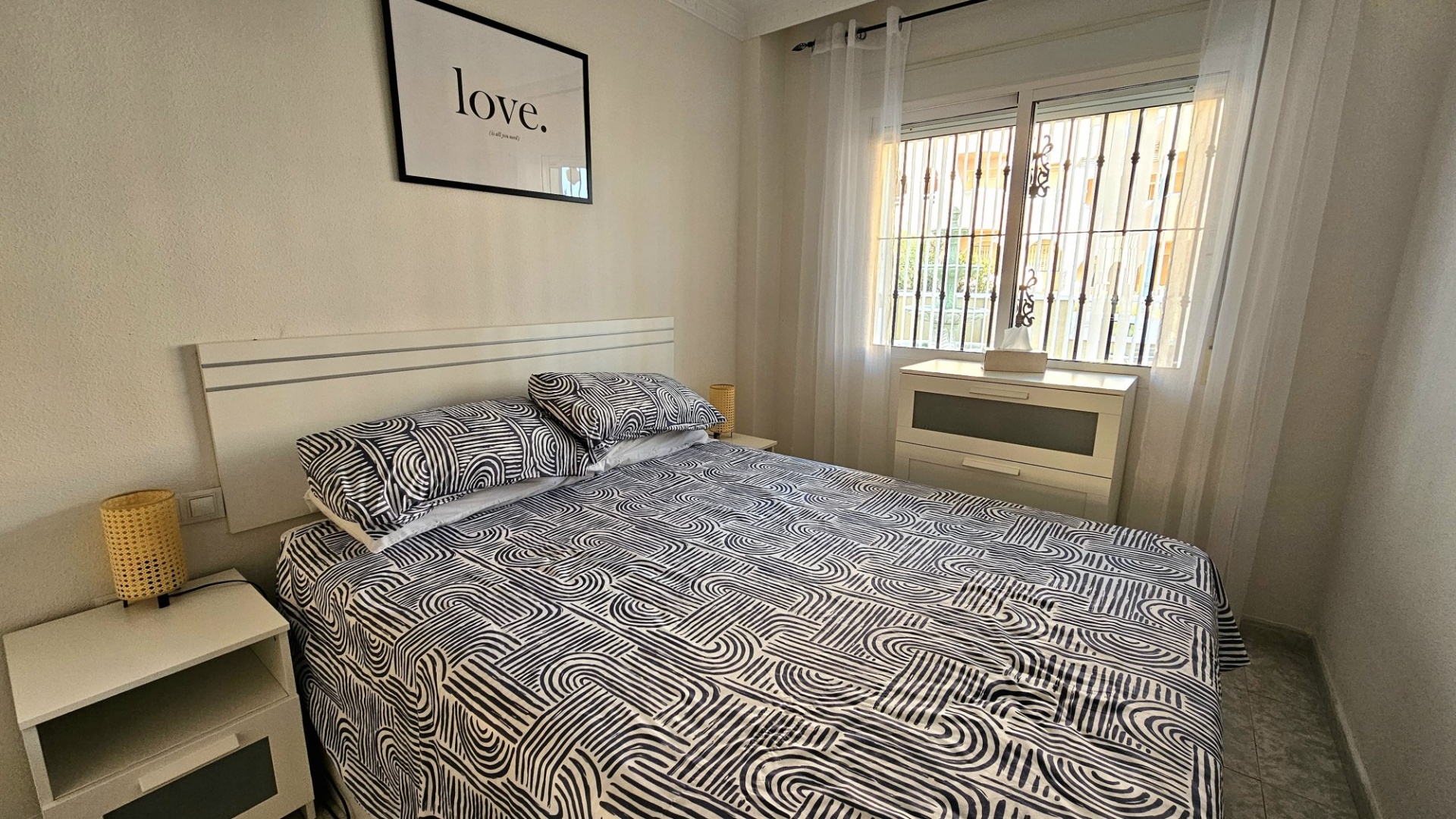 Dit unieke appartement met twee slaapkamers op de begane grond in Las Filipinas ligt op korte rijafstand van de golfbaan Villamartin en zijn populaire "plein". Bars, restaurants en een supermarkt van een grote keten liggen op slechts een paar minuten afstand, terwijl het winkelcentrum La Fuente op 15 minuten lopen ligt. Het winkelcentrum La Zenia Boulevard en de prachtige stranden zijn binnen 10-15 minuten rijden te bereiken. Dit prachtig gepresenteerde pand ligt op een hoekperceel van 107 m2 en is licht en uitnodigend. Het entreeterras is overdekt en omsloten met glazen gordijnen, waardoor een veelzijdige ruimte ontstaat om het hele jaar door van te genieten. Binnen is de woon-/eetkamer voorzien van een airconditioning en dubbele glazen schuifdeuren voor een licht en luchtig gevoel. De in Amerikaanse stijl ingerichte keuken is zowel functioneel als stijlvol, aangevuld met een aparte bijkeuken. Beide slaapkamers met tweepersoonsbedden zijn voorzien van inbouwkasten, terwijl de moderne ingerichte familiedouche de indeling van het interieur compleet maakt. De betegelde 'L'-vormige tuin biedt voldoende buitenruimte om te ontspannen of te entertainen. Extra voorzieningen zijn onder meer vooraf geïnstalleerde airconditioning, een ondergrondse parkeerplaats met berging, een gemeenschappelijk zwembad en het extra voordeel van een toeristenvergunning. Dit maakt dit pand een fantastische investering of vakantiehuis in Costa Blanca Zuid.
