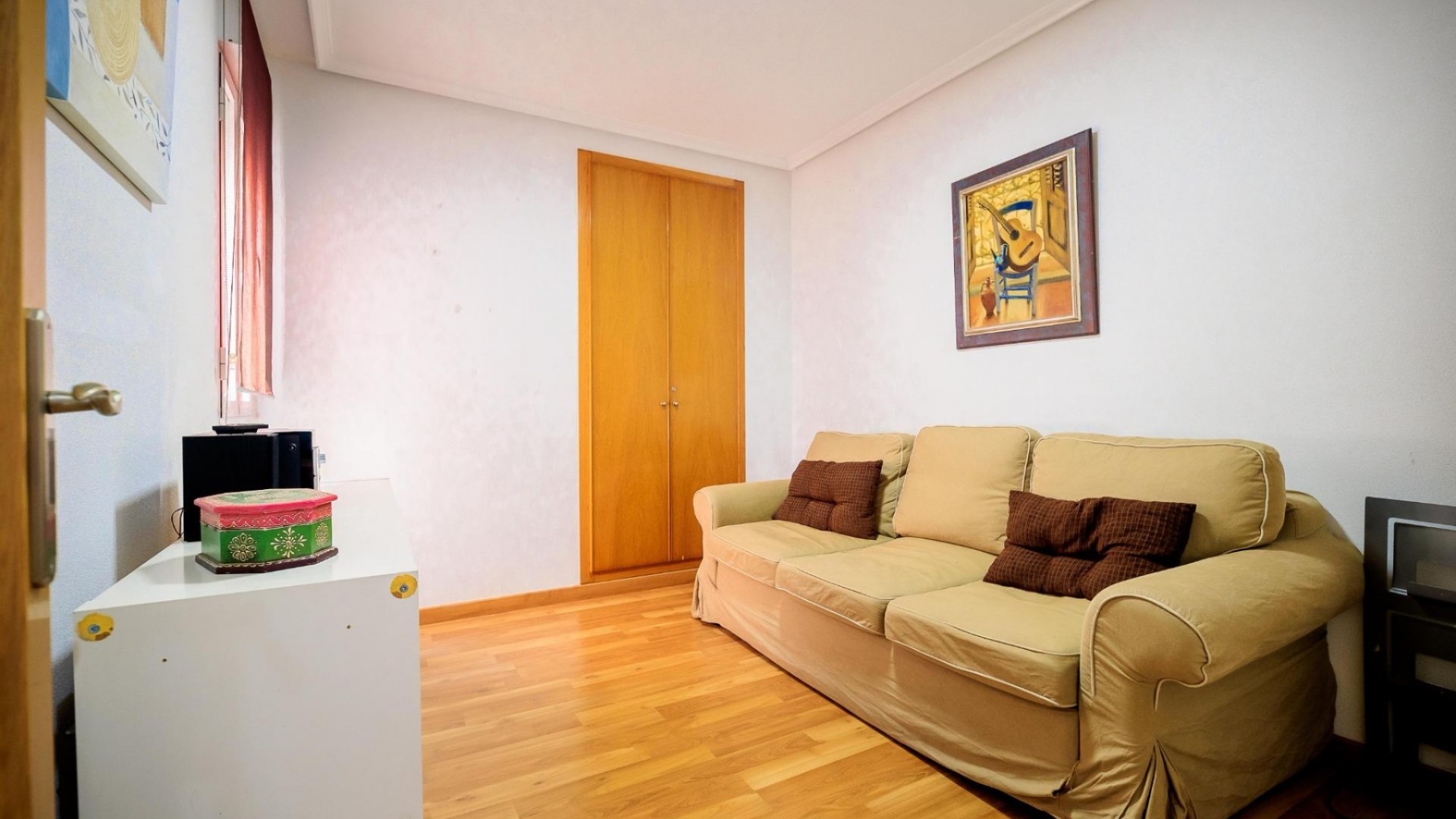 Appartement van 98 m² in Torrevieja, gelegen op de 5e verdieping van een gebouw uit 2005 met lift. Het beschikt over 3 slaapkamers, 2 badkamers, een aparte keuken en een woonkamer met toegang tot een ruim terras op het zuiden. Het appartement beschikt over airconditioning en een ondergrondse parkeerplaats.