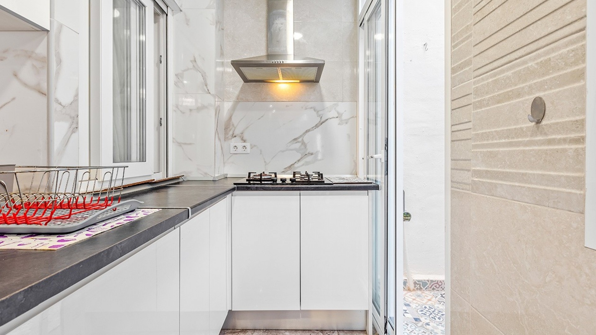 De badkamer heeft een bad en profiteert van een gasverwarmd watersysteem. Daarnaast kunnen bewoners genieten van een gemeenschappelijk solarium, perfect om te ontspannen onder de mediterrane zon.