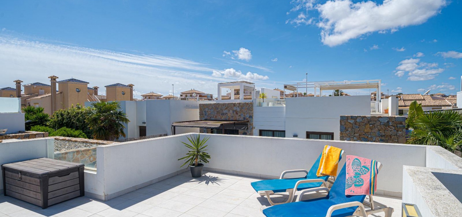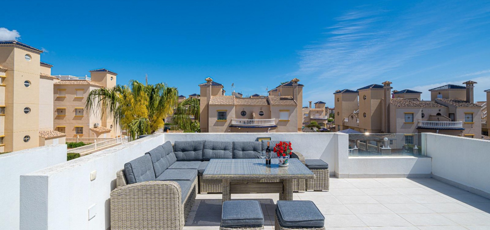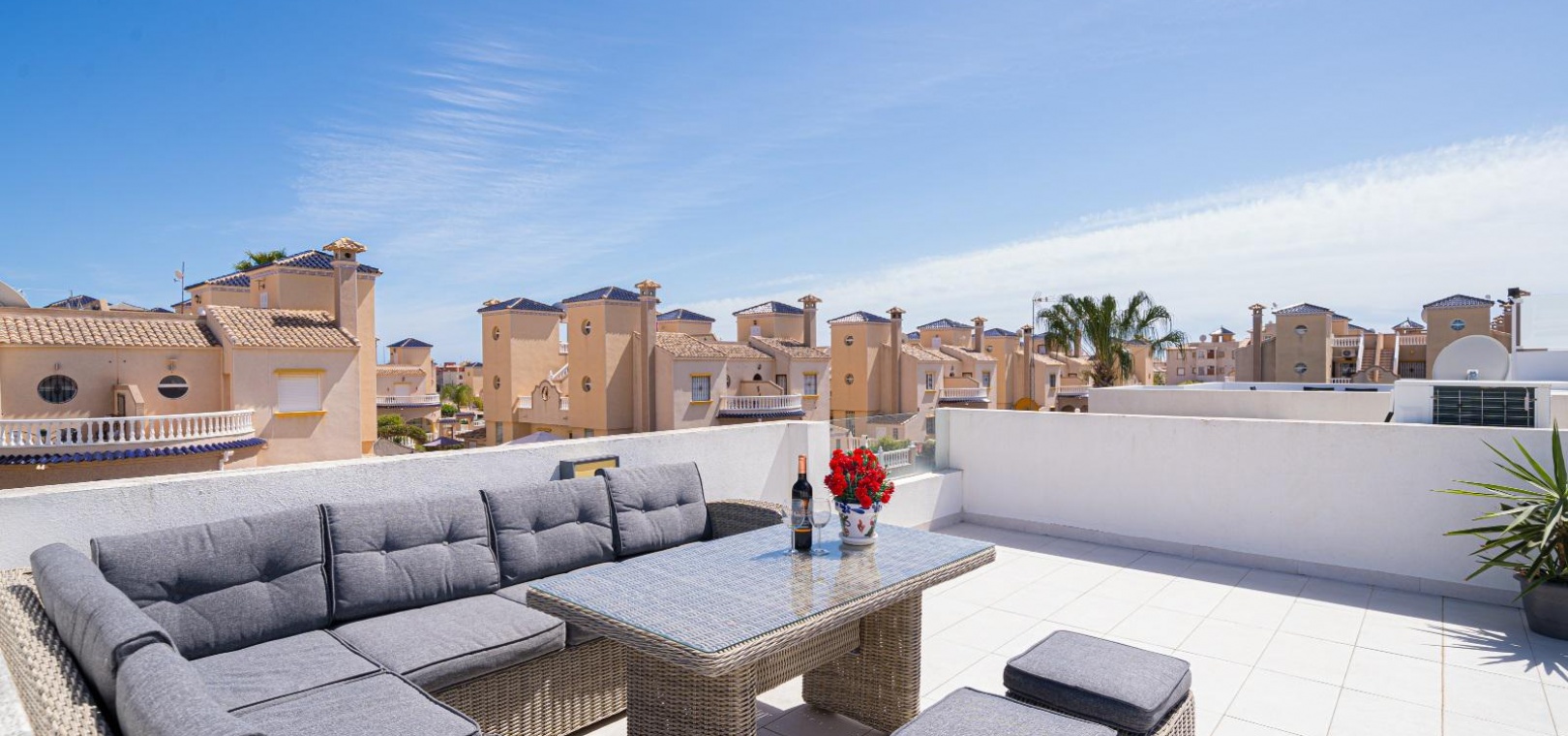 Deze accommodatie ligt op slechts een korte wandeling van het lokale commerciële centrum waar u talloze bars, winkels en restaurants vindt en op slechts 5 minuten rijden van de prachtige Blue Flag-zandstranden van Cabo Roig en Campoamor. De Cabo Roig-strook ligt ook op slechts 5 minuten rijden of u kunt gebruikmaken van de lokale busdienst. 2 minuten rijden naar 2 x golfbanen. De accommodatie ligt op 35 minuten rijden van de luchthaven Murcia Corvera en op 45 minuten rijden van de luchthaven Alicante.