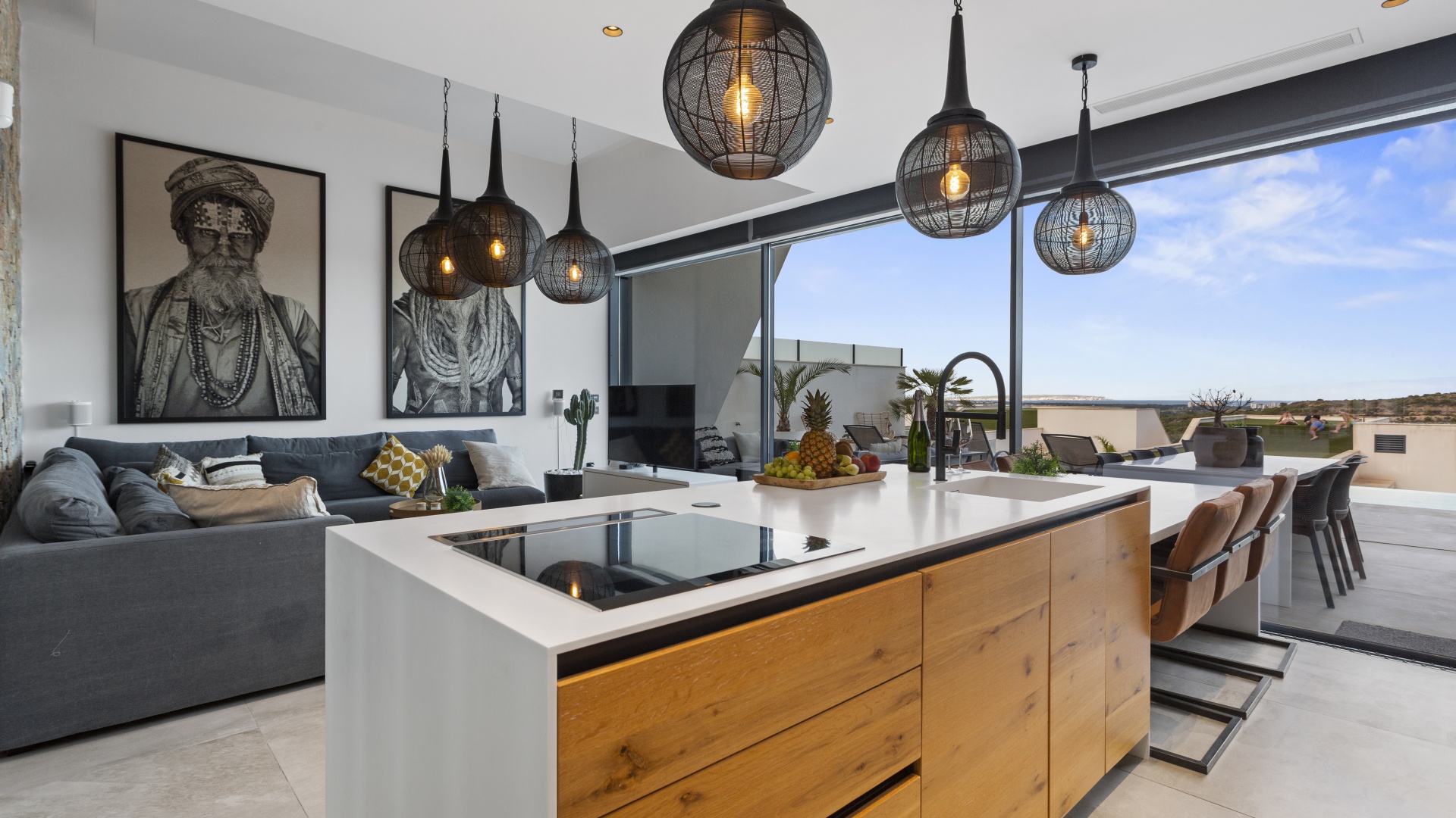 Op de begane grond vindt u een moderne keuken die naadloos overgaat in de lichte woonkamer. Vanaf hier heeft u direct toegang tot het ruime buitenterras, perfect voor het organiseren van barbecues, ontspannen in de zon of een verfrissende duik nemen in uw eigen zoutwaterzwembad. Op deze verdieping vindt u ook een slaapkamer met een en-suite badkamer en een gastentoilet. Voor extra comfort heeft het huis vloerverwarming in de woonkamer, keuken, entree, gastentoilet en alle badkamers.