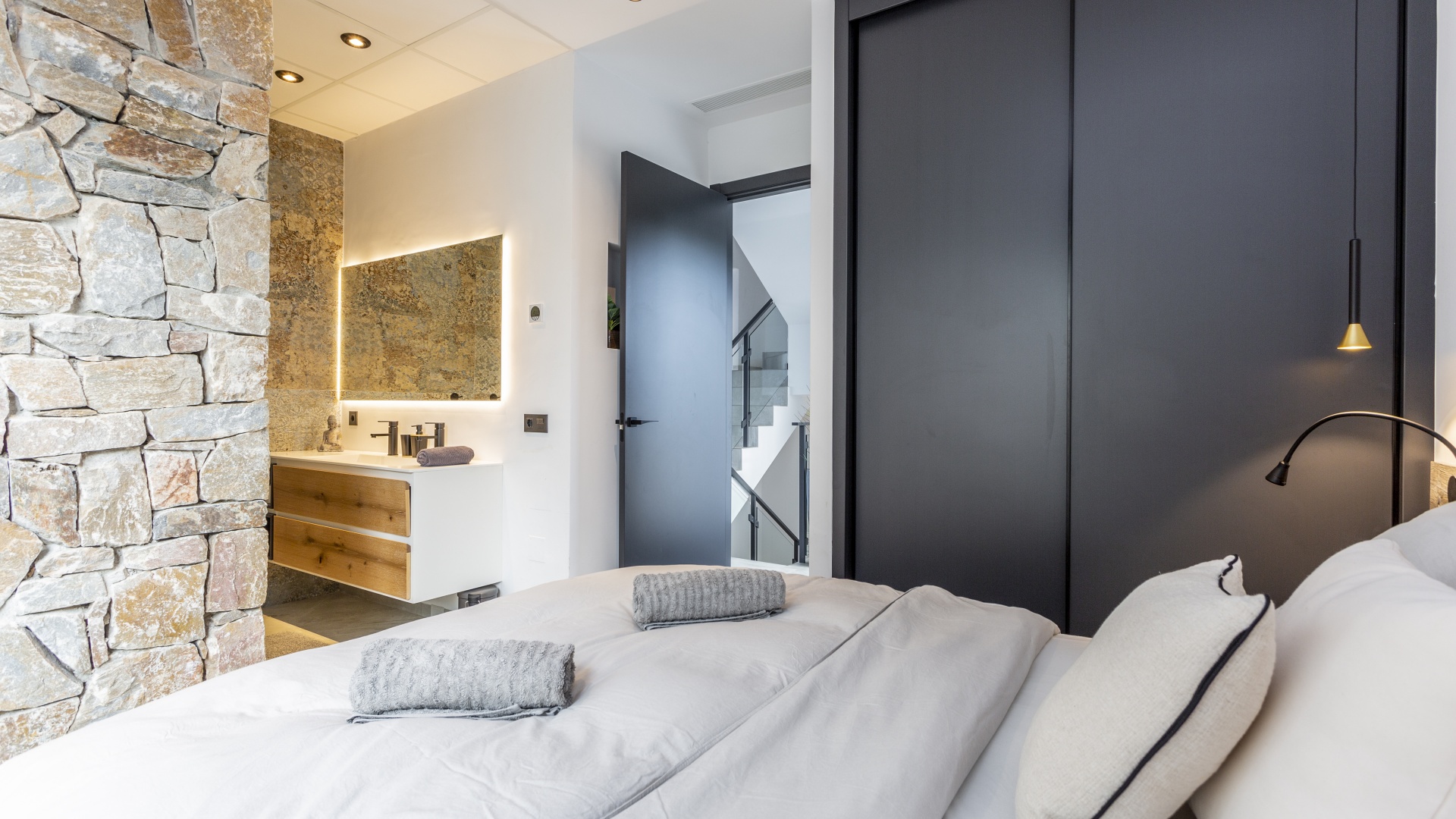 Boven vindt u nog twee slaapkamers, beide met een eigen badkamer. Een van de slaapkamers heeft ook een eigen balkon – een perfecte plek om uw dag te beginnen met een kopje koffie terwijl u geniet van het uitzicht. De hoofdslaapkamer, ook op deze verdieping, biedt een rustig toevluchtsoord met veel opbergruimte.