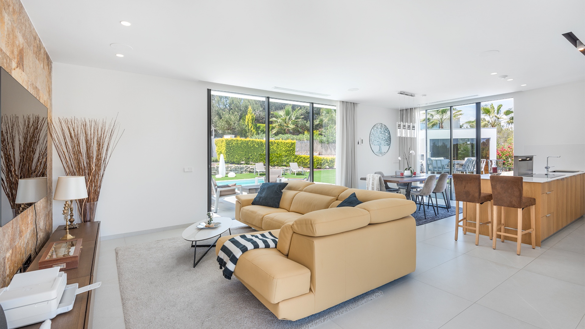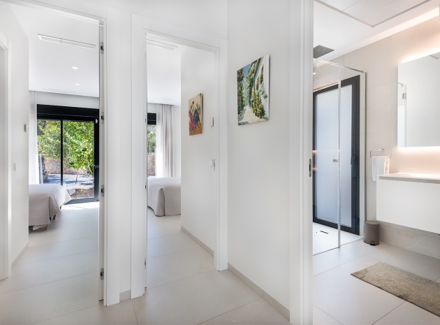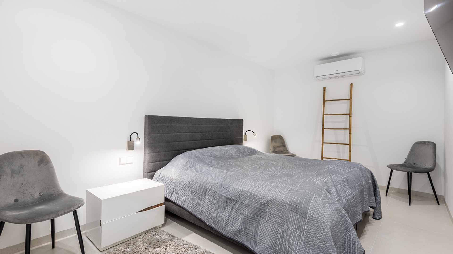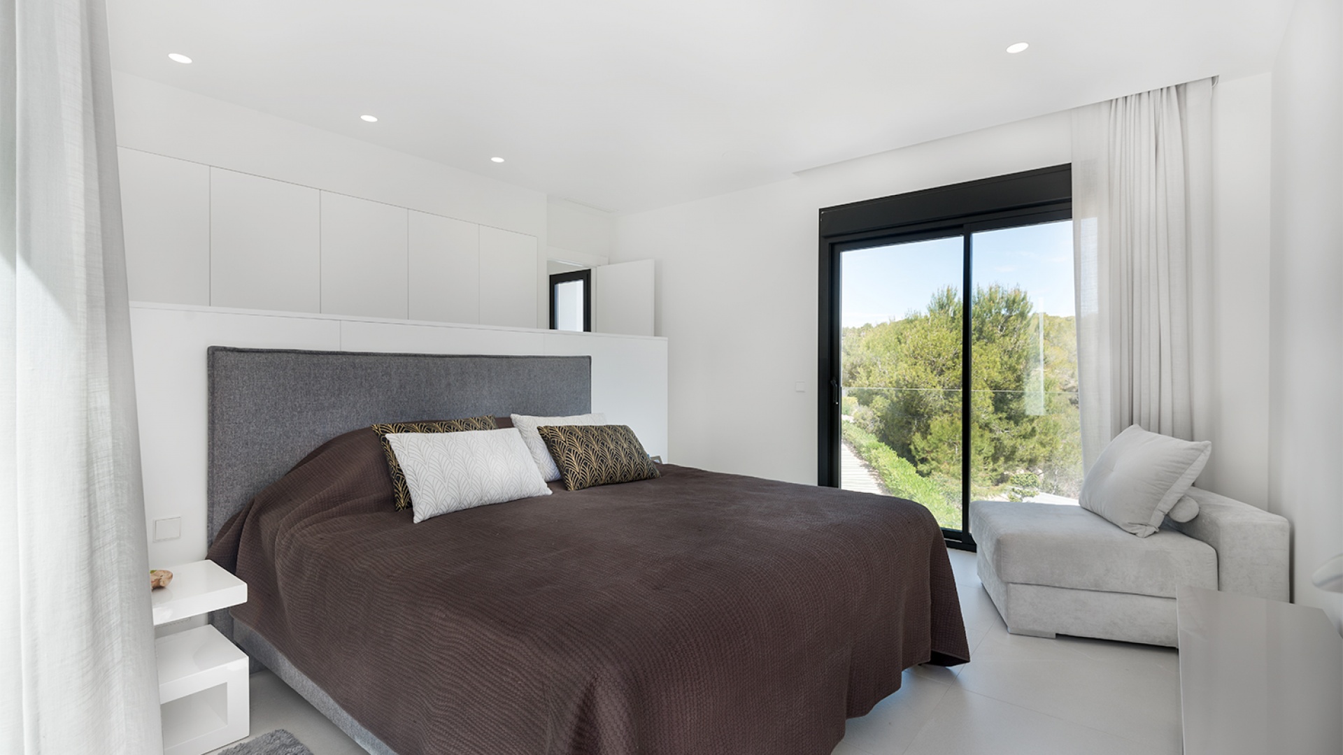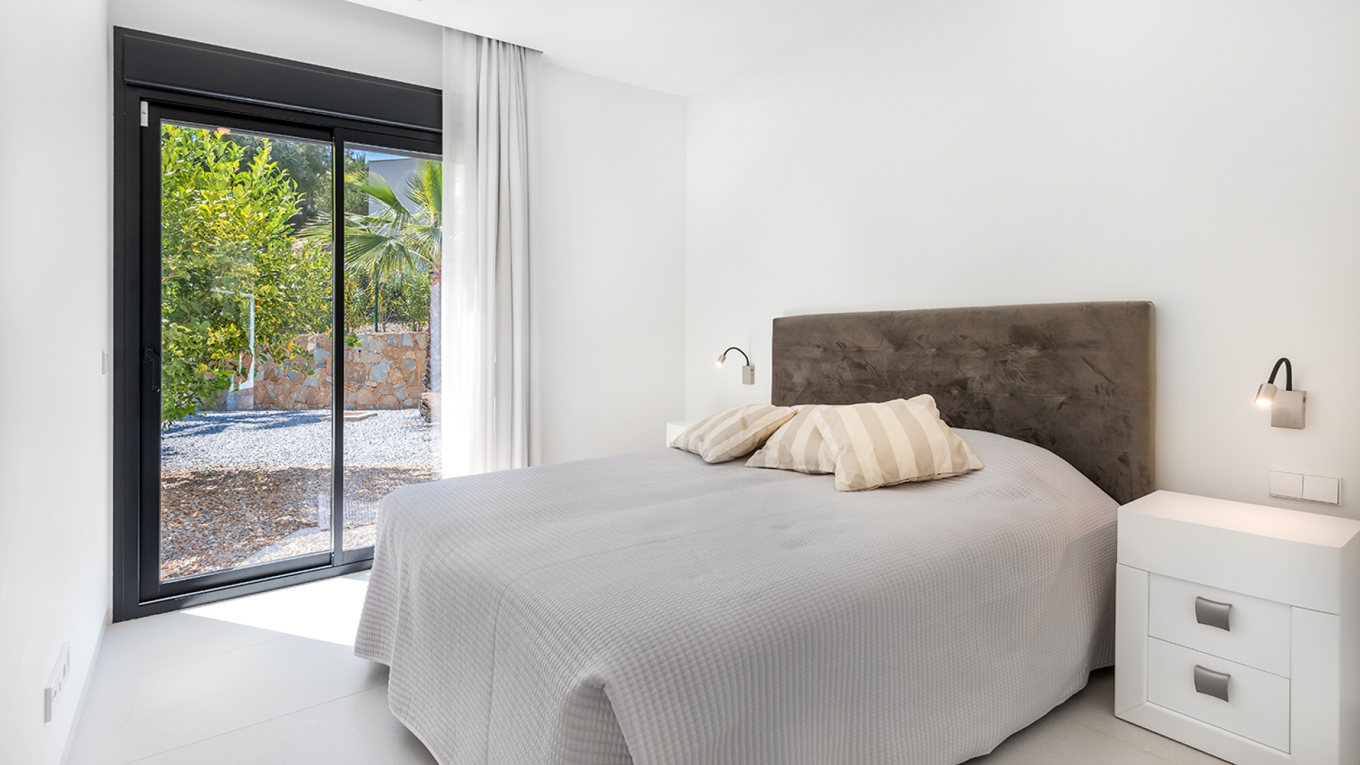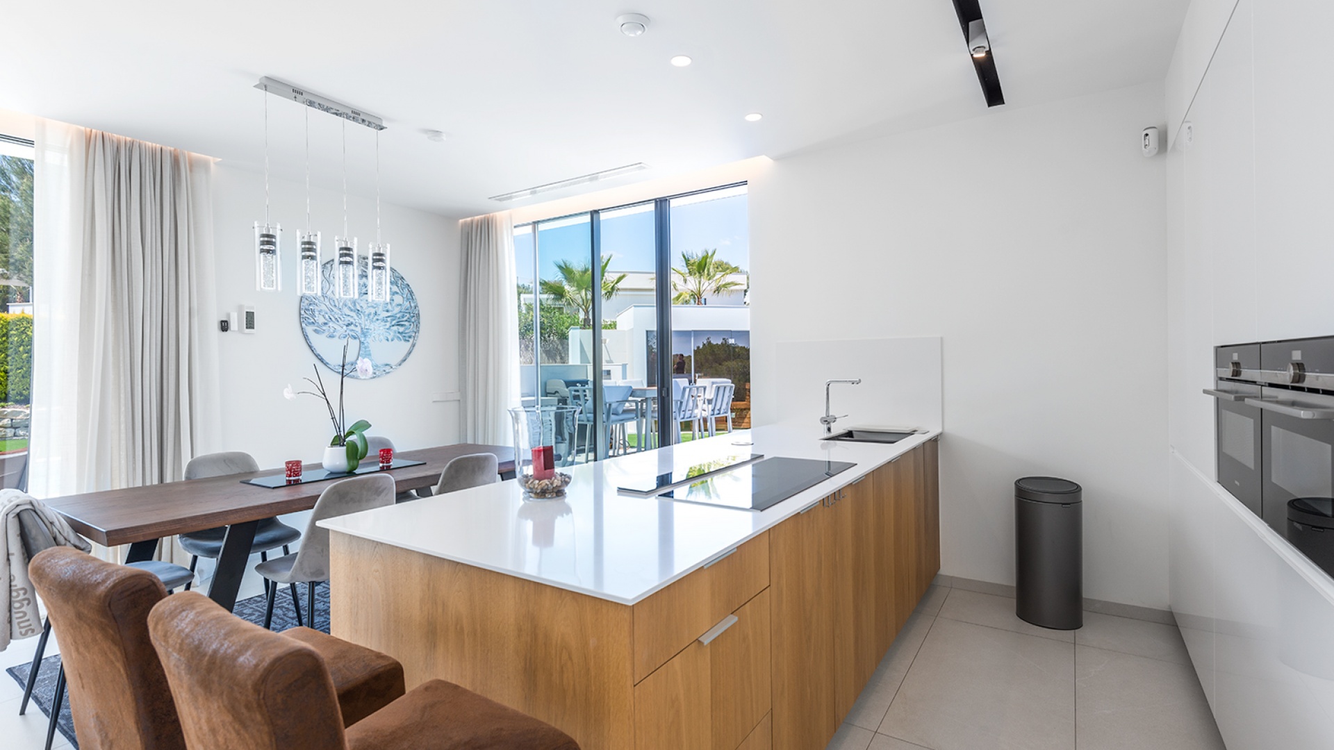 Binnen omarmt de villa een sereen Scandinavisch design met een open keuken, woon- en eetgedeelte. De begane grond heeft drie slaapkamers, elk met een eigen badkamer en directe toegang tot de tuin, wat zorgt voor ultiem comfort. Vloerverwarming draagt bij aan de luxe.