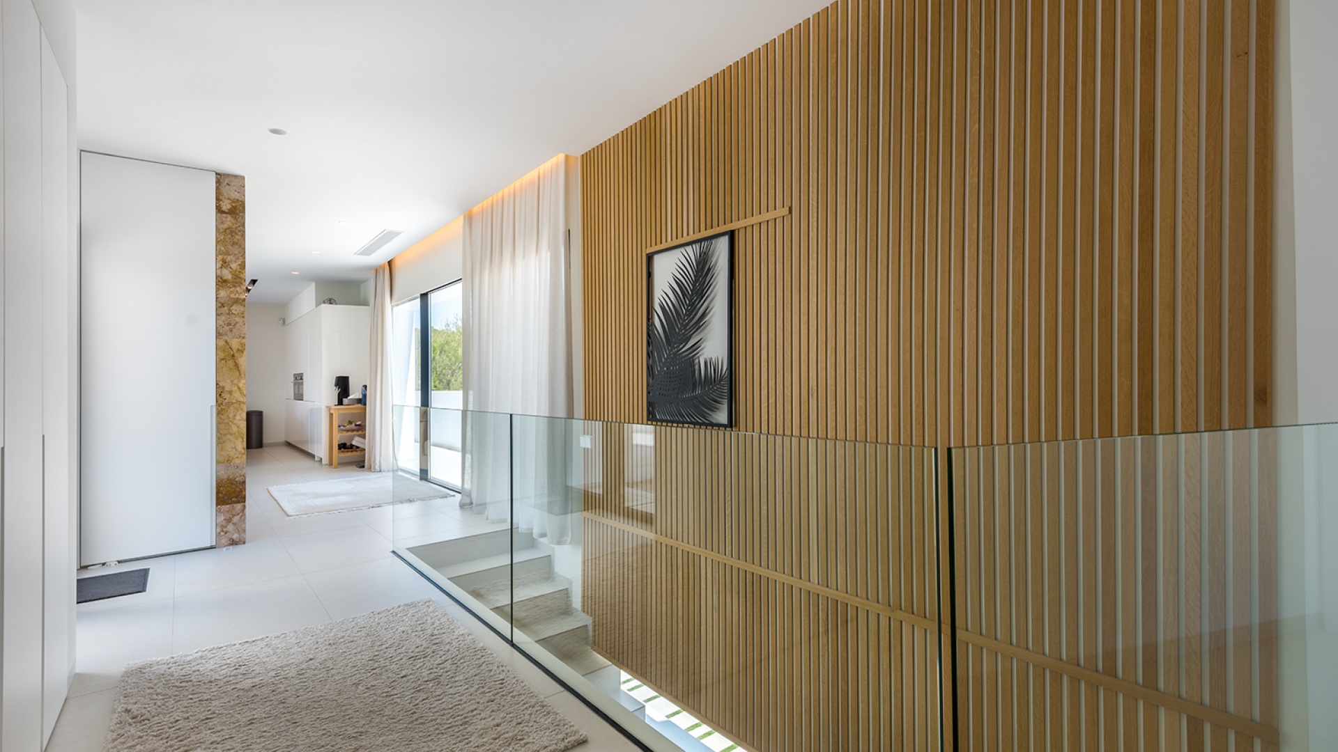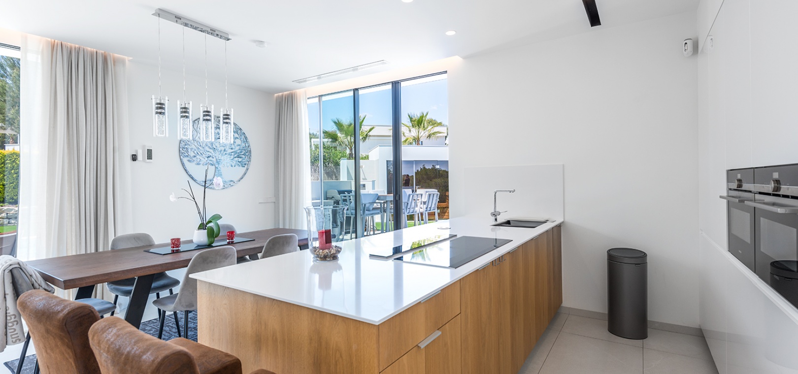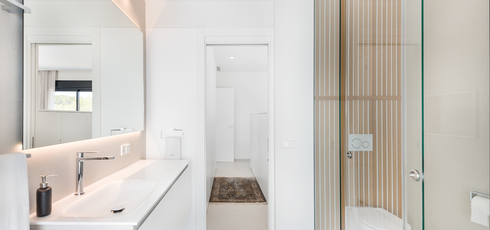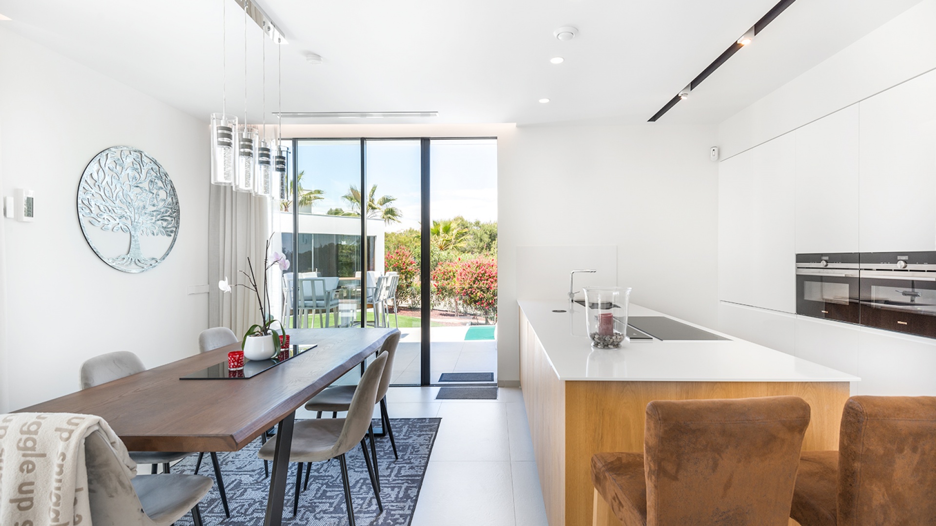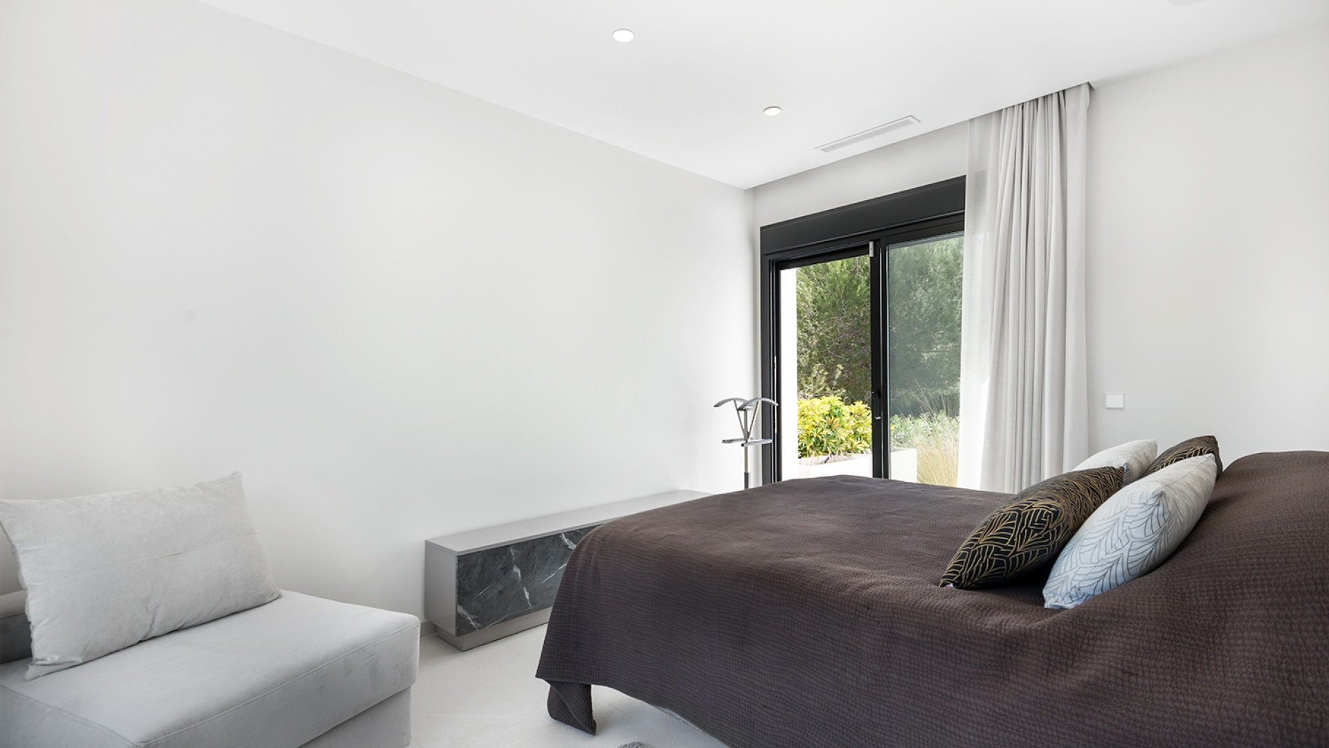 Binnen omarmt de villa een sereen Scandinavisch design met een open keuken, woon- en eetgedeelte. De begane grond heeft drie slaapkamers, elk met een eigen badkamer en directe toegang tot de tuin, wat zorgt voor ultiem comfort. Vloerverwarming draagt bij aan de luxe.