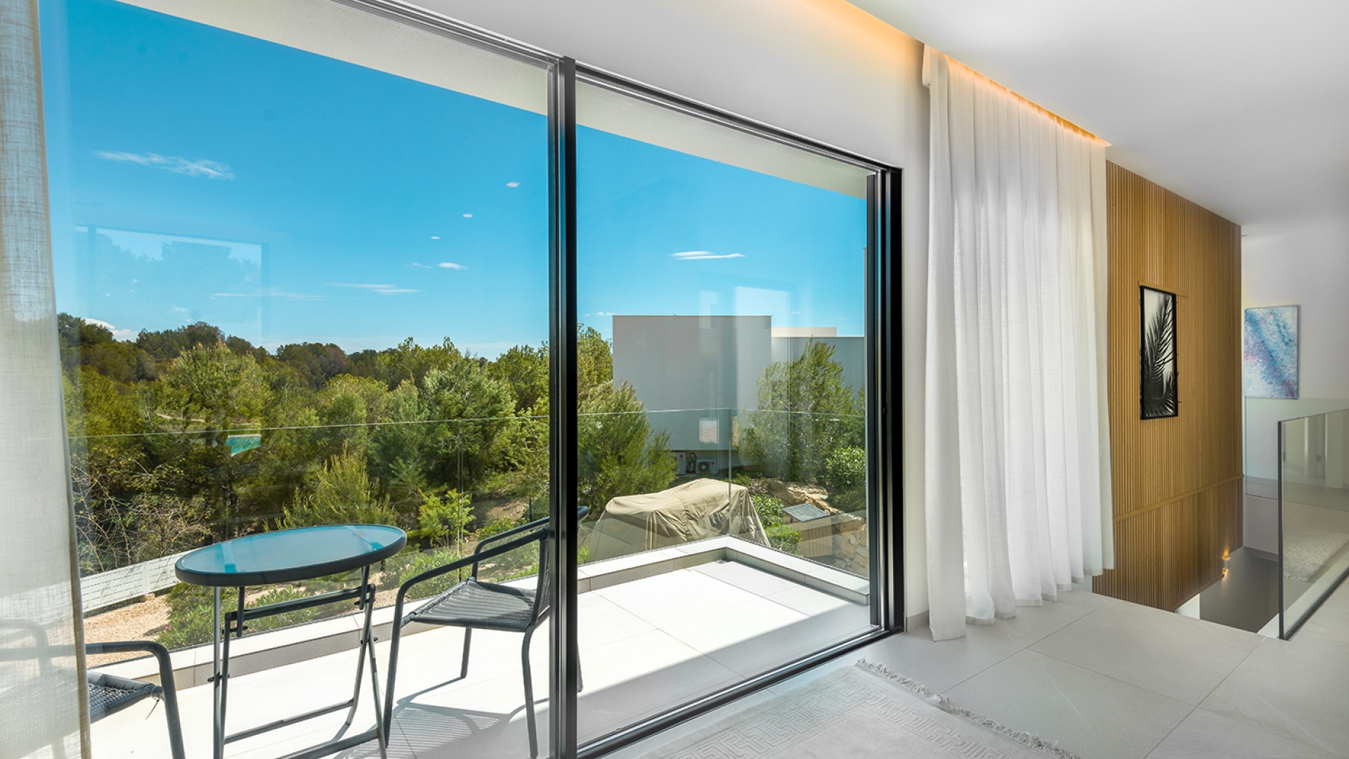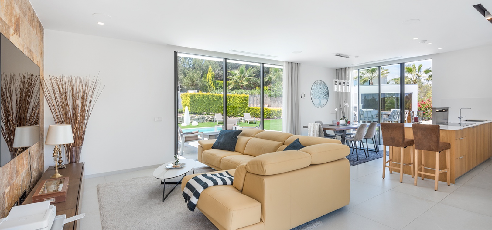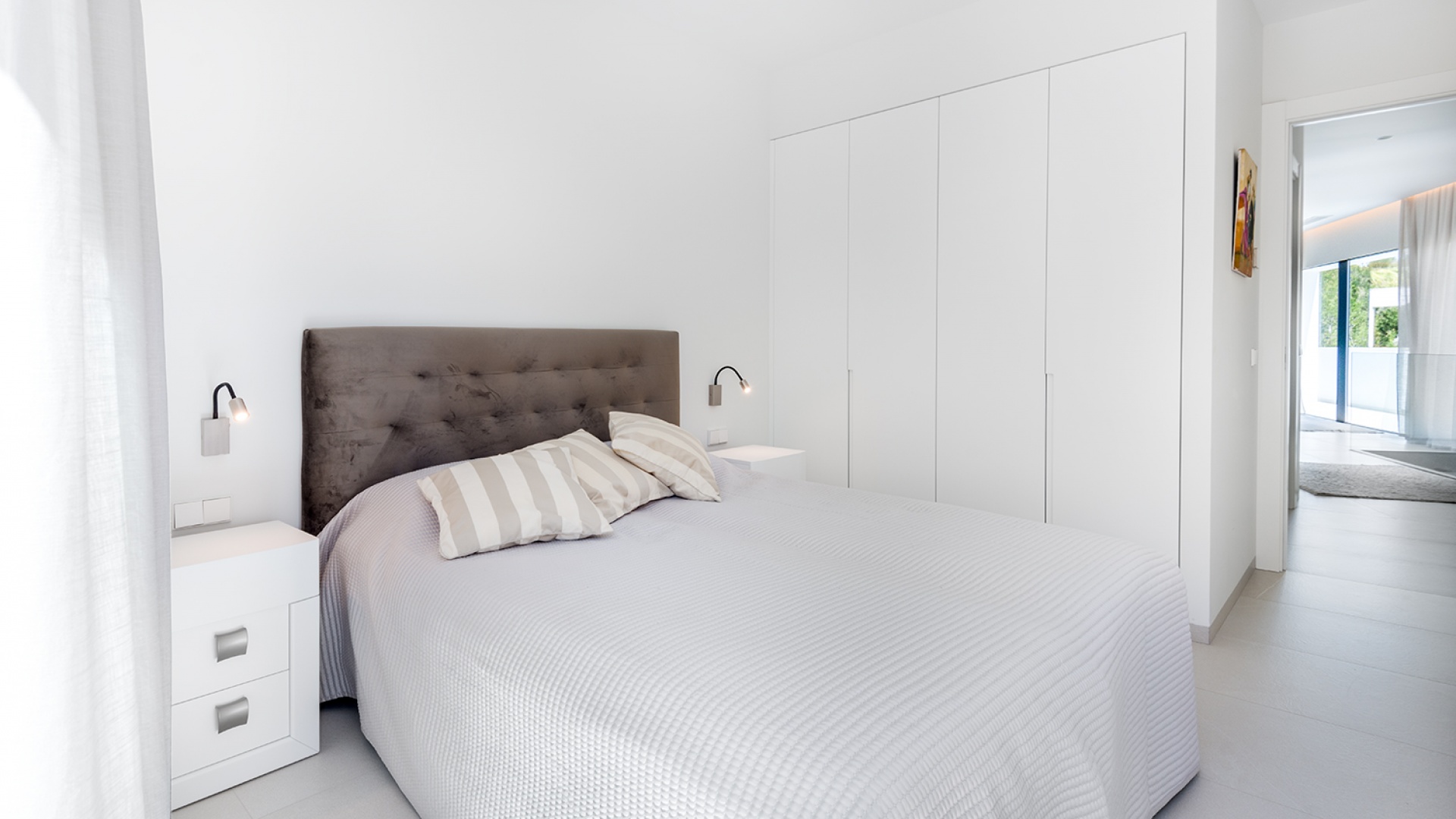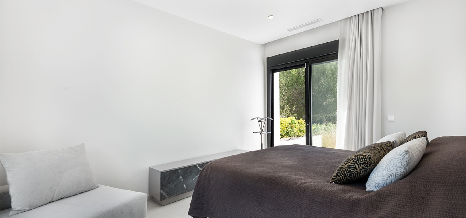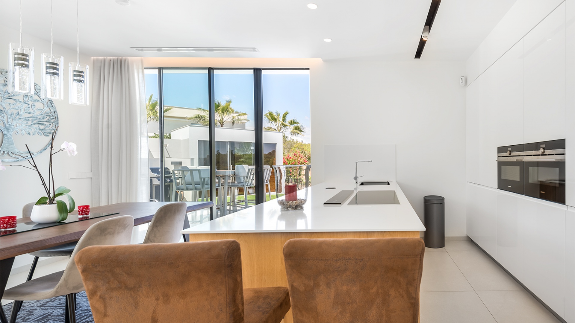 Binnen omarmt de villa een sereen Scandinavisch design met een open keuken, woon- en eetgedeelte. De begane grond heeft drie slaapkamers, elk met een eigen badkamer en directe toegang tot de tuin, wat zorgt voor ultiem comfort. Vloerverwarming draagt bij aan de luxe.