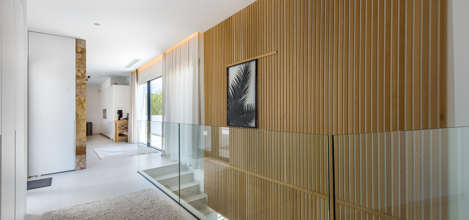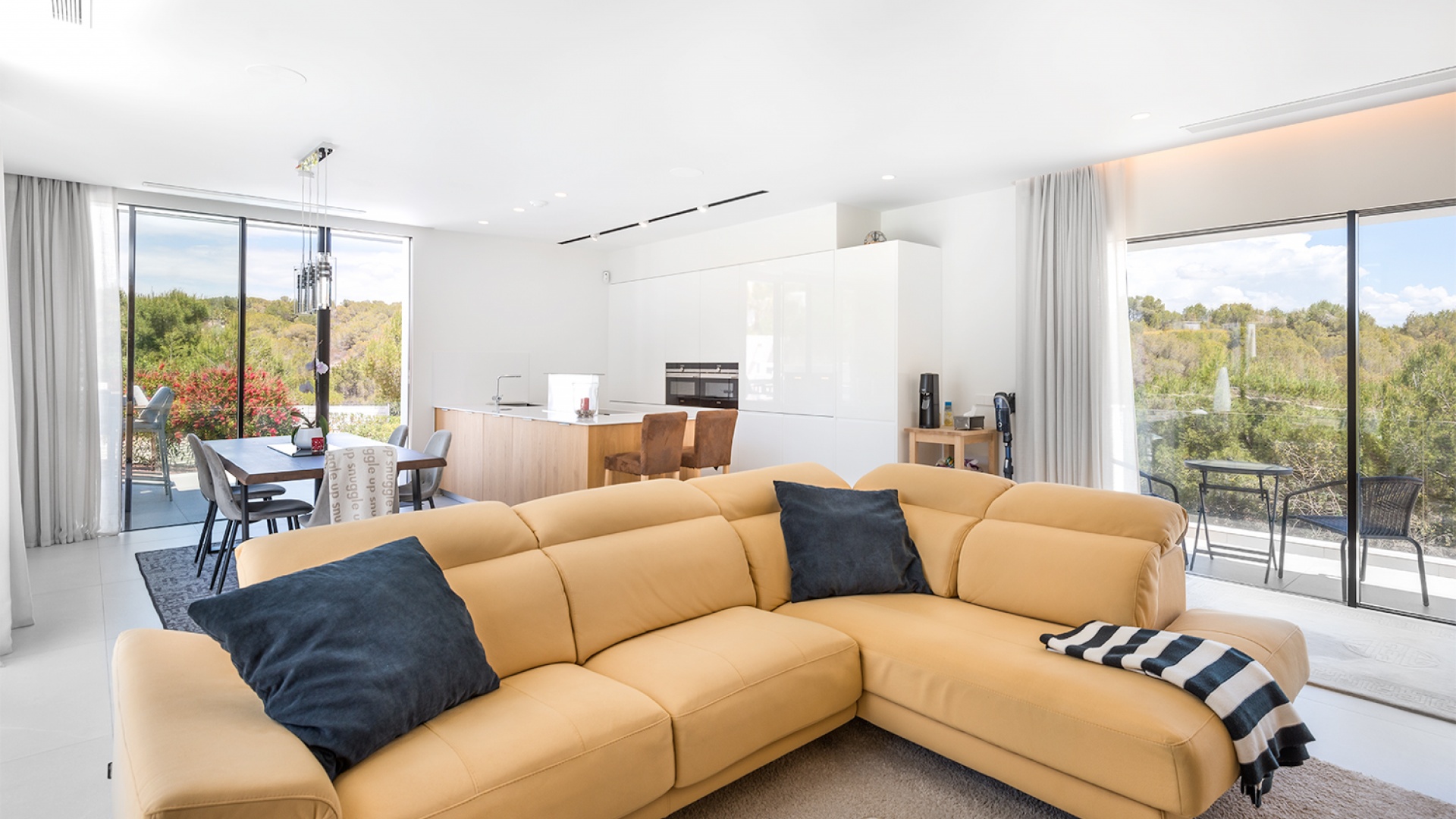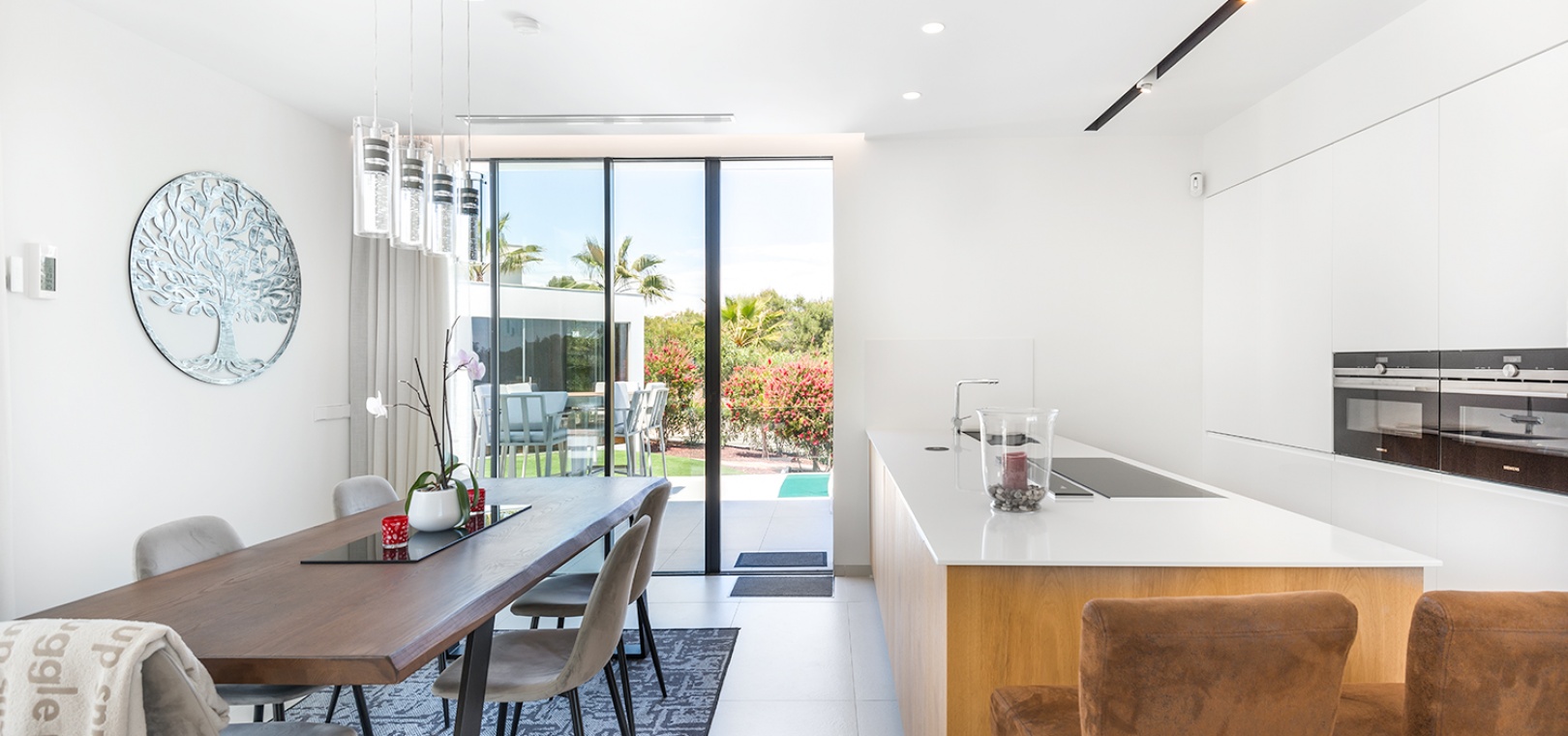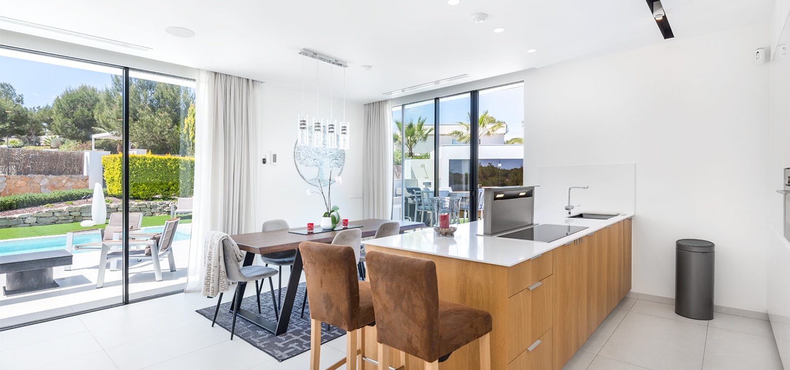 Binnen omarmt de villa een sereen Scandinavisch design met een open keuken, woon- en eetgedeelte. De begane grond heeft drie slaapkamers, elk met een eigen badkamer en directe toegang tot de tuin, wat zorgt voor ultiem comfort. Vloerverwarming draagt bij aan de luxe.