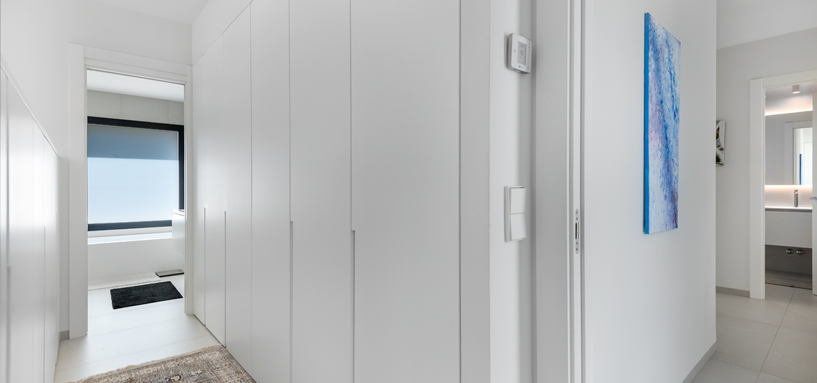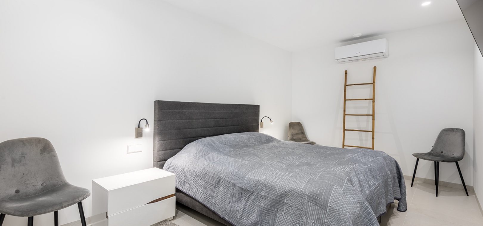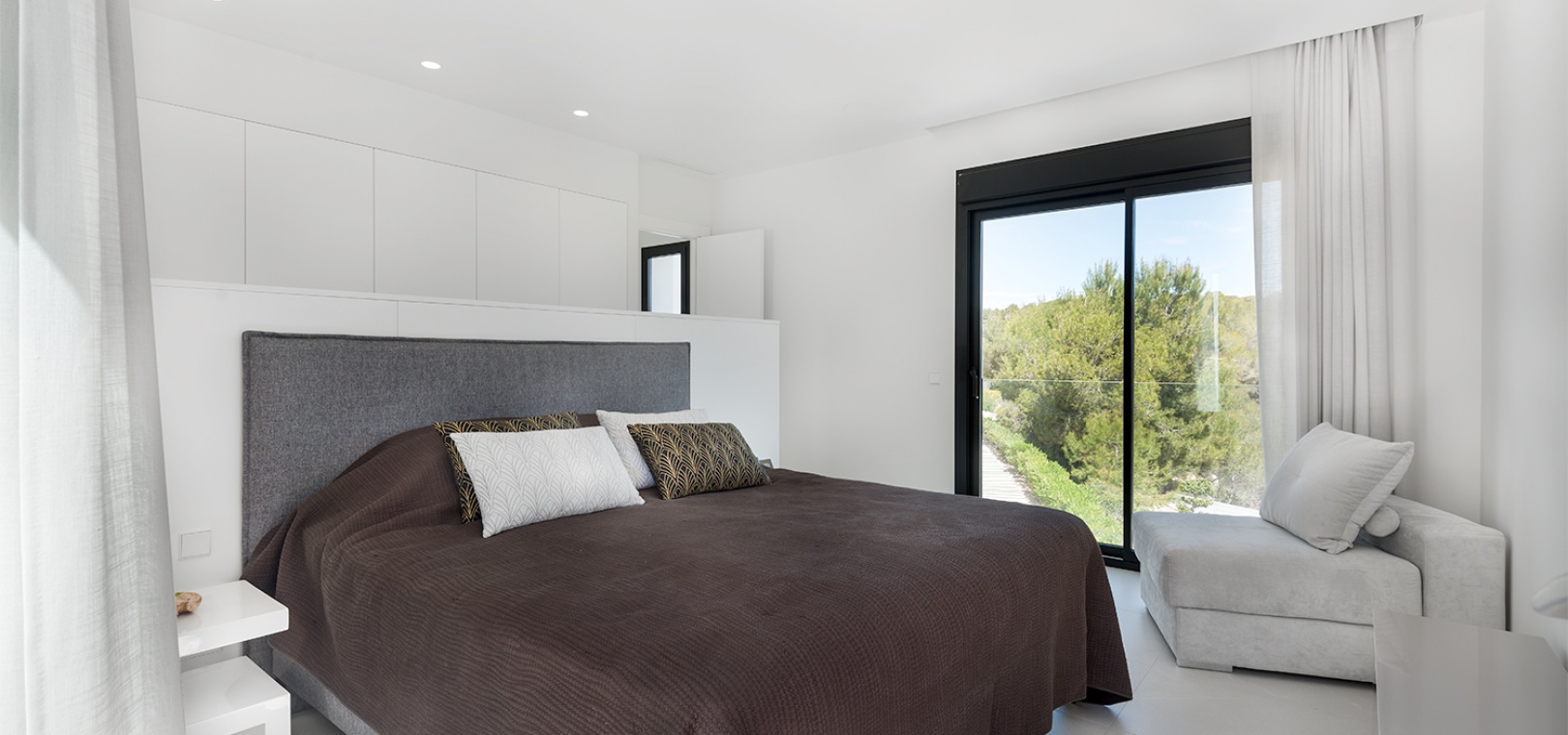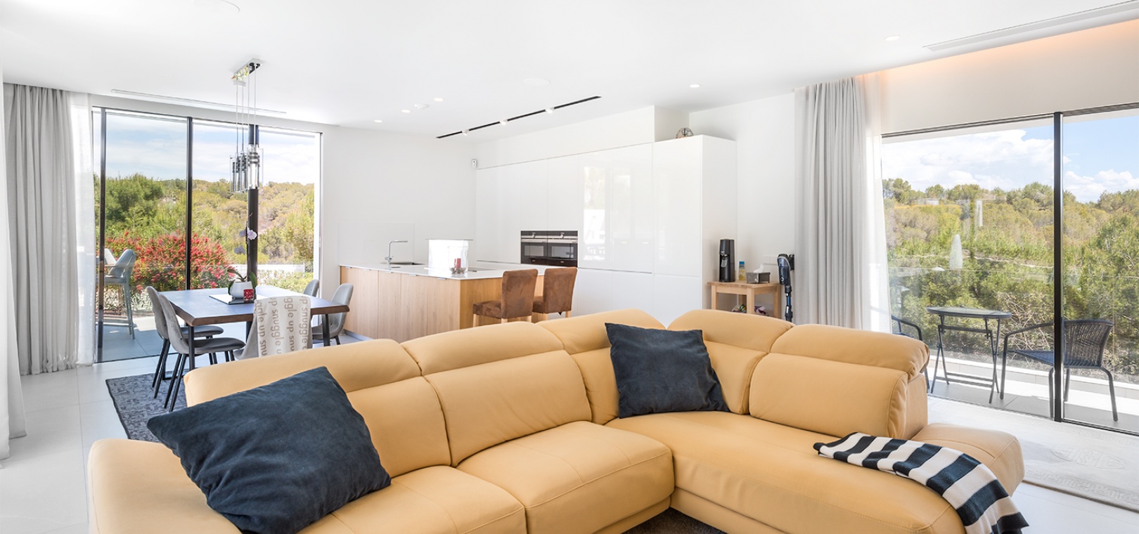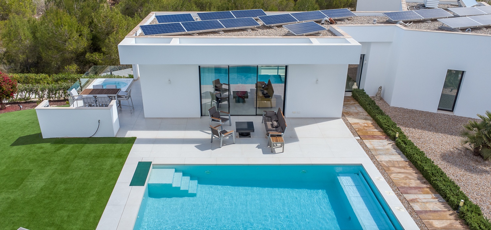 Binnen omarmt de villa een sereen Scandinavisch design met een open keuken, woon- en eetgedeelte. De begane grond heeft drie slaapkamers, elk met een eigen badkamer en directe toegang tot de tuin, wat zorgt voor ultiem comfort. Vloerverwarming draagt bij aan de luxe.