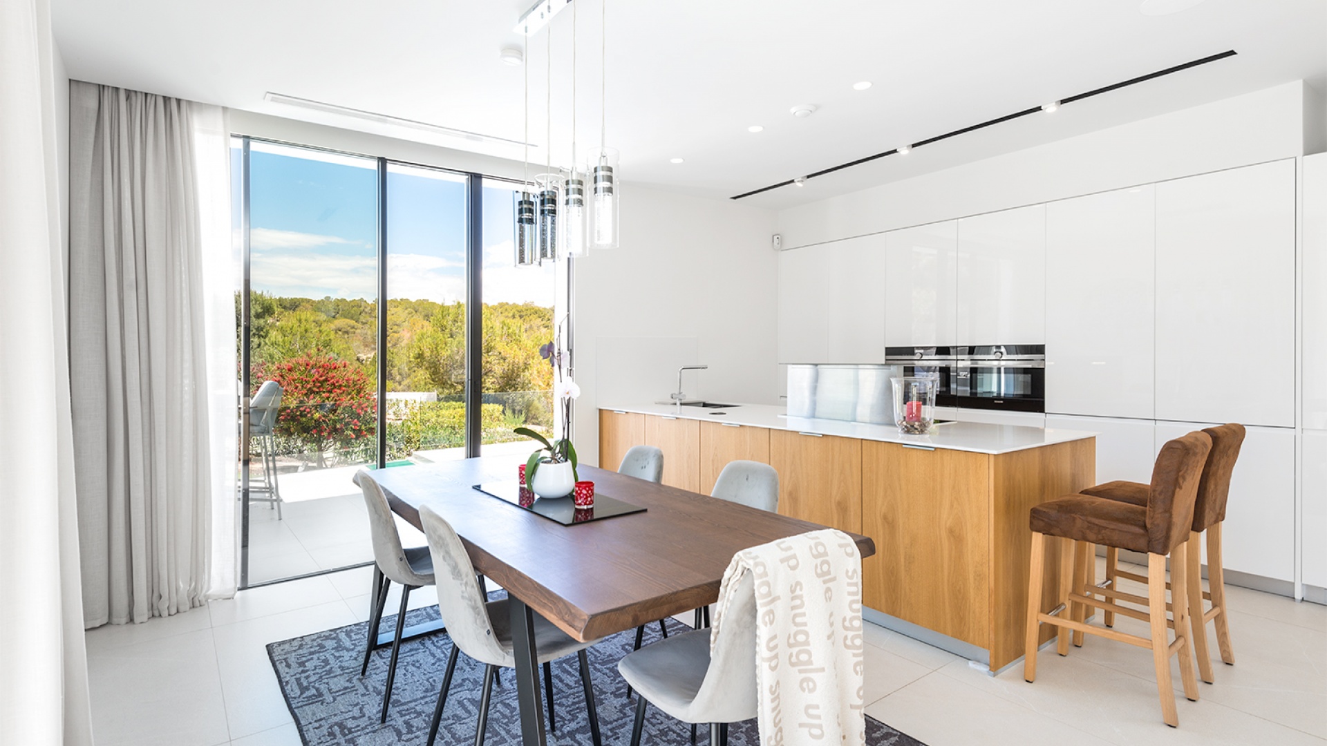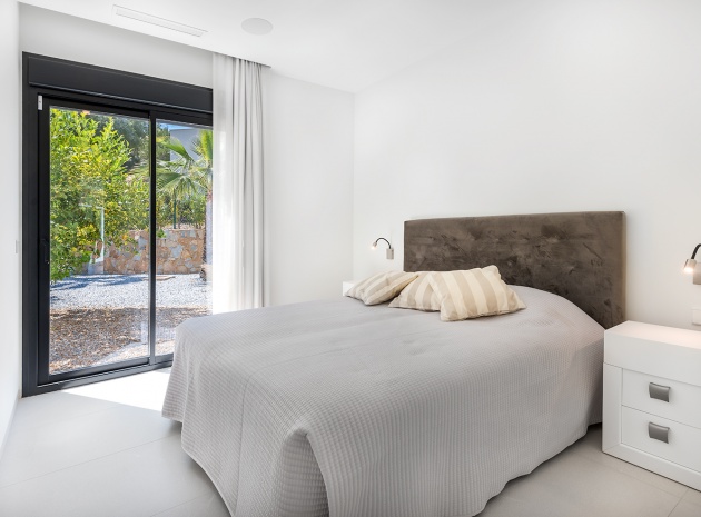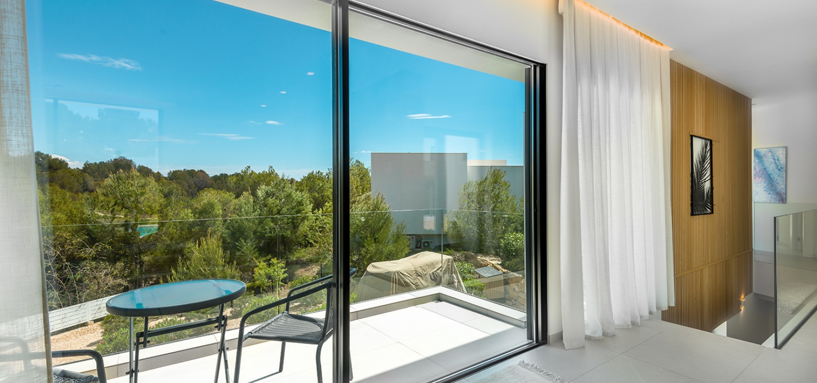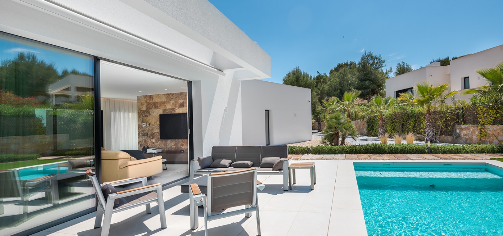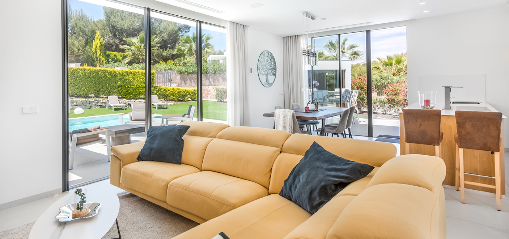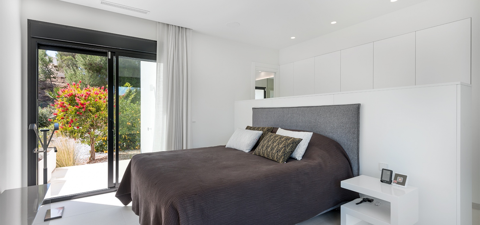 Binnen omarmt de villa een sereen Scandinavisch design met een open keuken, woon- en eetgedeelte. De begane grond heeft drie slaapkamers, elk met een eigen badkamer en directe toegang tot de tuin, wat zorgt voor ultiem comfort. Vloerverwarming draagt bij aan de luxe.