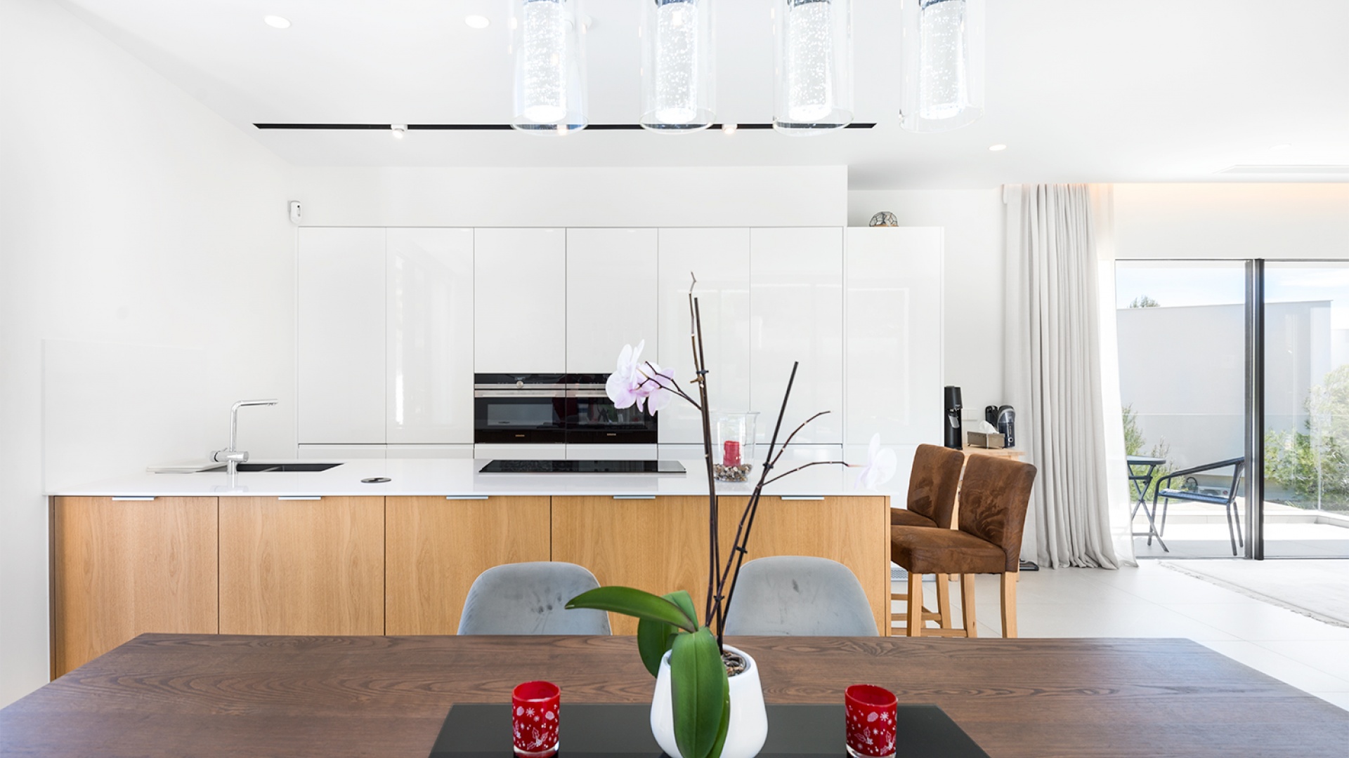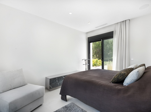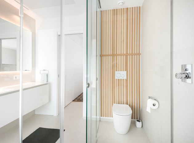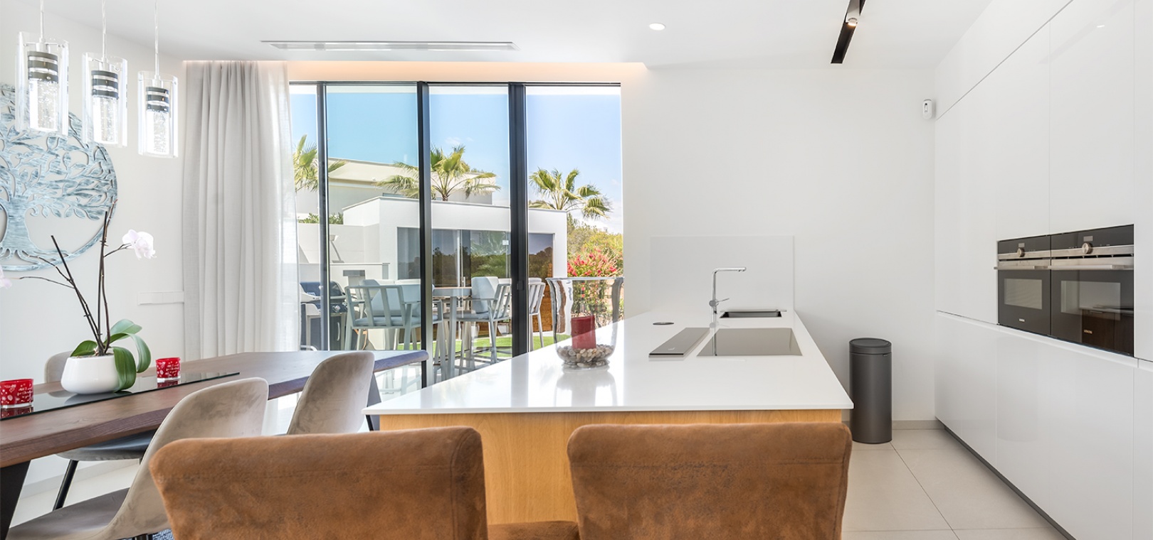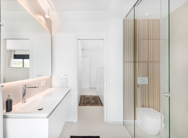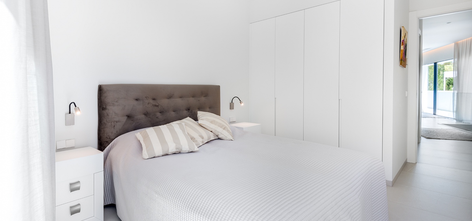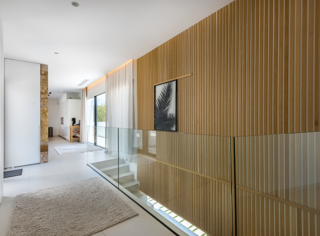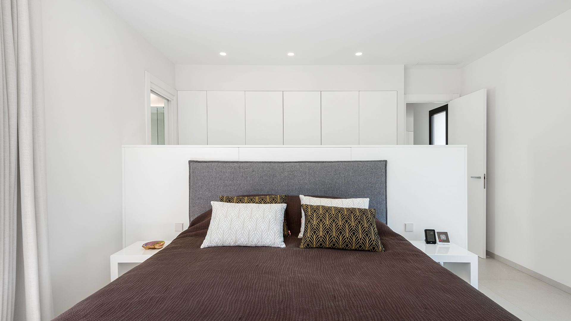 Binnen omarmt de villa een sereen Scandinavisch design met een open keuken, woon- en eetgedeelte. De begane grond heeft drie slaapkamers, elk met een eigen badkamer en directe toegang tot de tuin, wat zorgt voor ultiem comfort. Vloerverwarming draagt bij aan de luxe.