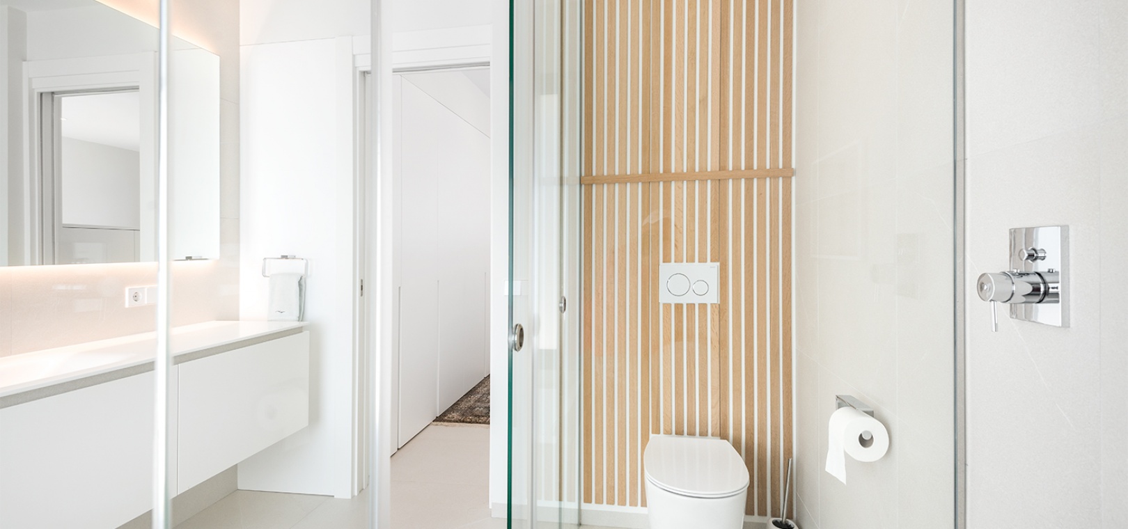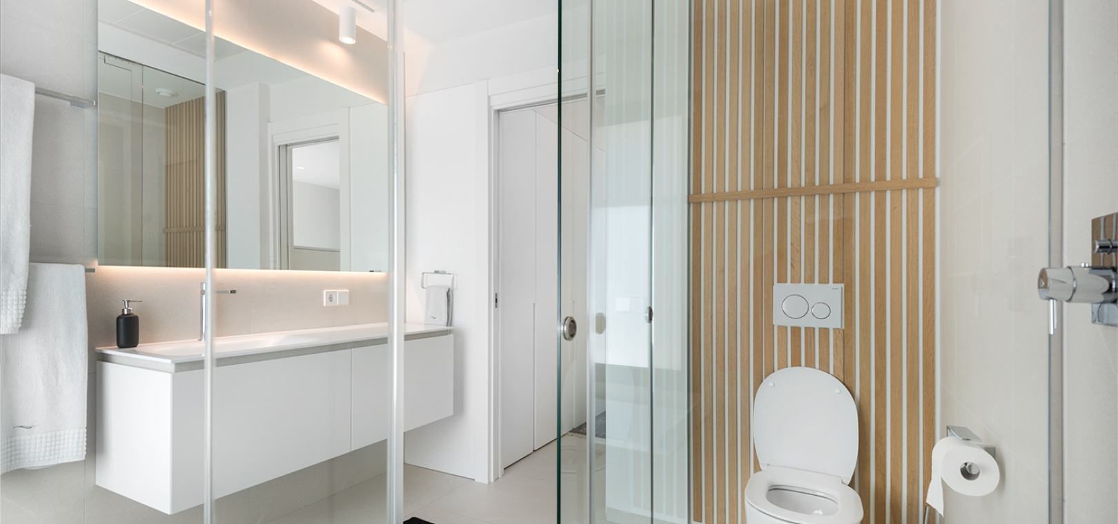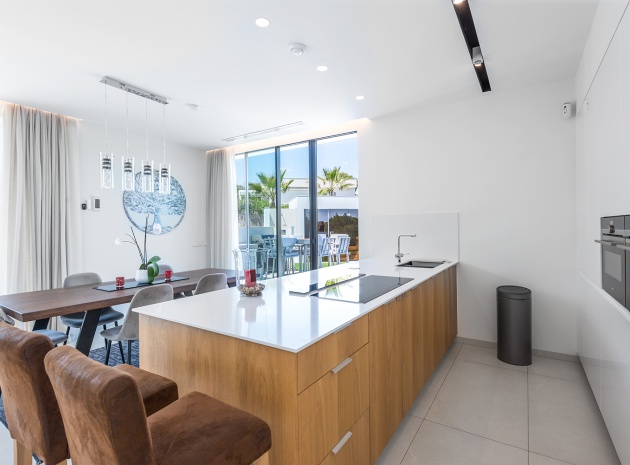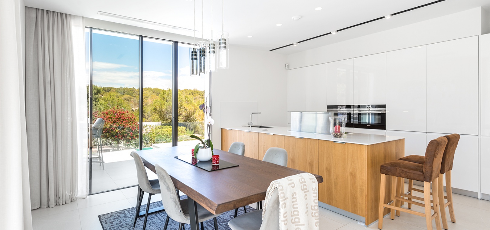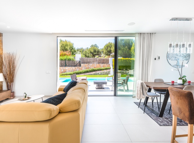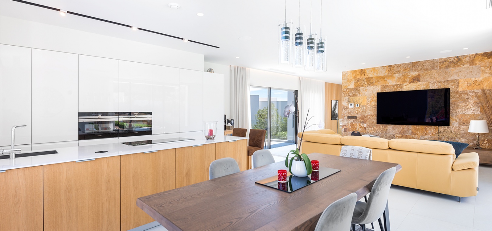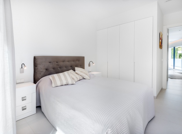 Binnen omarmt de villa een sereen Scandinavisch design met een open keuken, woon- en eetgedeelte. De begane grond heeft drie slaapkamers, elk met een eigen badkamer en directe toegang tot de tuin, wat zorgt voor ultiem comfort. Vloerverwarming draagt bij aan de luxe.
