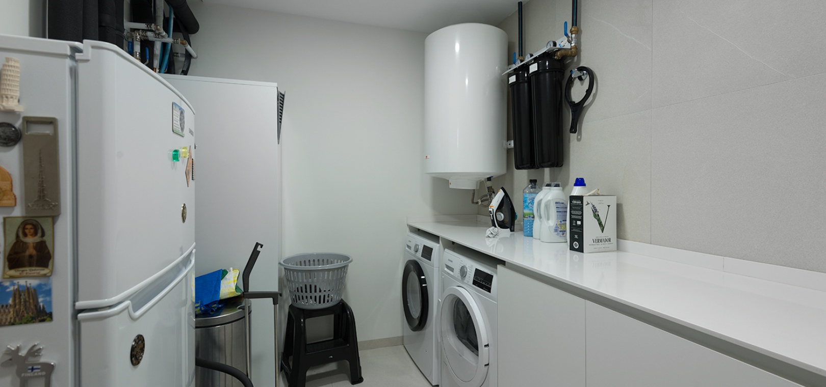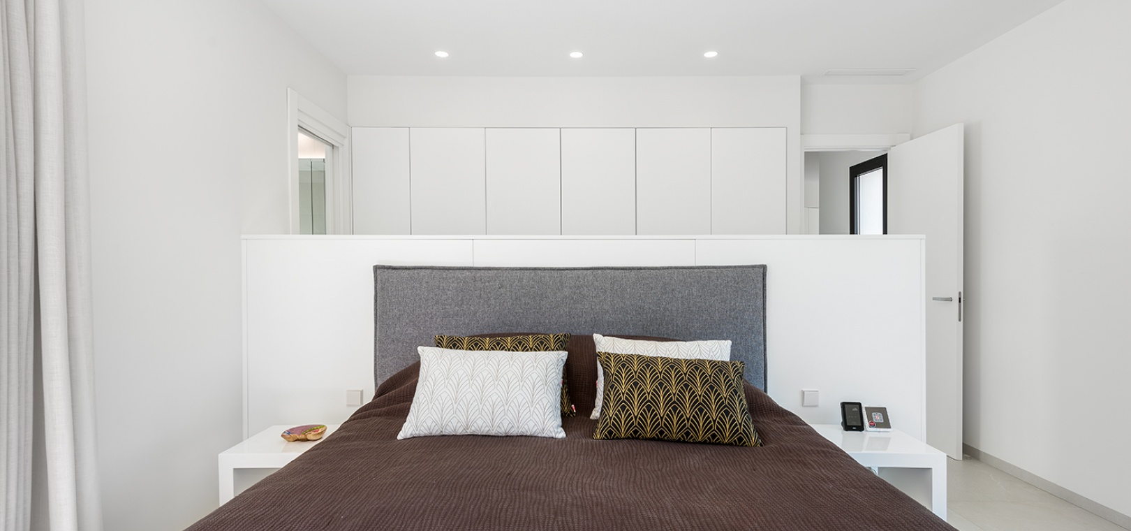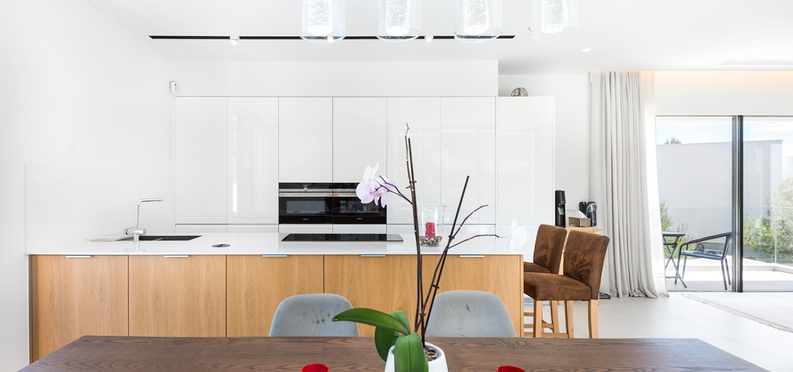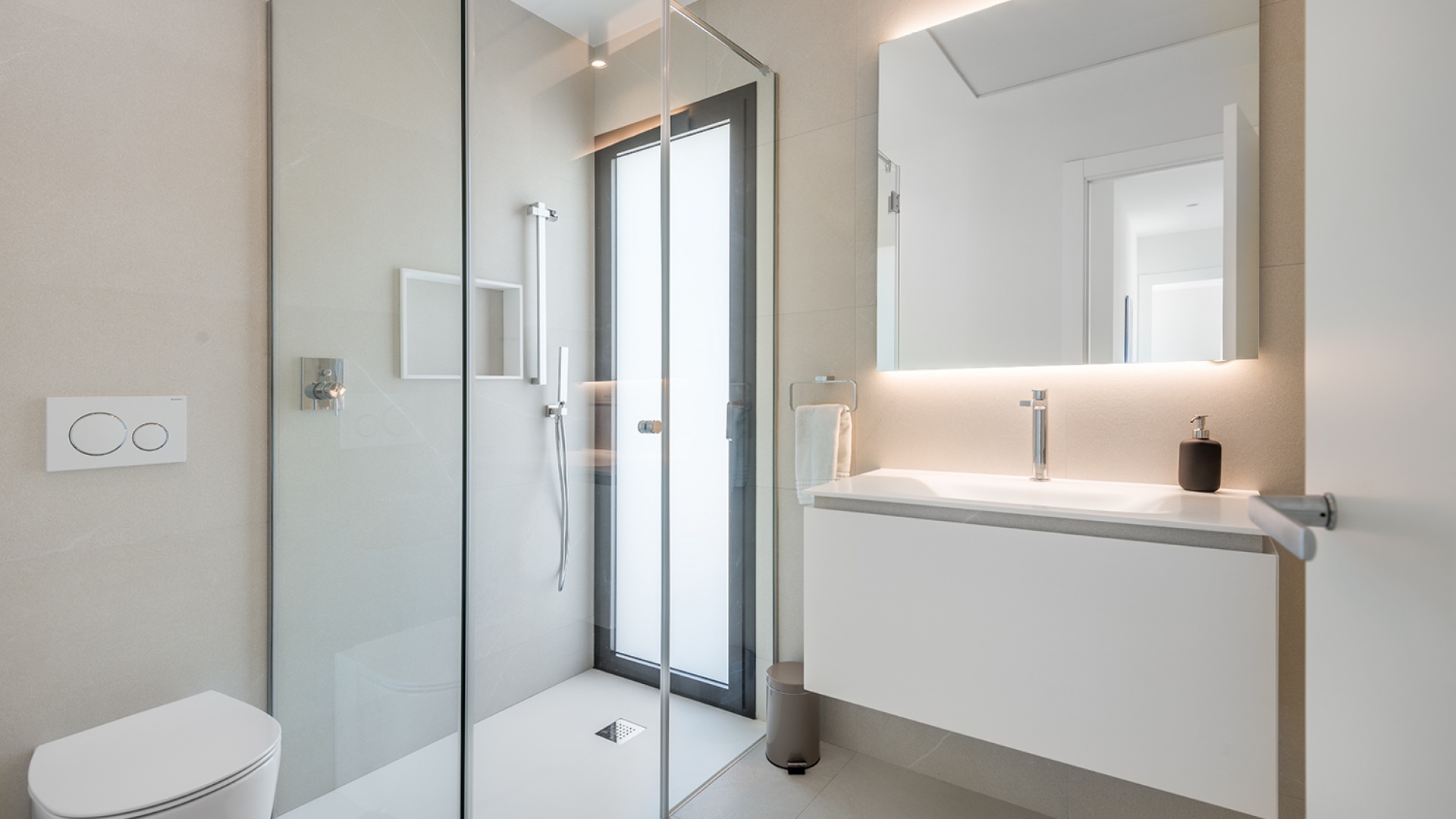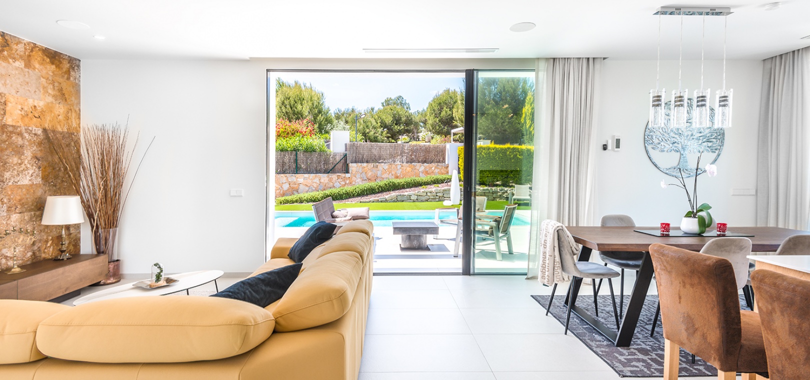 Binnen omarmt de villa een sereen Scandinavisch design met een open keuken, woon- en eetgedeelte. De begane grond heeft drie slaapkamers, elk met een eigen badkamer en directe toegang tot de tuin, wat zorgt voor ultiem comfort. Vloerverwarming draagt bij aan de luxe.