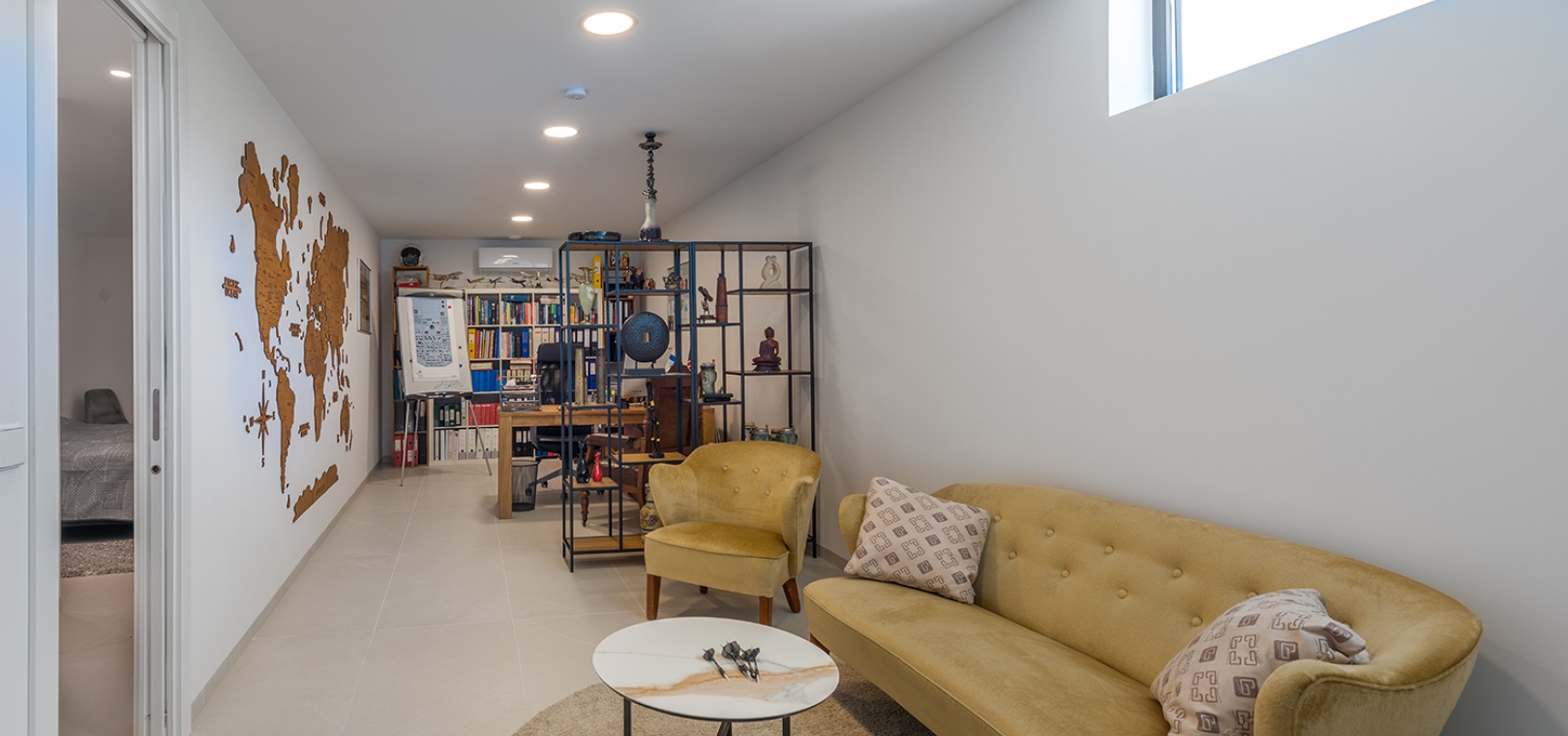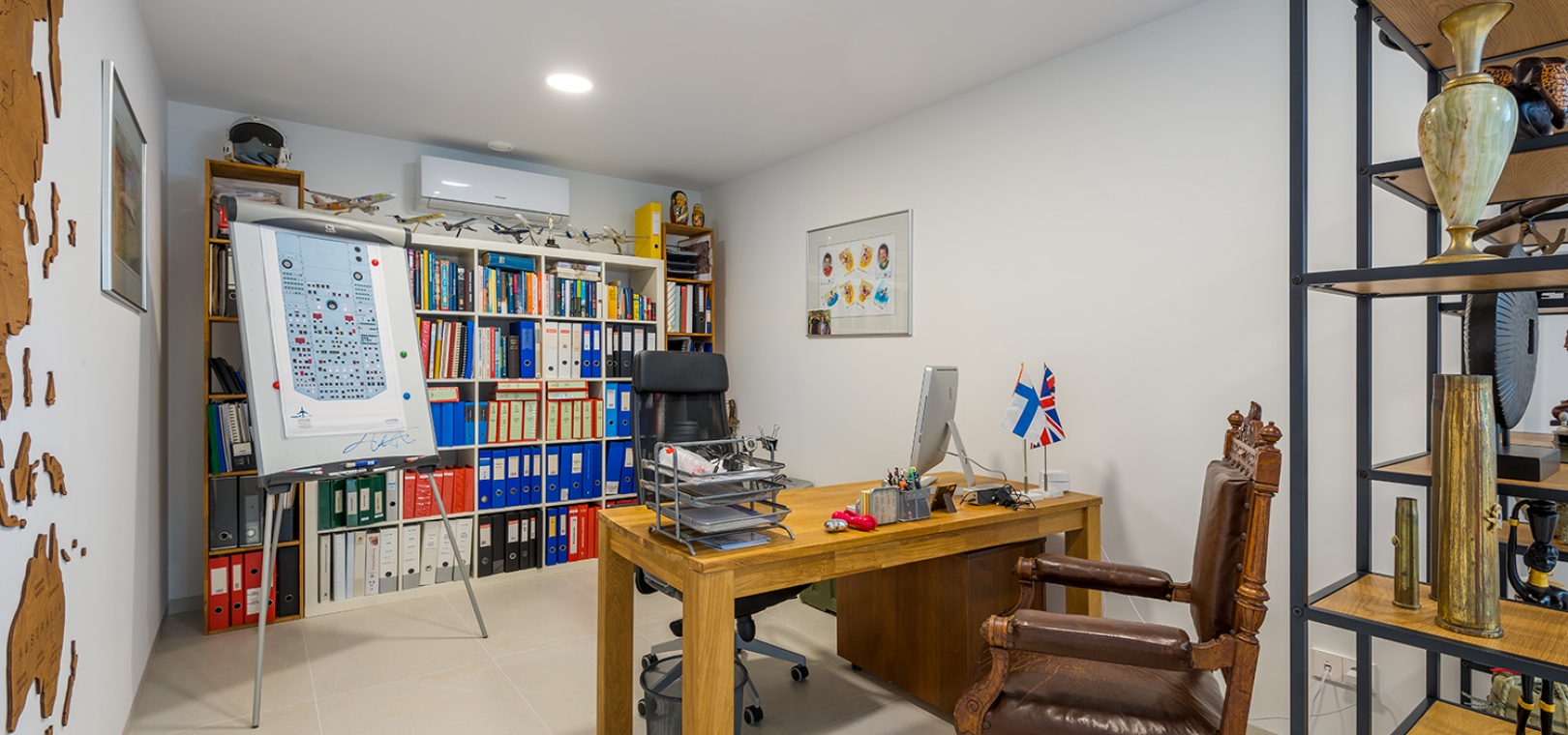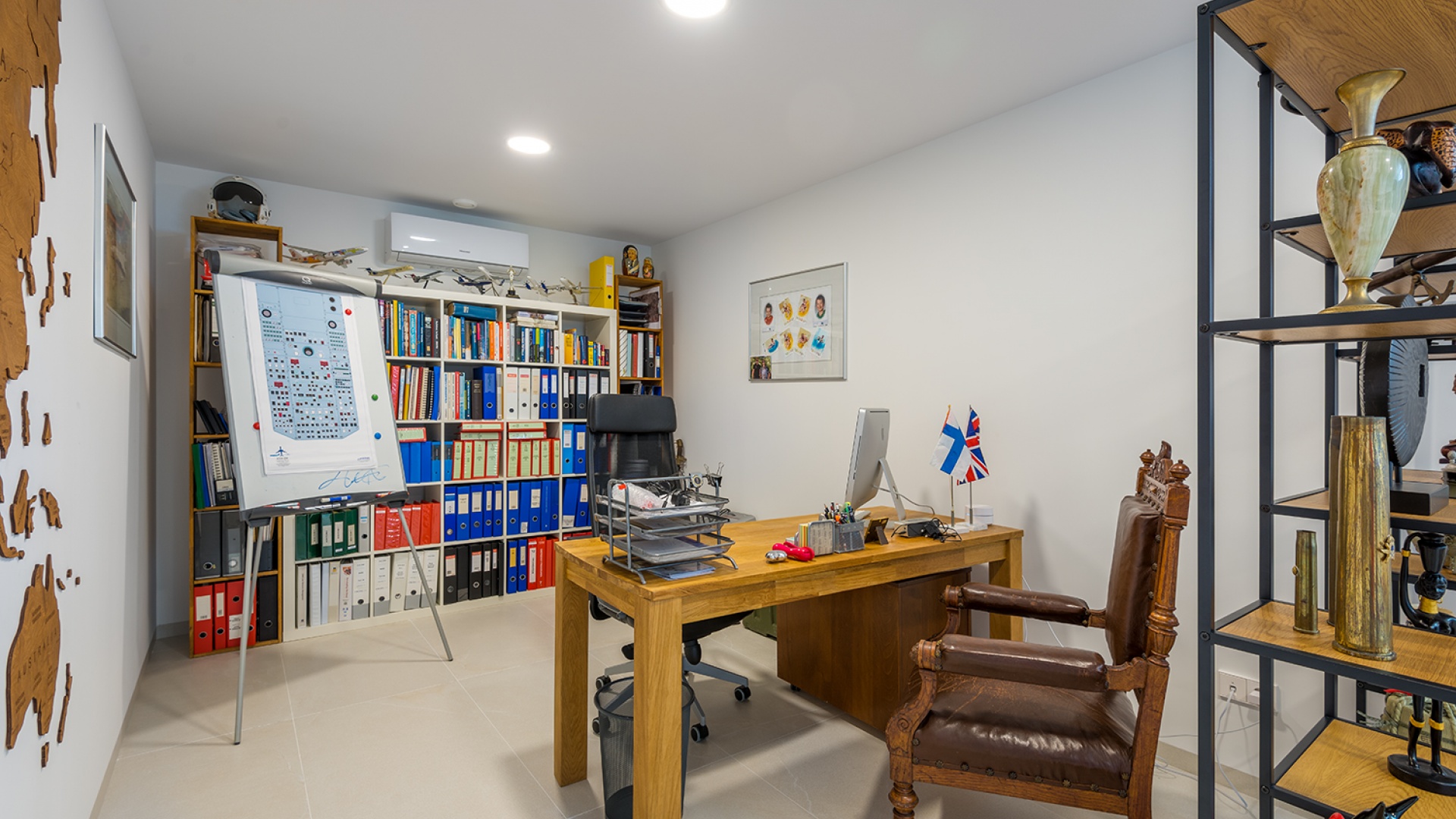 Op de benedenverdieping bevinden zich een groot kantoor, een bijkeuken, een extra slaapkamer met inloopkast en een ruime garage.