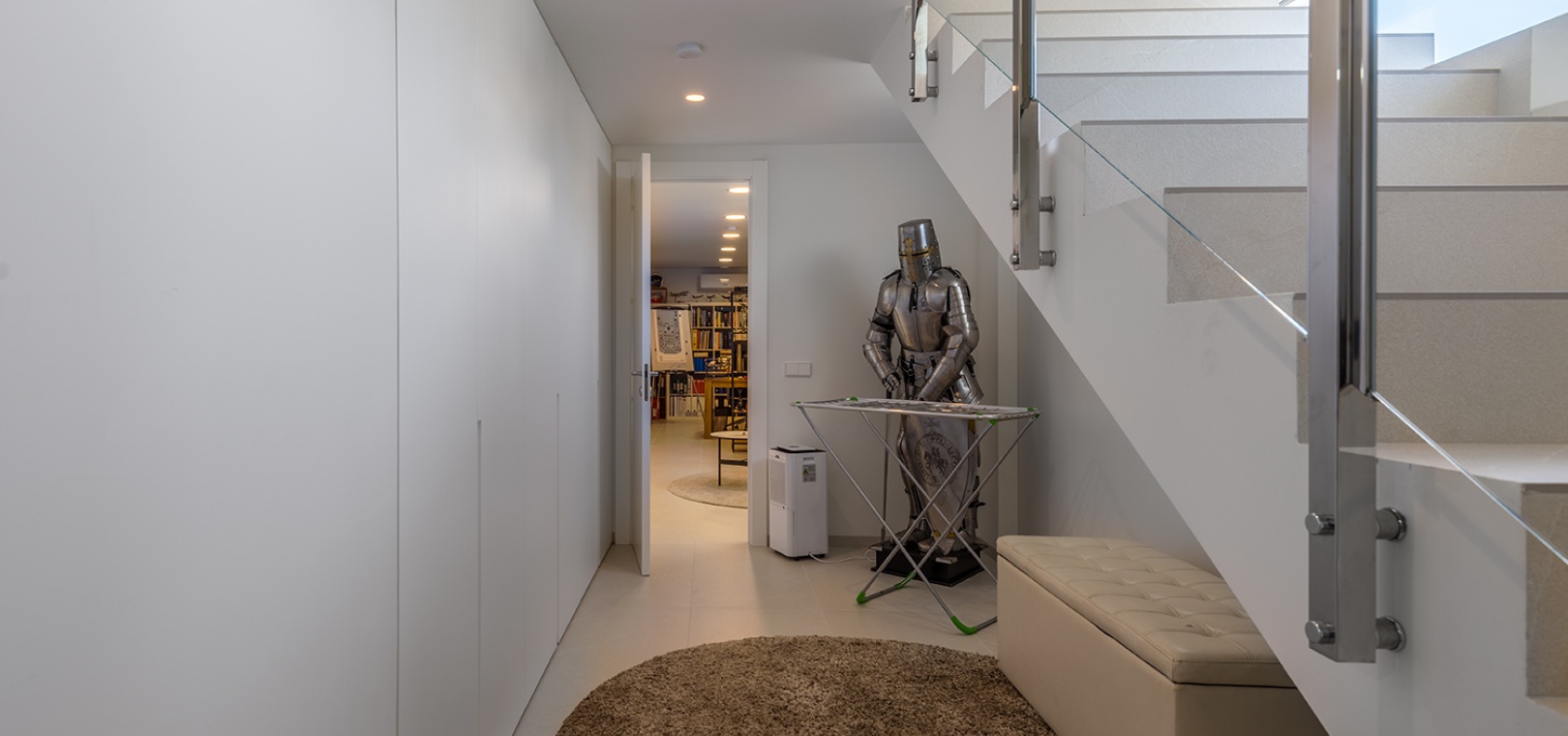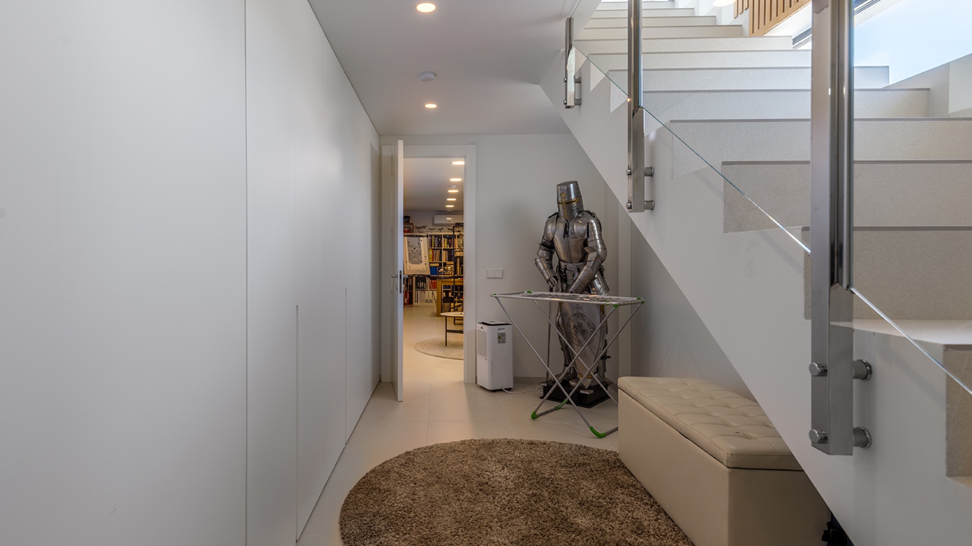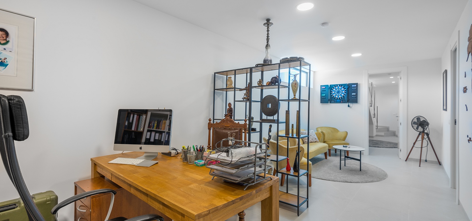 Op de benedenverdieping bevinden zich een groot kantoor, een bijkeuken, een extra slaapkamer met inloopkast en een ruime garage.