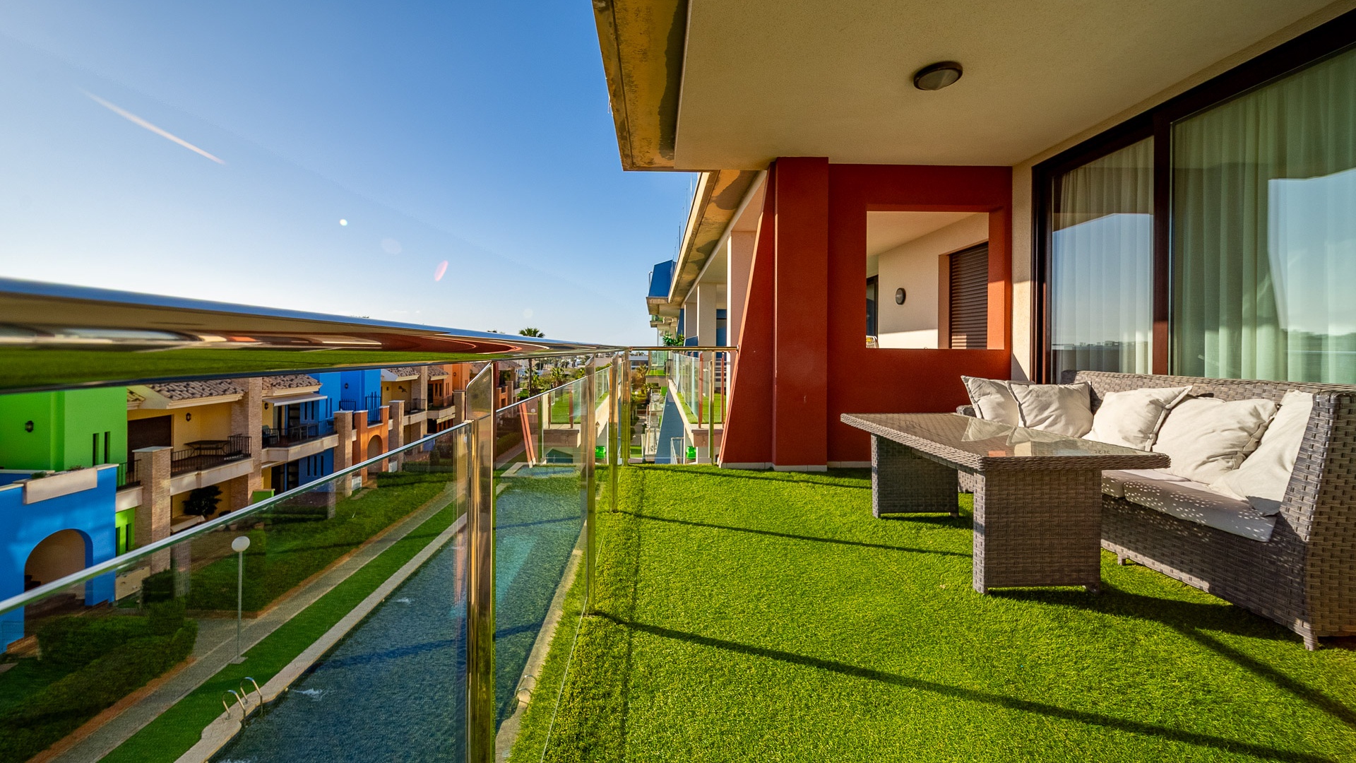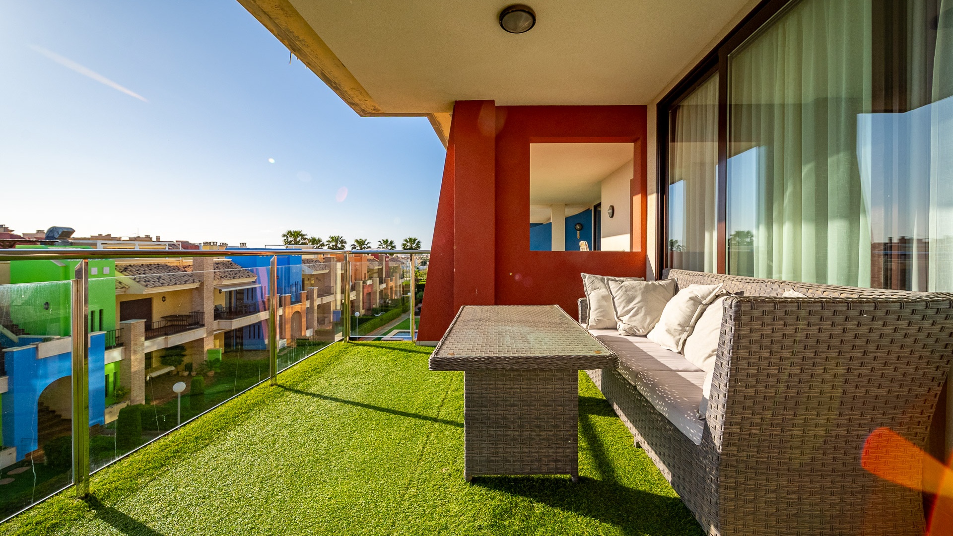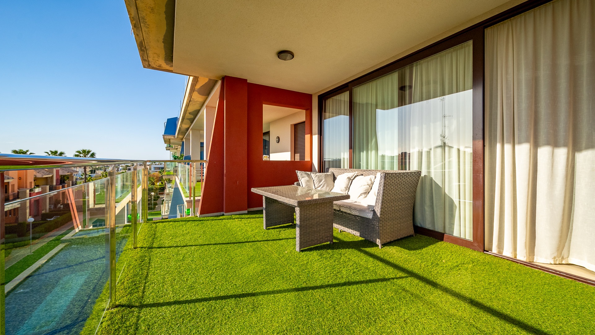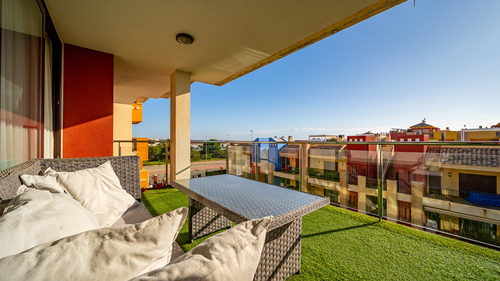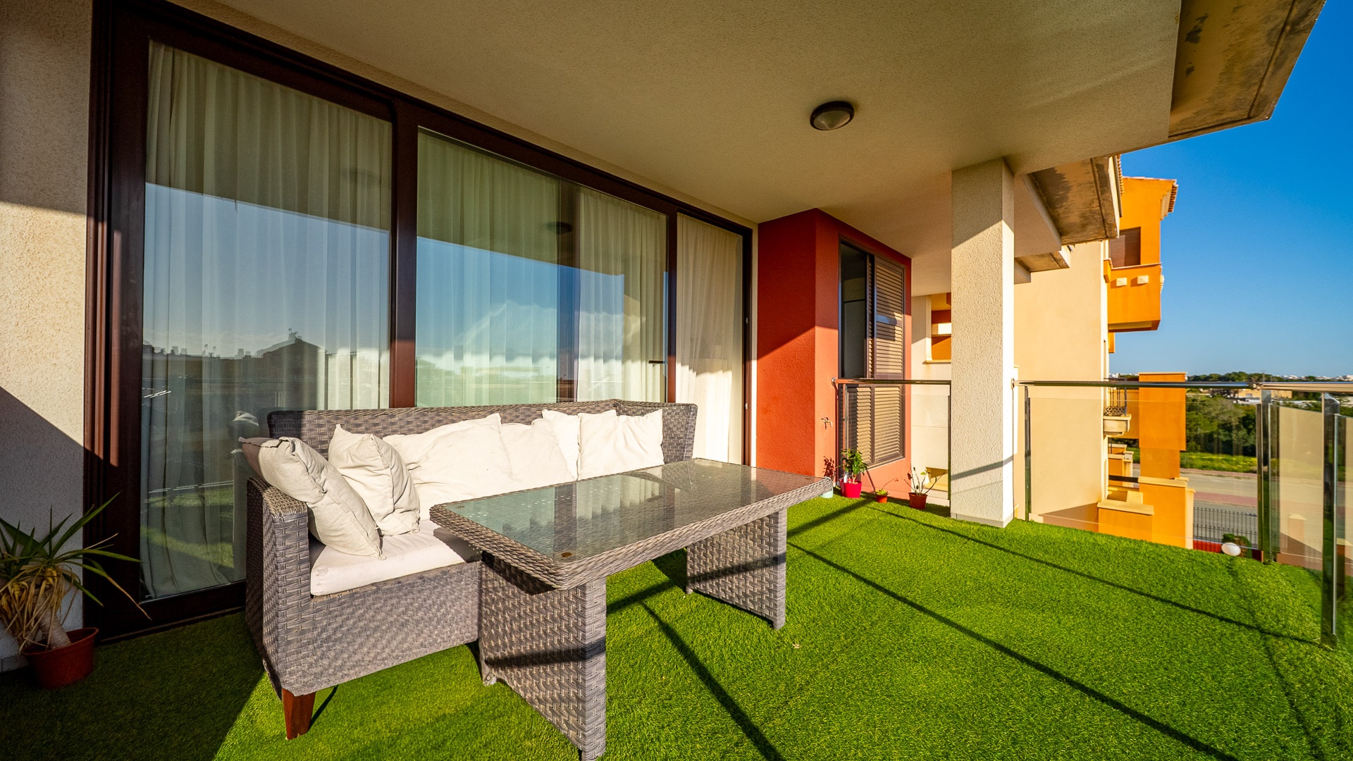 Appartement op de tweede verdieping in een privéwoningcomplex met 3 slaapkamers en 2 badkamers. De woning beschikt over een ruime woon-/eetkamer, een aparte keuken en een groot terras met kunstgras en een bank met uitzicht op de gemeenschappelijke ruimtes.