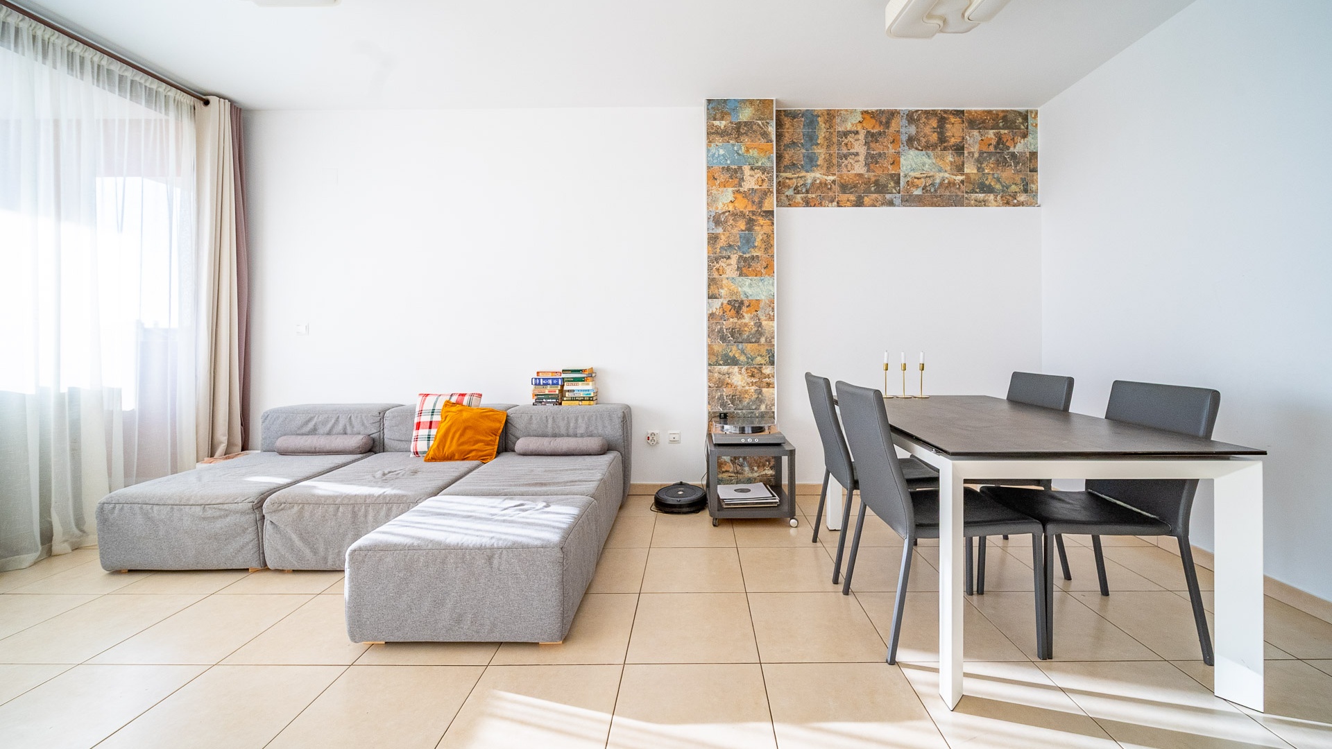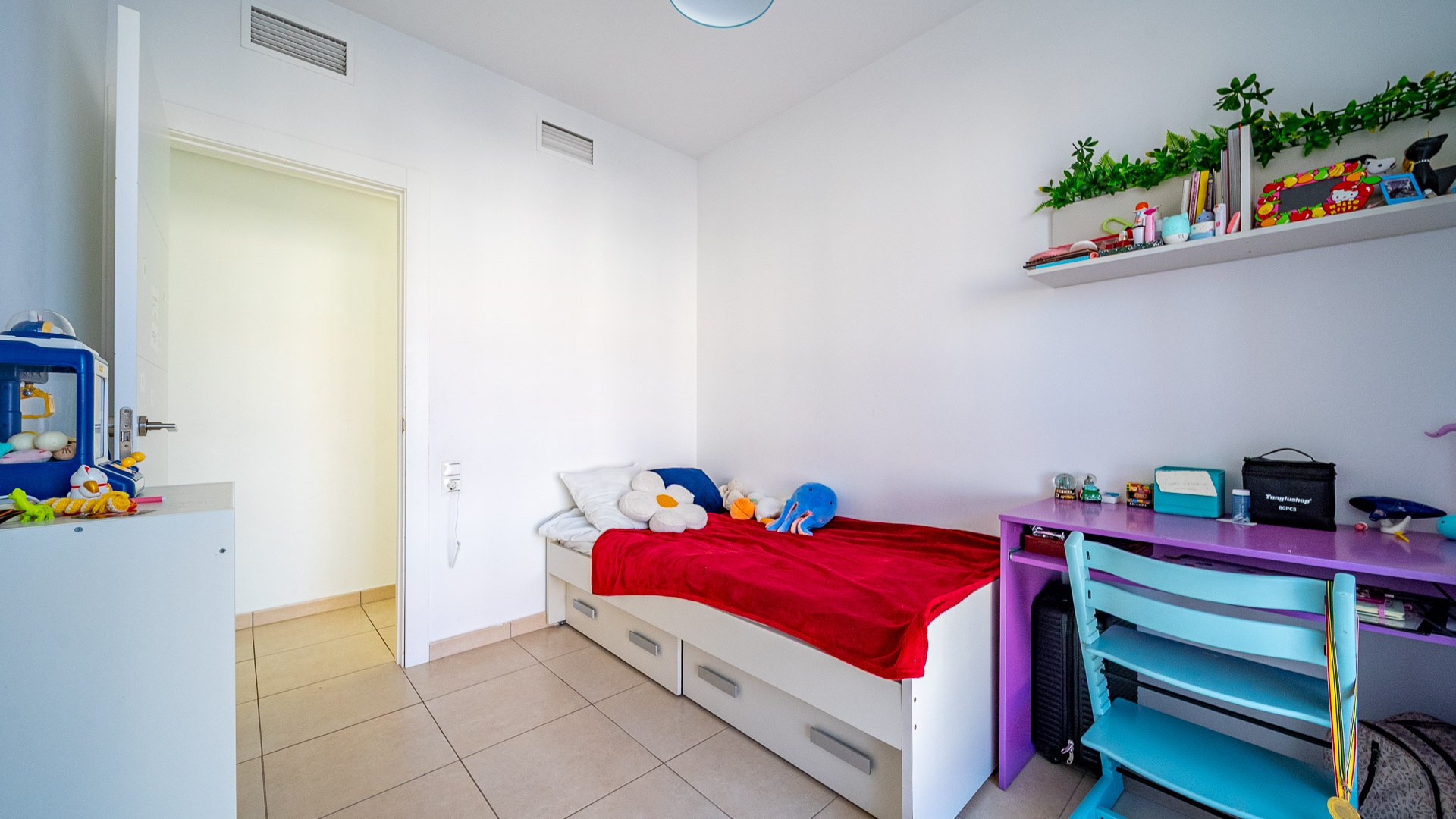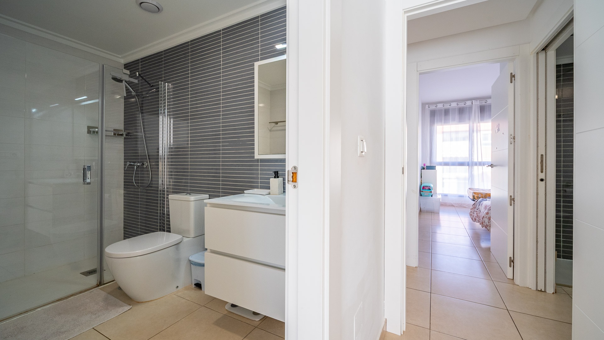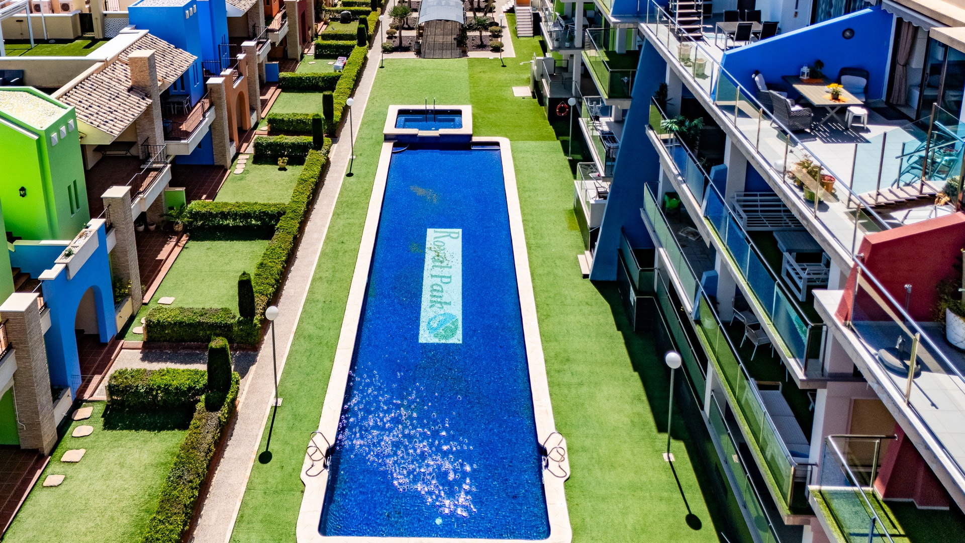 Appartement op de tweede verdieping in een privéwoningcomplex met 3 slaapkamers en 2 badkamers. De woning beschikt over een ruime woon-/eetkamer, een aparte keuken en een groot terras met kunstgras en een bank met uitzicht op de gemeenschappelijke ruimtes.