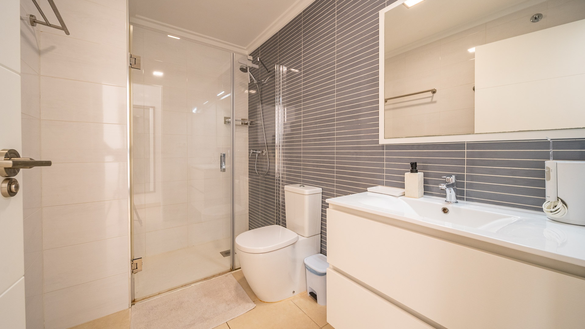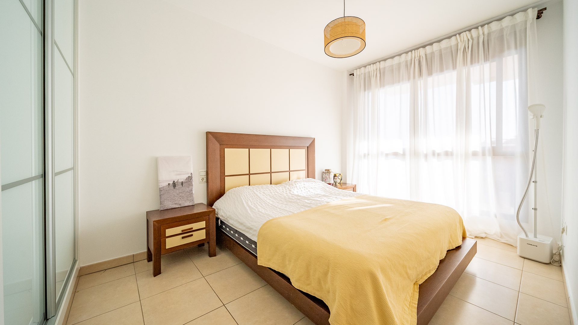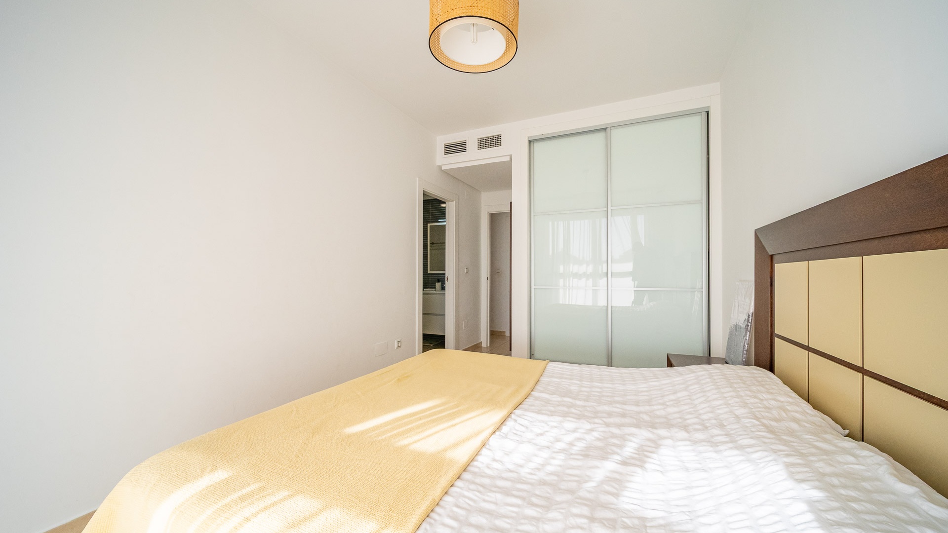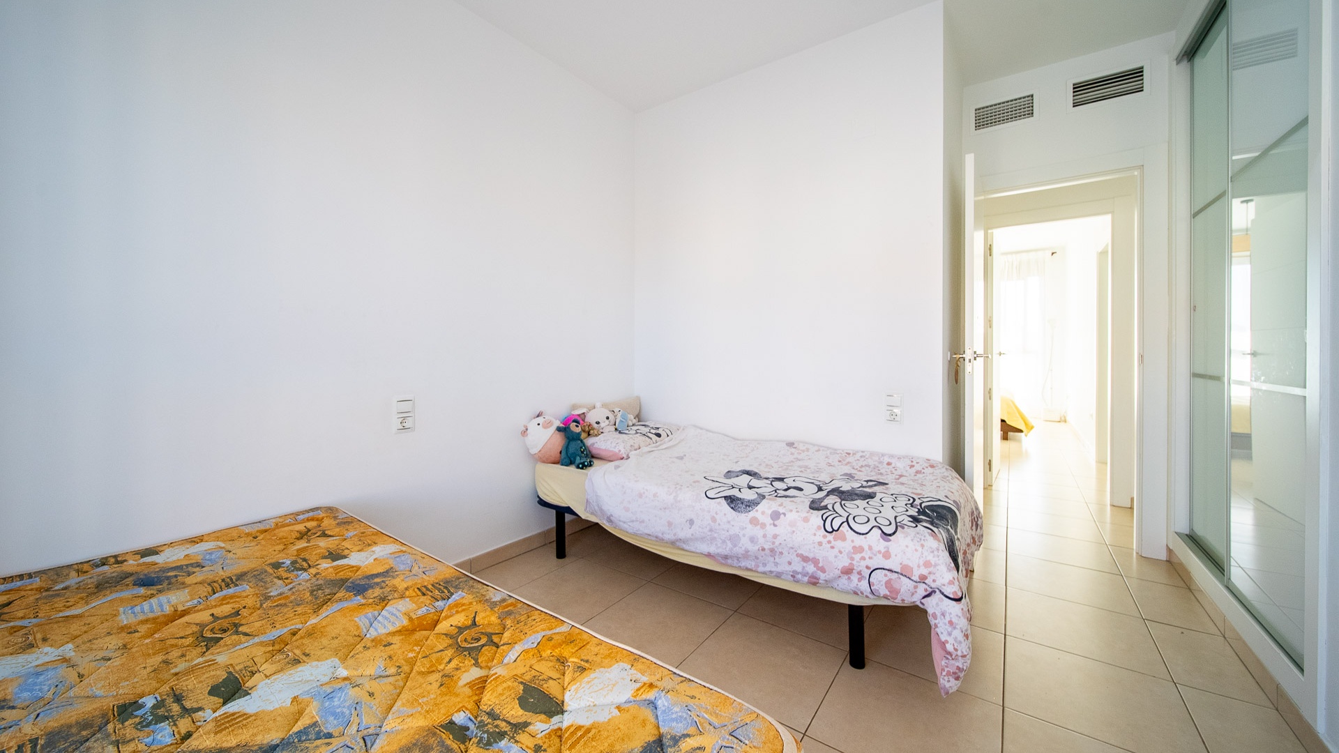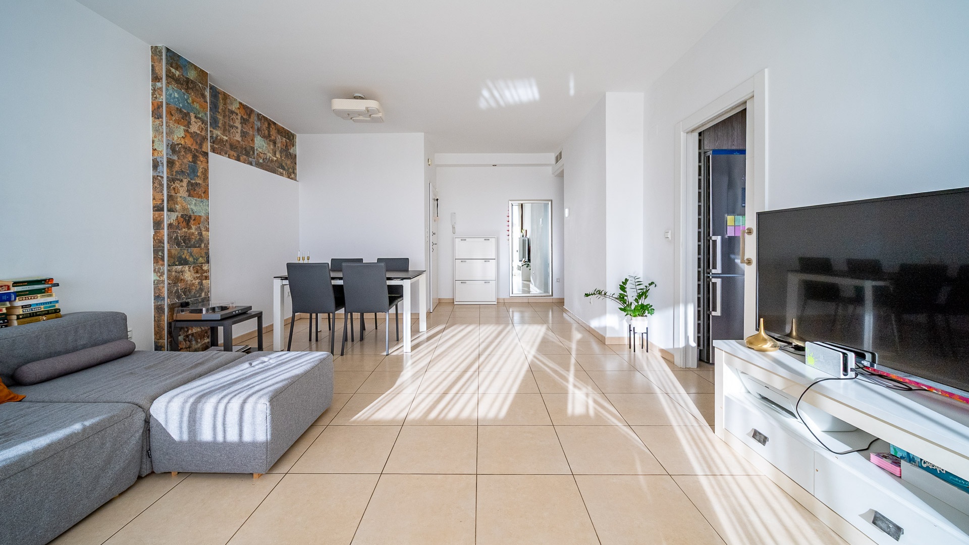 Appartement op de tweede verdieping in een privéwoningcomplex met 3 slaapkamers en 2 badkamers. De woning beschikt over een ruime woon-/eetkamer, een aparte keuken en een groot terras met kunstgras en een bank met uitzicht op de gemeenschappelijke ruimtes.