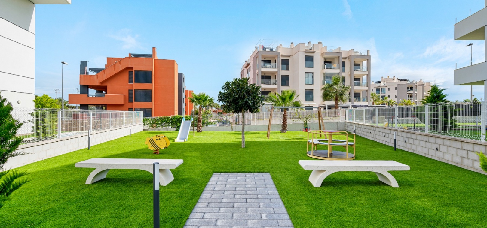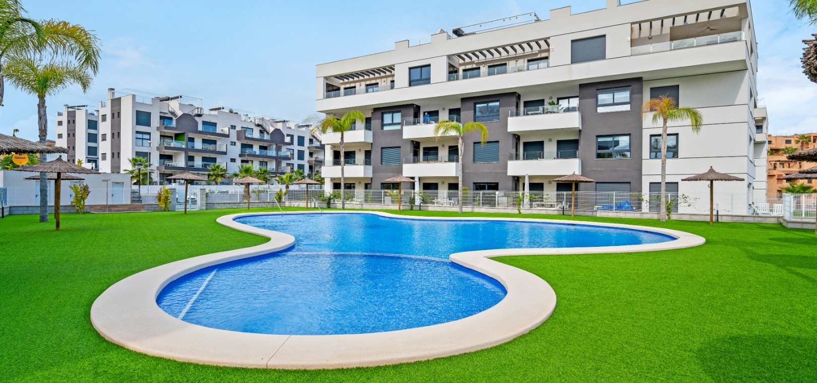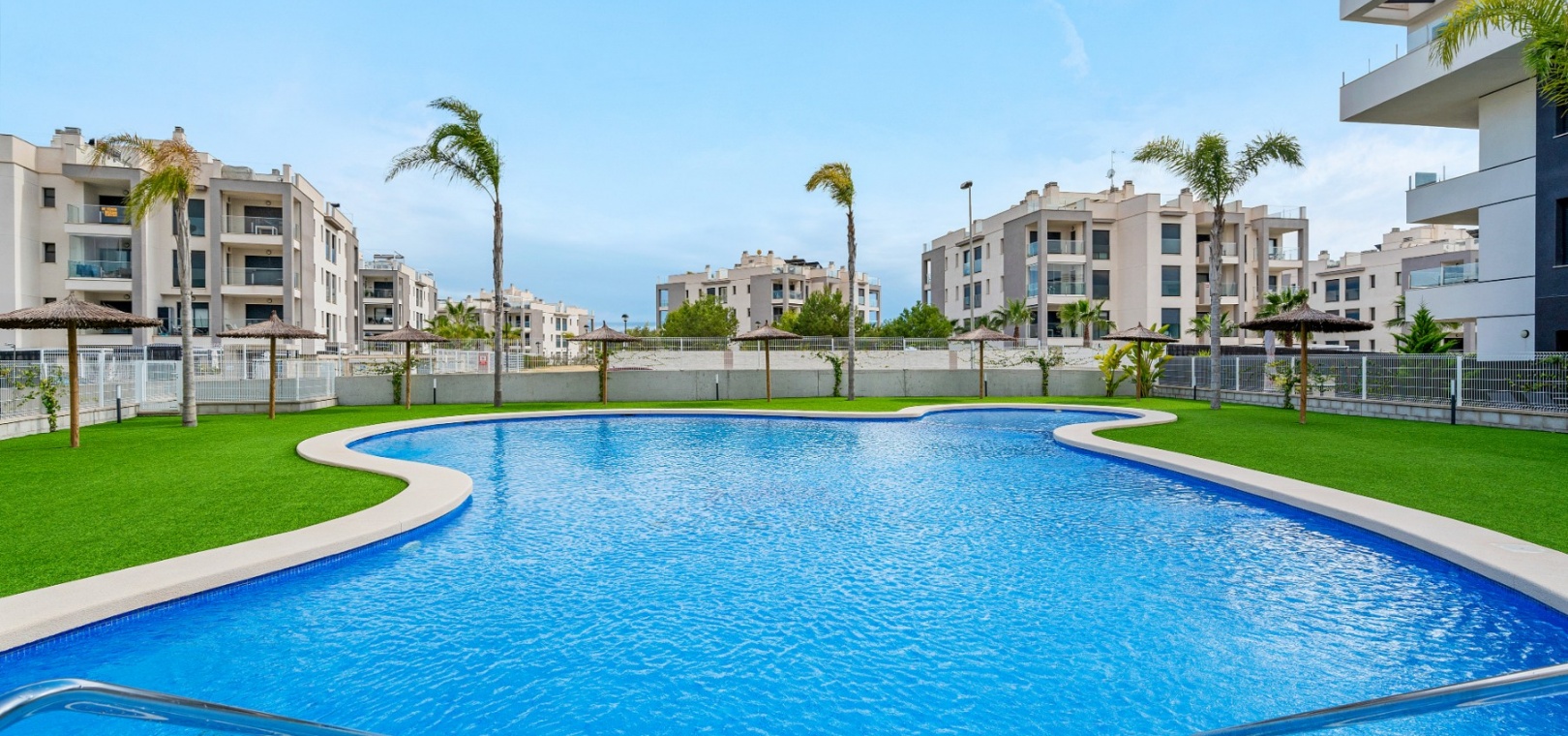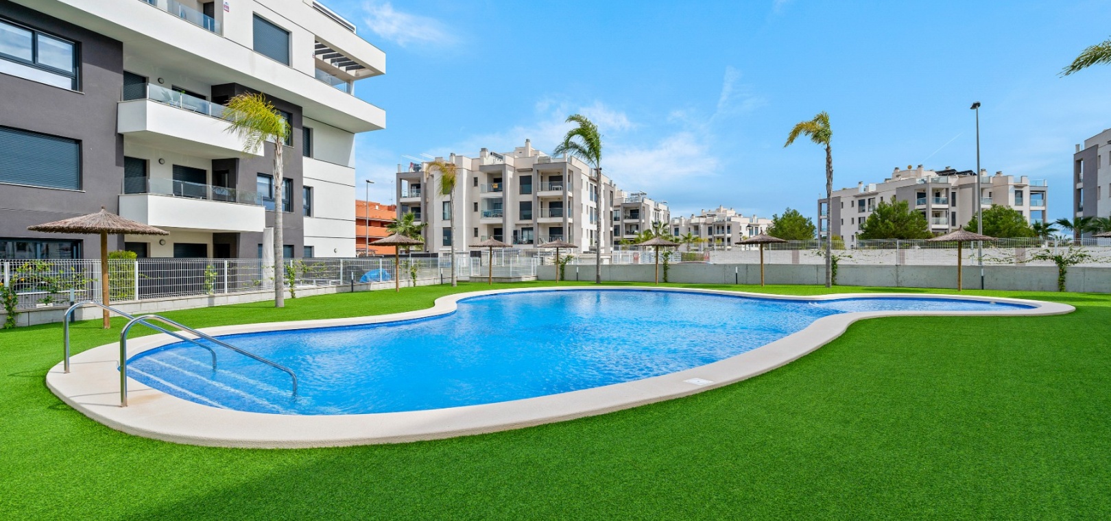 Er is een groot gemeenschappelijk zwembad en bij het appartement hoort een eigen parkeerplaats op het beveiligde parkeerterrein aan de voorzijde van het gebouw.