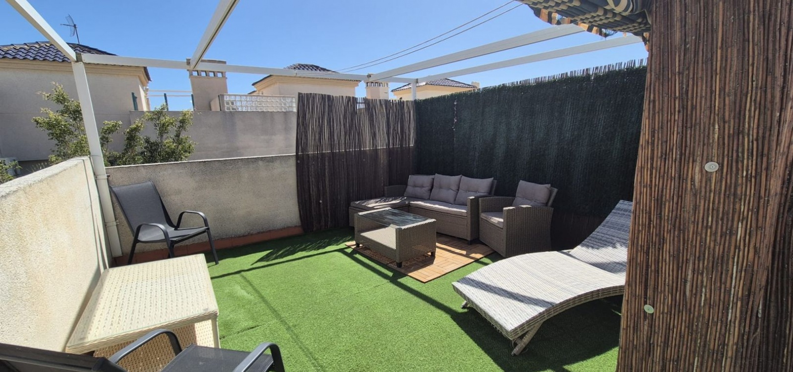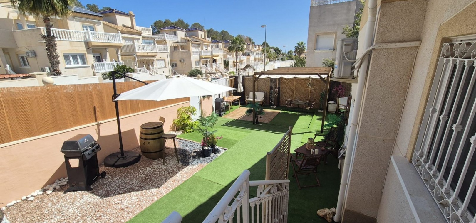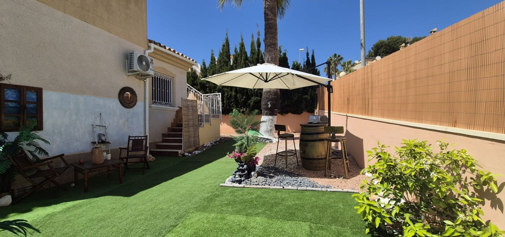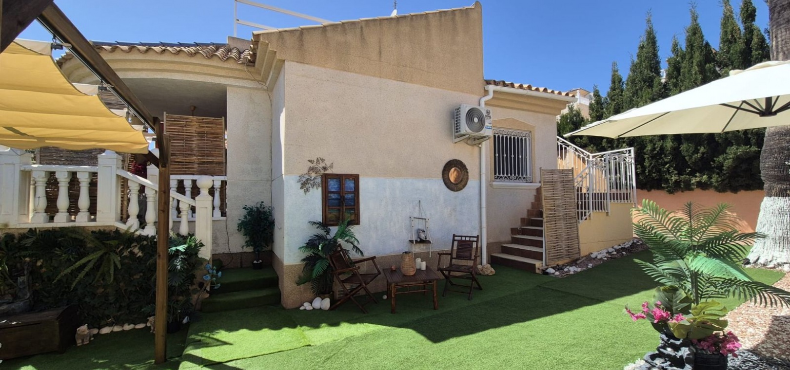 Prachtige vrijstaande villa gelegen in de urbanisatie Loma Golf in Villamartin. Deze prachtige vrijstaande villa met zuidoriëntatie, gelegen op een ruim perceel van 190 m², straalt warmte en rust uit. Dankzij de ideale ligging baadt de woning de hele dag in overvloedig natuurlijk licht. De villa beschikt over twee ruime slaapkamers, elk met een serene rust, en een moderne badkamer, smaakvol ingericht met strakke armaturen en fittingen. Het uitgestrekte perceel rondom de villa biedt volop ruimte voor buitenleven, ontspanning en entertainment. Stelt u zich eens voor dat u warme avonden buiten doorbrengt, omringd door weelderig groen en levendige bloemen. Naast de grote buitenruimte beschikt deze villa over een privé dakterras. Neem vandaag nog contact met ons op voor meer informatie of een bezichtiging!
