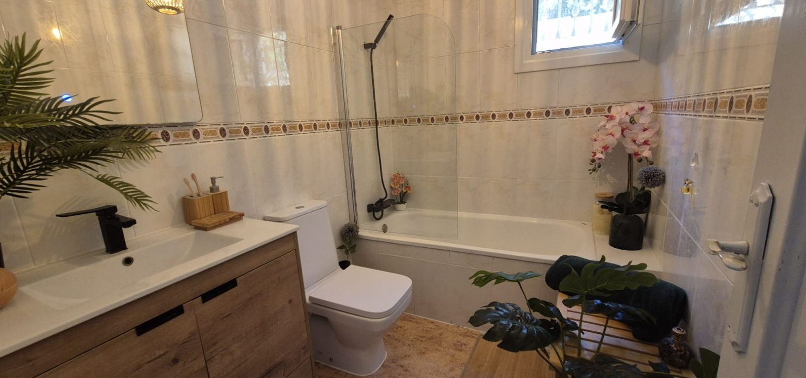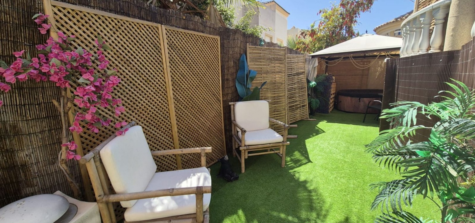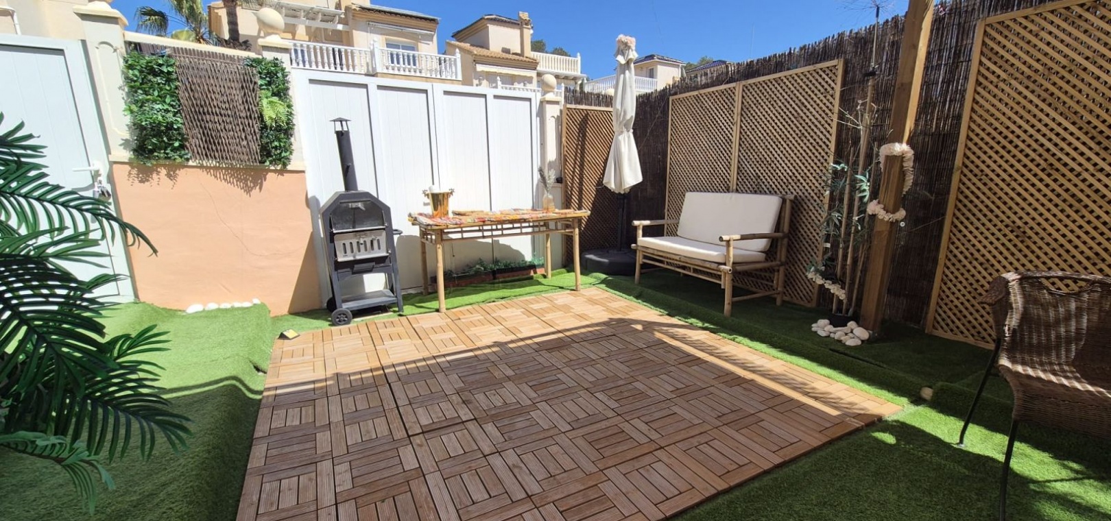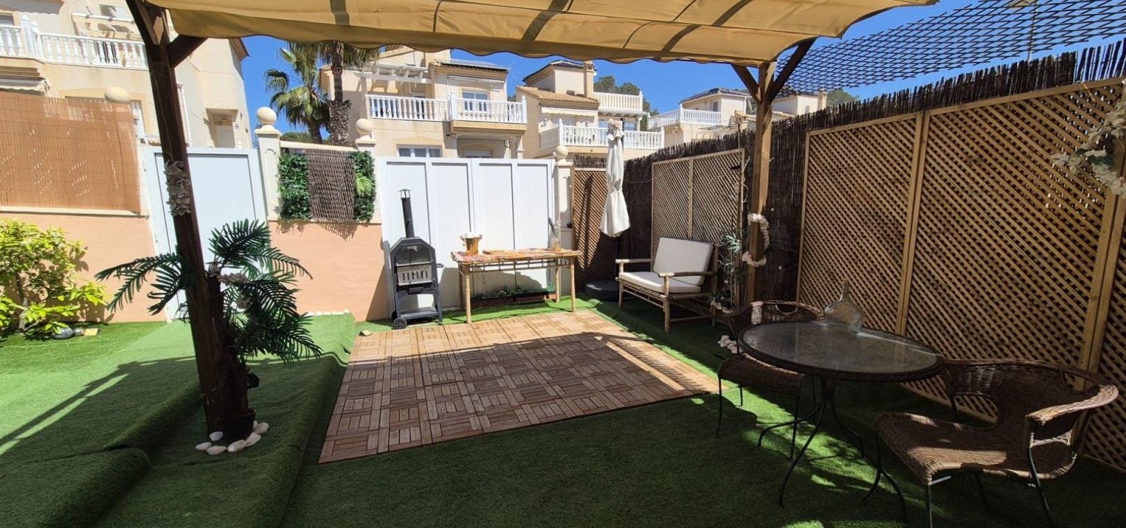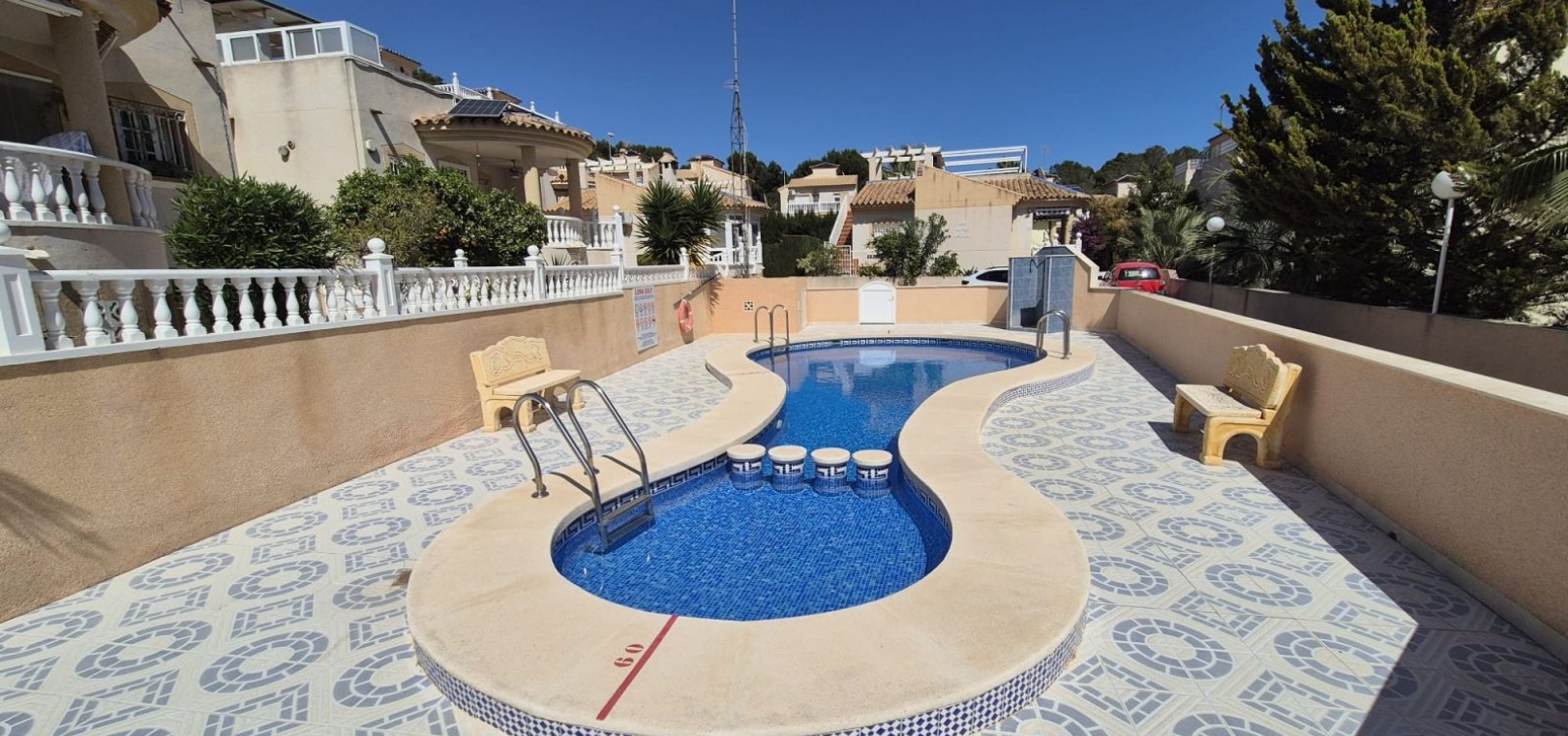 Prachtige vrijstaande villa gelegen in de urbanisatie Loma Golf in Villamartin. Deze prachtige vrijstaande villa met zuidoriëntatie, gelegen op een ruim perceel van 190 m², straalt warmte en rust uit. Dankzij de ideale ligging baadt de woning de hele dag in overvloedig natuurlijk licht. De villa beschikt over twee ruime slaapkamers, elk met een serene rust, en een moderne badkamer, smaakvol ingericht met strakke armaturen en fittingen. Het uitgestrekte perceel rondom de villa biedt volop ruimte voor buitenleven, ontspanning en entertainment. Stelt u zich eens voor dat u warme avonden buiten doorbrengt, omringd door weelderig groen en levendige bloemen. Naast de grote buitenruimte beschikt deze villa over een privé dakterras. Neem vandaag nog contact met ons op voor meer informatie of een bezichtiging!