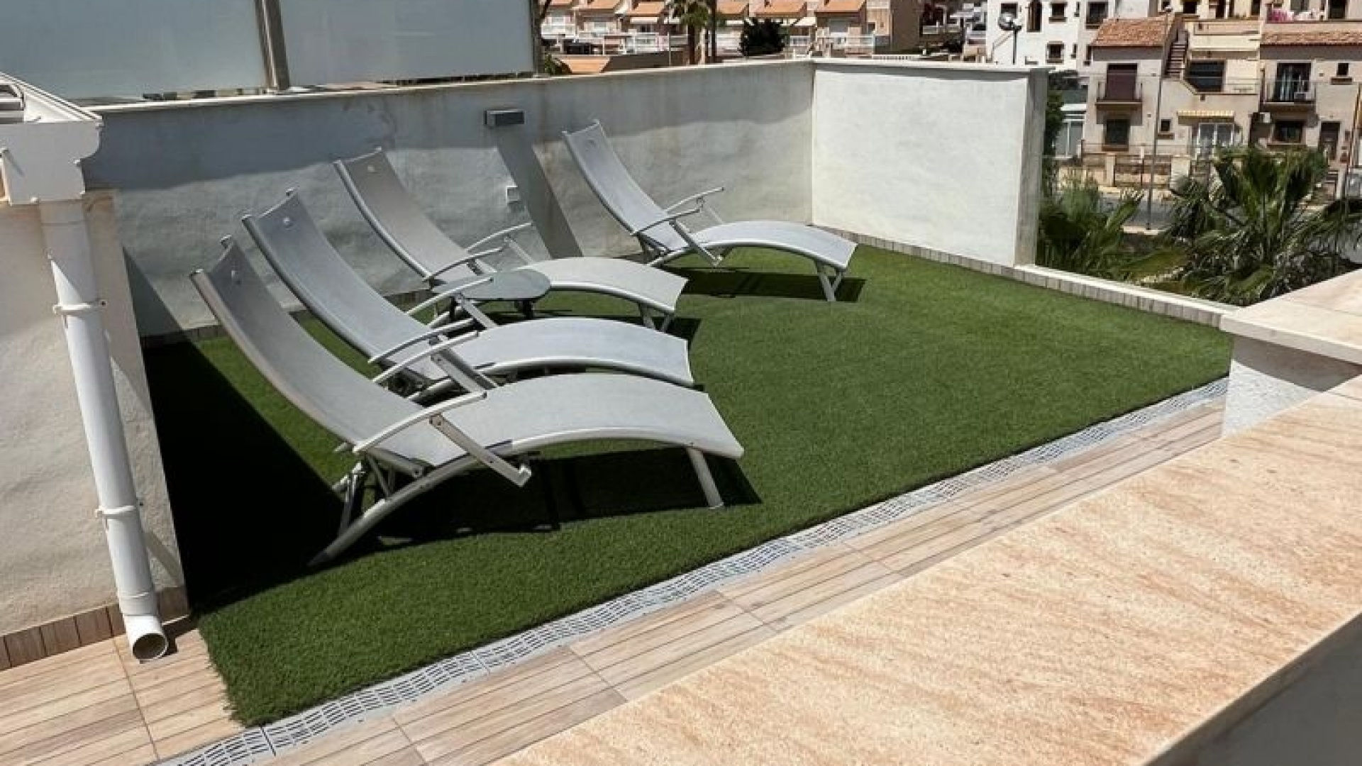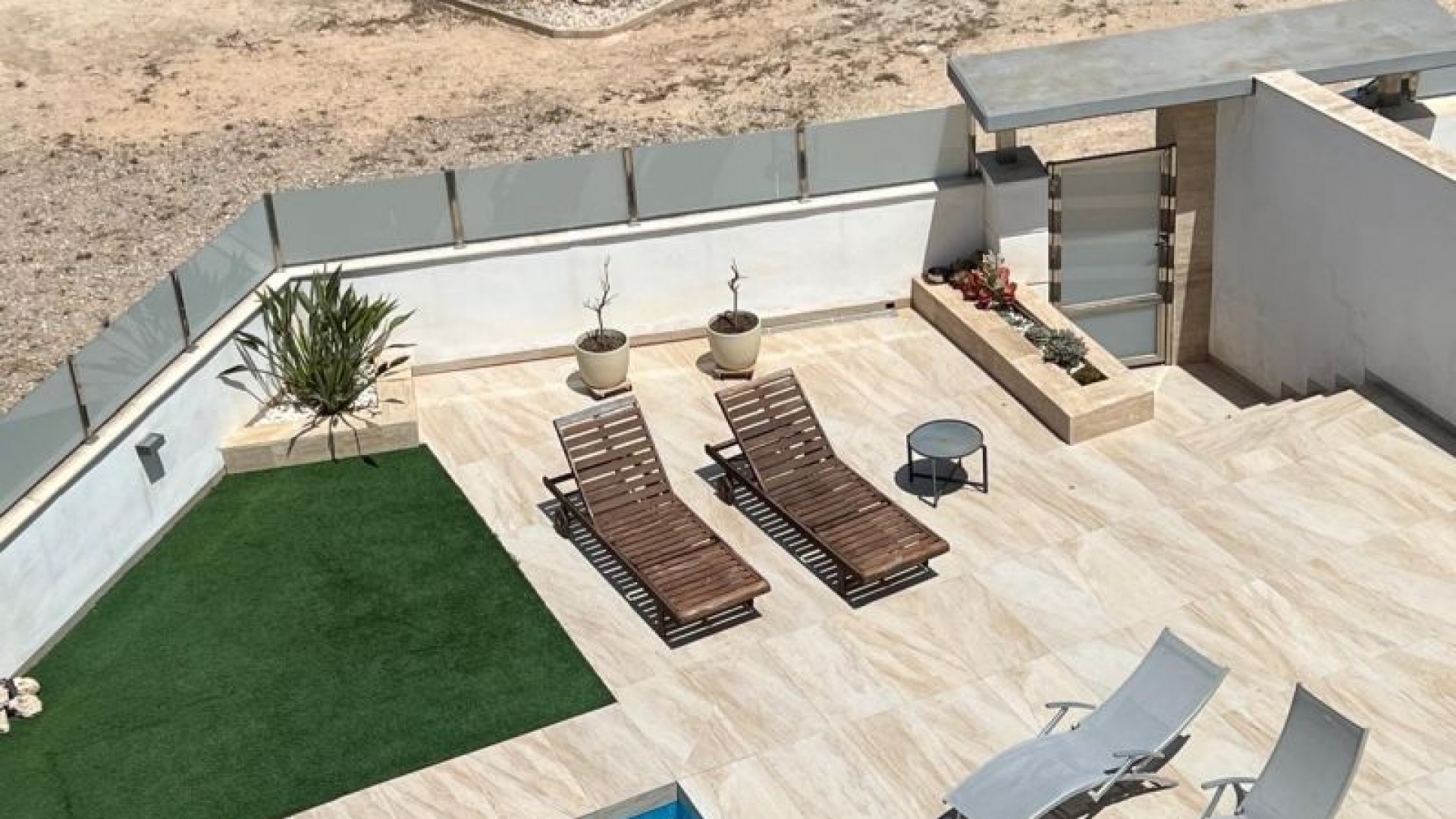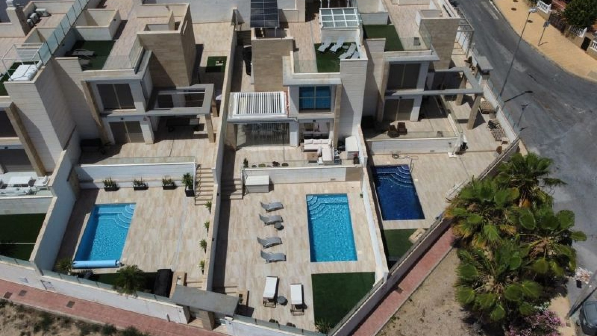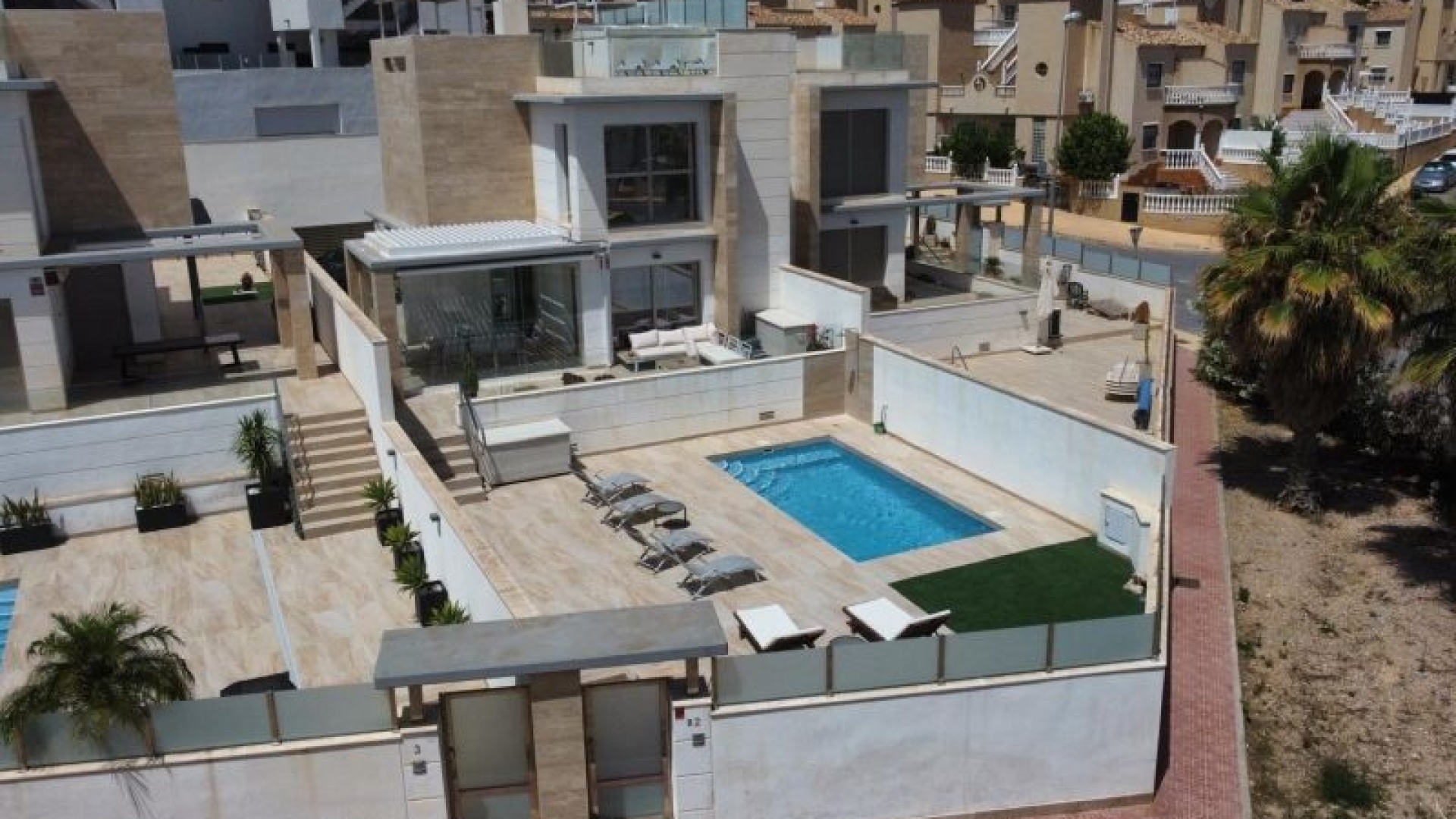 Semi-nieuwe, modern vormgegeven vrijstaande villa. Vrij uitzicht. Veel licht. Gelegen in een rustige woonwijk, op loopafstand van allerlei voorzieningen zoals een bushalte, winkelcentra, winkels, de supermarkt Mercadona, het winkelcentrum La Fuente, op minder dan 1 km van de golfbanen Las Ramblas, Campoamor Golf, Villamartín Golf, op 2 km van het winkelcentrum Zenia Boulevard en op 5 km van de stranden van Campoamor, Cabo Roig, La Zenia, Playa Flamenca,... Het huis bestaat uit een begane grond, een kelder en een bovenverdieping. De begane grond heeft een eigen perceel, een oprit aan de achterzijde en een berging. Aan de voorzijde is er een voetgangersingang, een zeer zonnig zwembad met ligstoelen en een tuinterras. Ruime woonkamer met open keuken en galerij met toegang tot het achterste gedeelte van het perceel met parkeerplaats en garagedeur. Complete badkamer en 2 tweepersoonsslaapkamers. Op de kelderverdieping bevinden zich een woonkamer met open keuken, een tweepersoonsslaapkamer, een complete badkamer en op de bovenverdieping een slaapkamer met een badkamer en een zonneterras met uitzicht op zee en vrij uitzicht. Wordt verkocht met een deel van de inboedel volgens inventaris. Veel extra's.