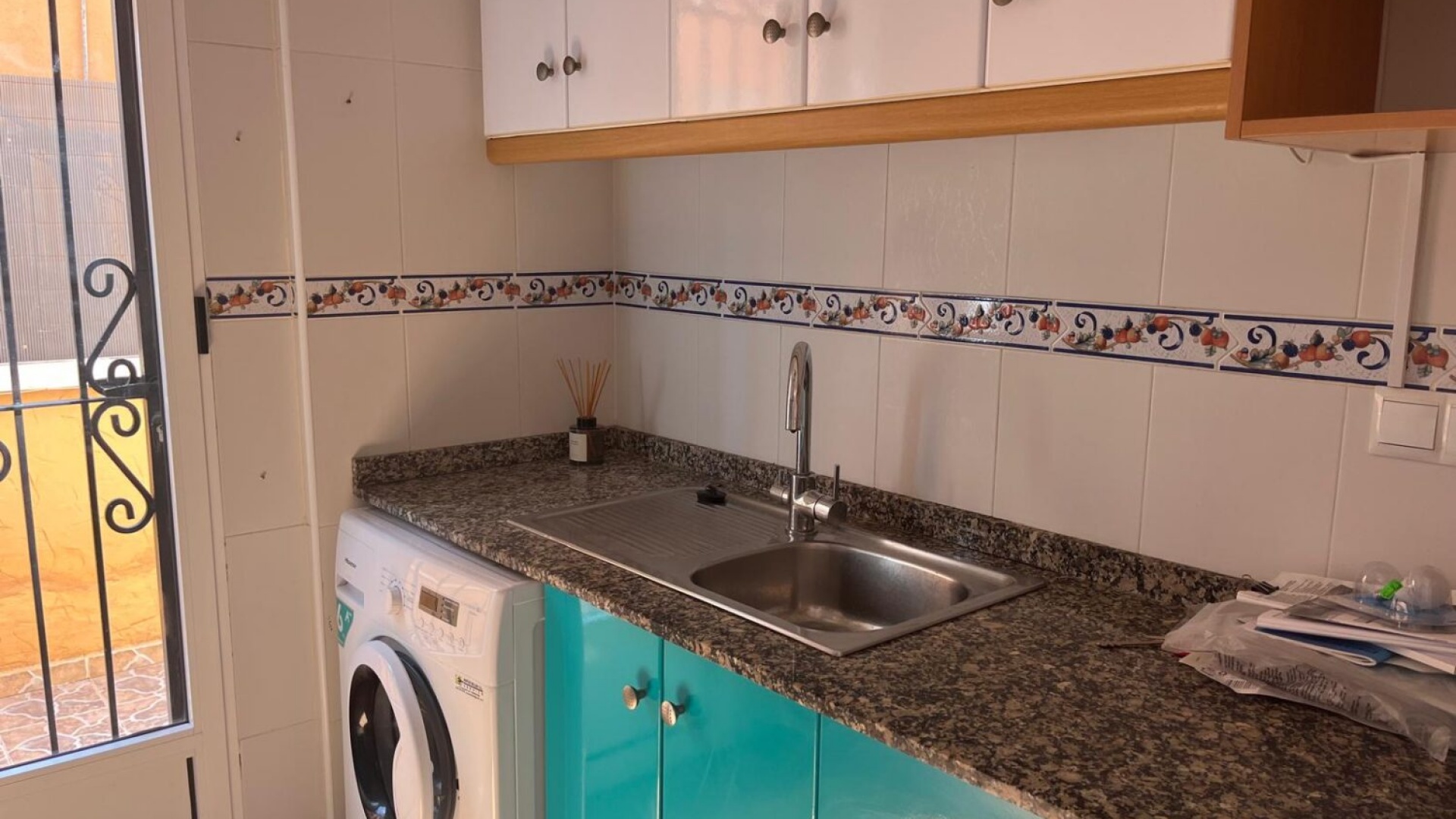 Op de begane grond bevindt zich een ruime woon-/eetkamer met warme en koude verwarming en 2 plafondventilatoren, een aparte keuken met een deur naar de achtertuin, 1 tweepersoonsslaapkamer met inbouwkasten, 1 doucheruimte en een overdekt terras aan de voorzijde.