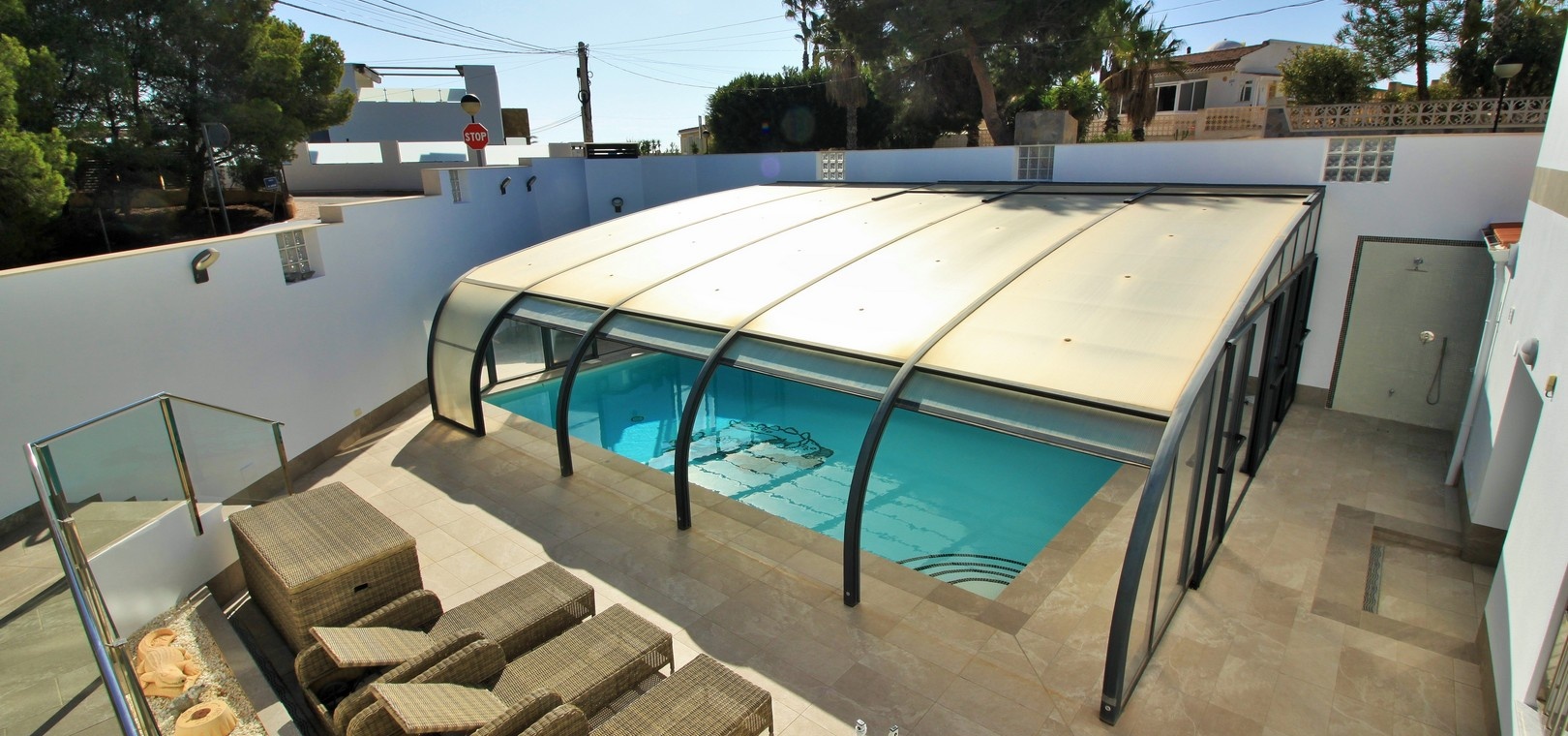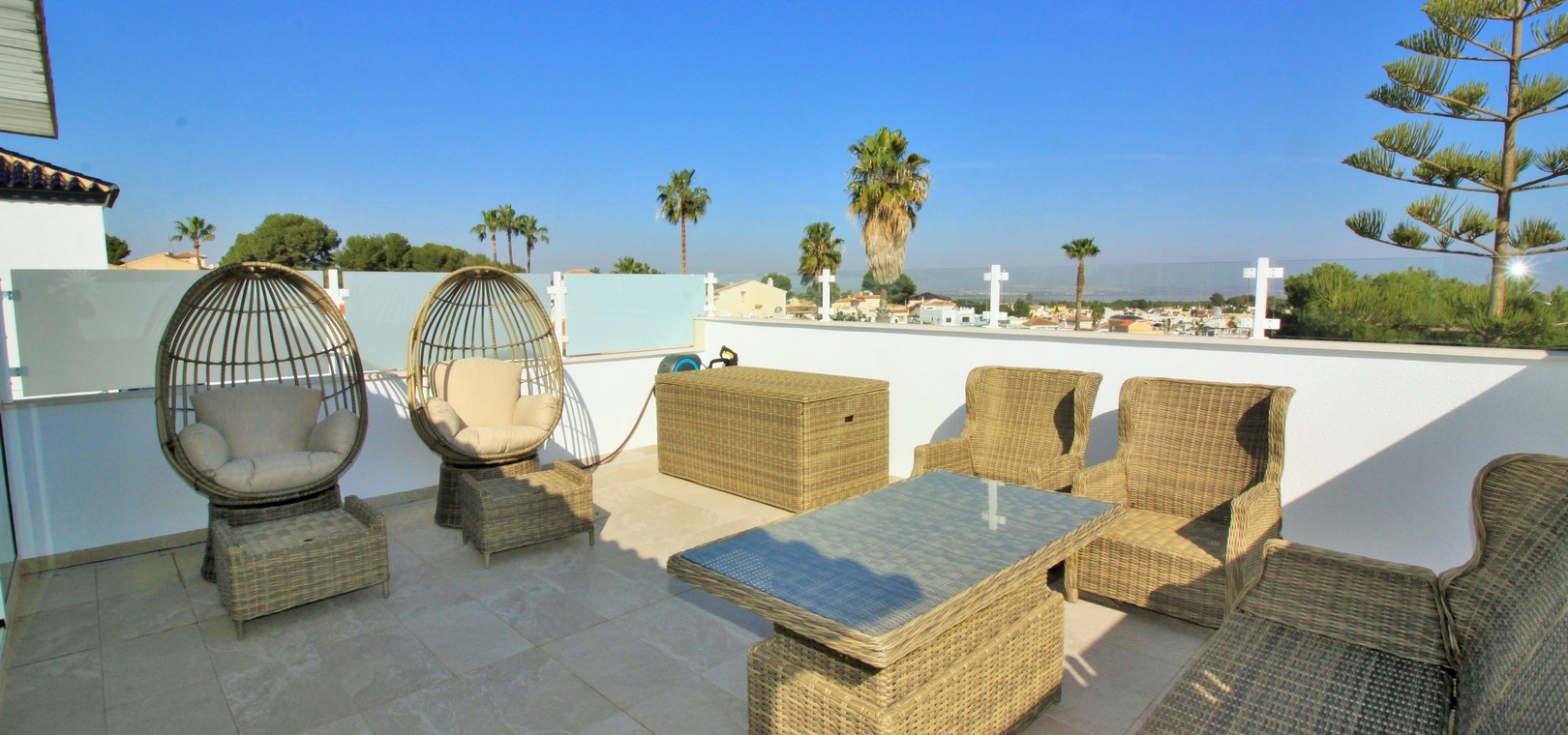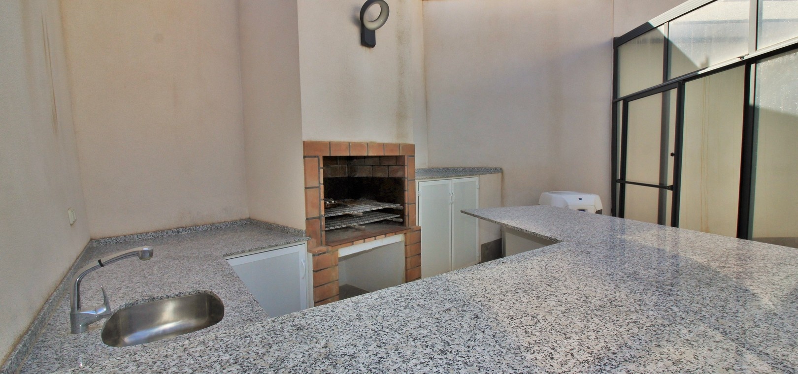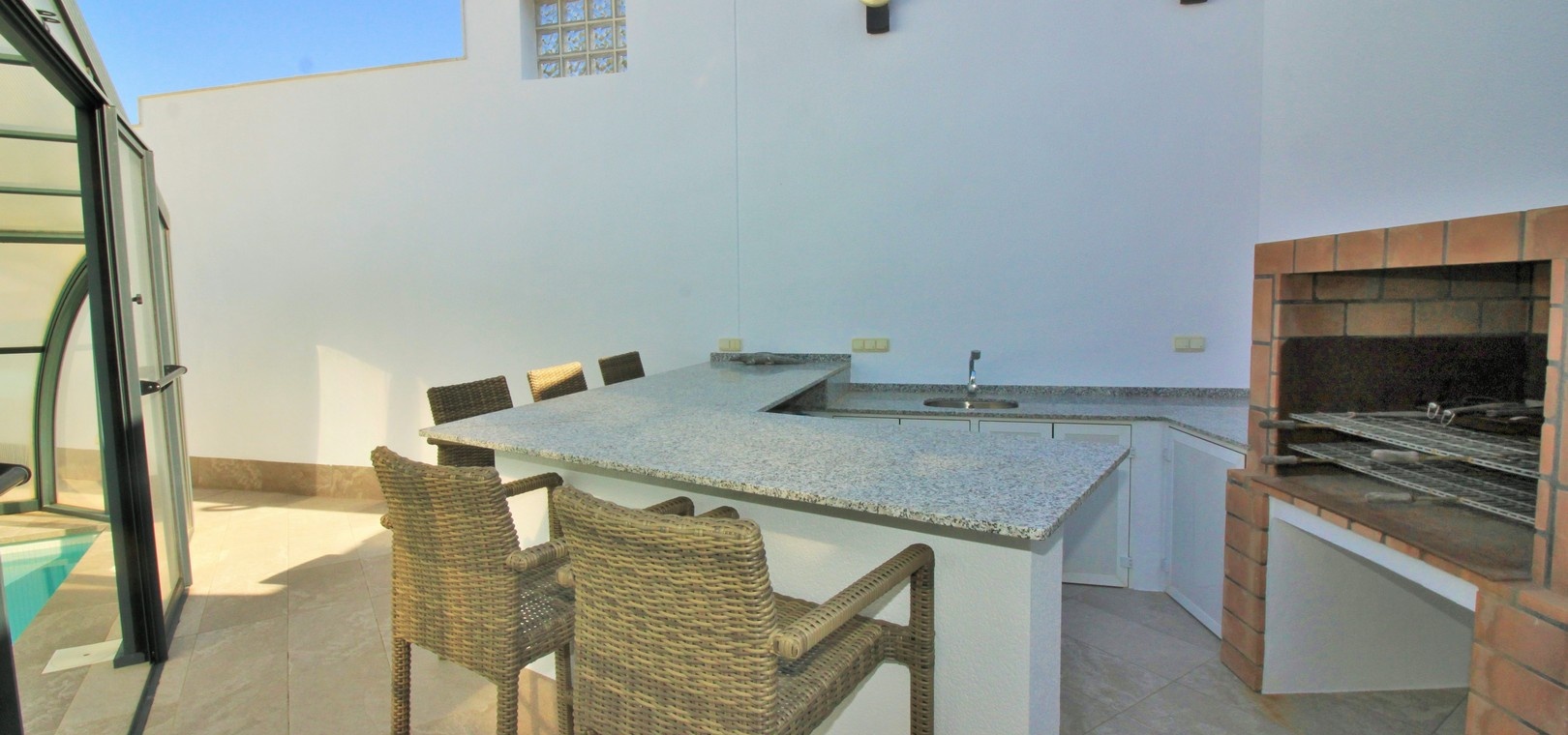 Verwarmd privézwembad Intrekbare koepelafdekking voor gebruik het hele seizoen door Groot dakterras met gedeeltelijke omheining Biedt een prachtig uitzicht op de zoutmeren van Torrevieja Zomerkeuken met ingebouwde BBQ Overdekte carport met elektrische toegangspoort
