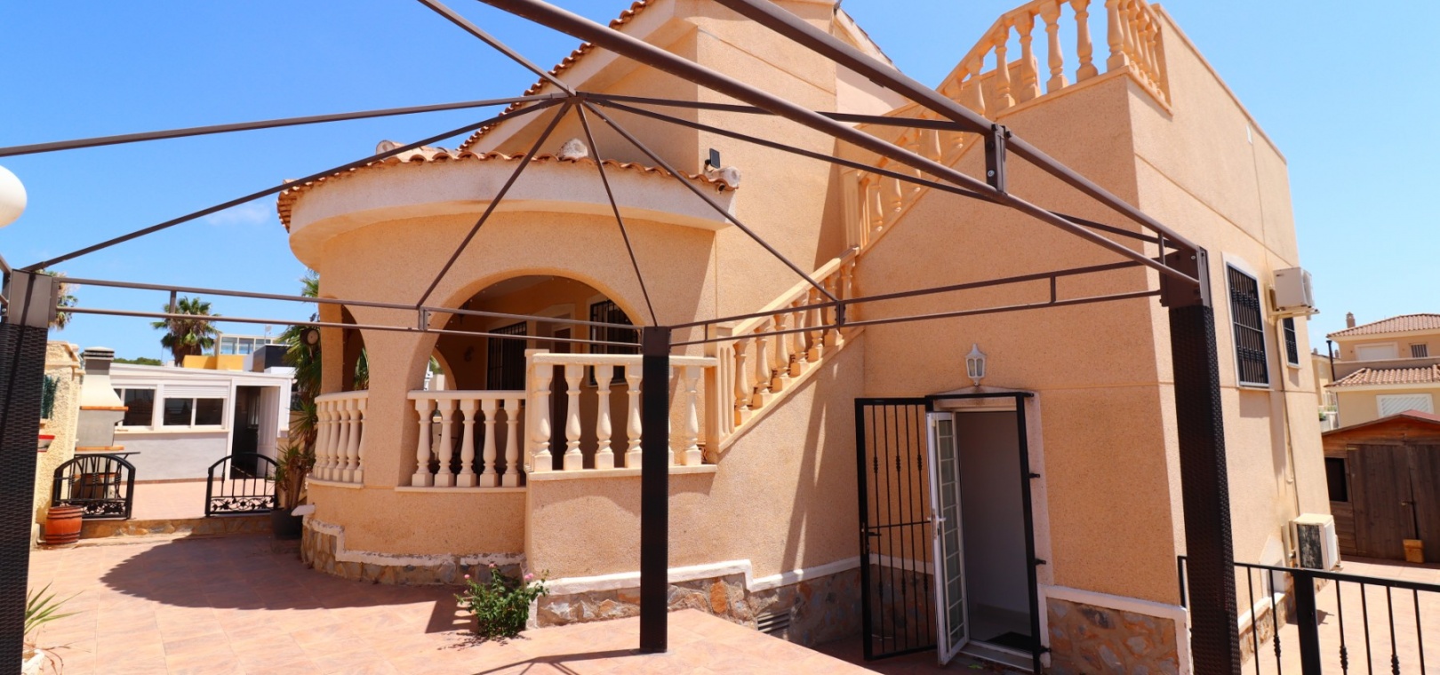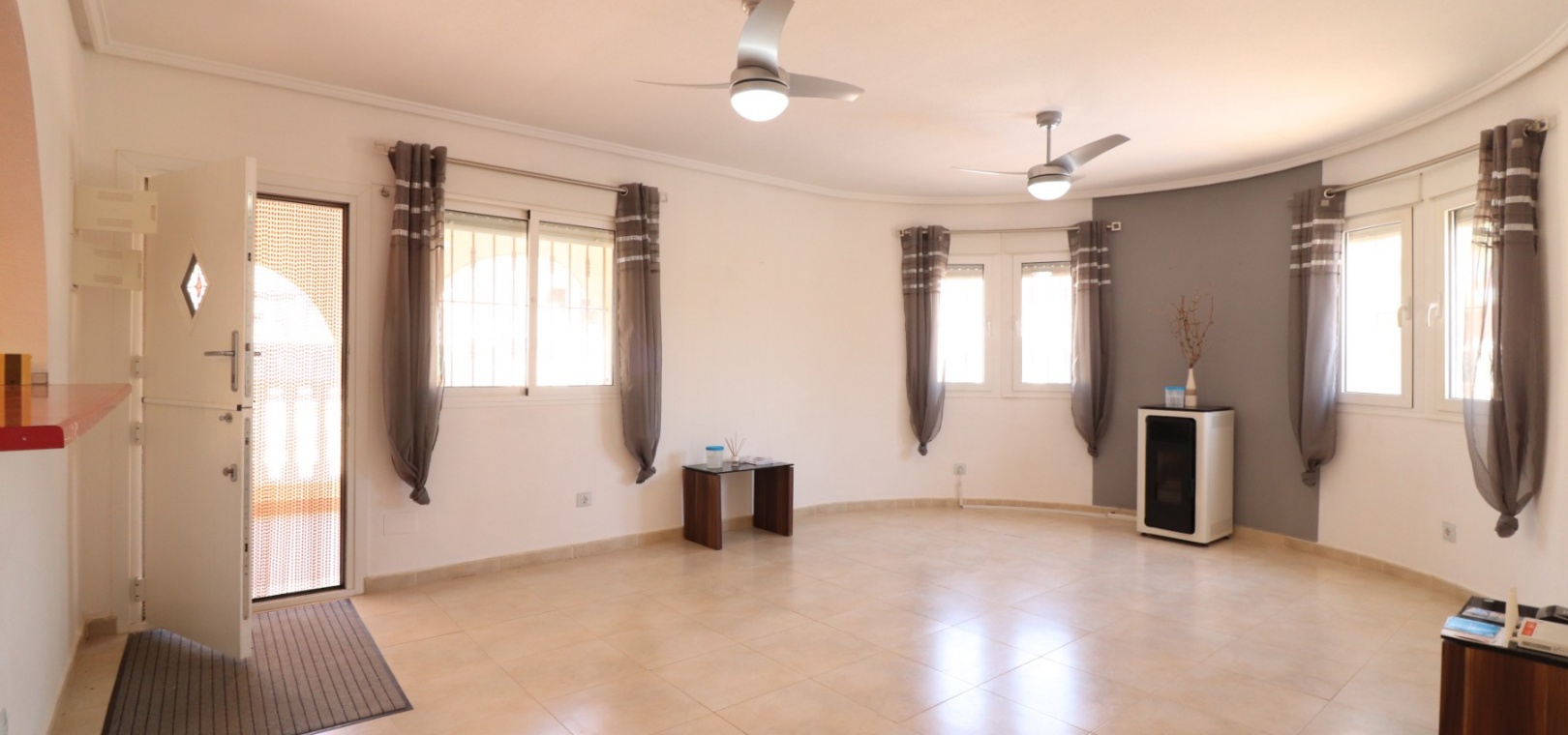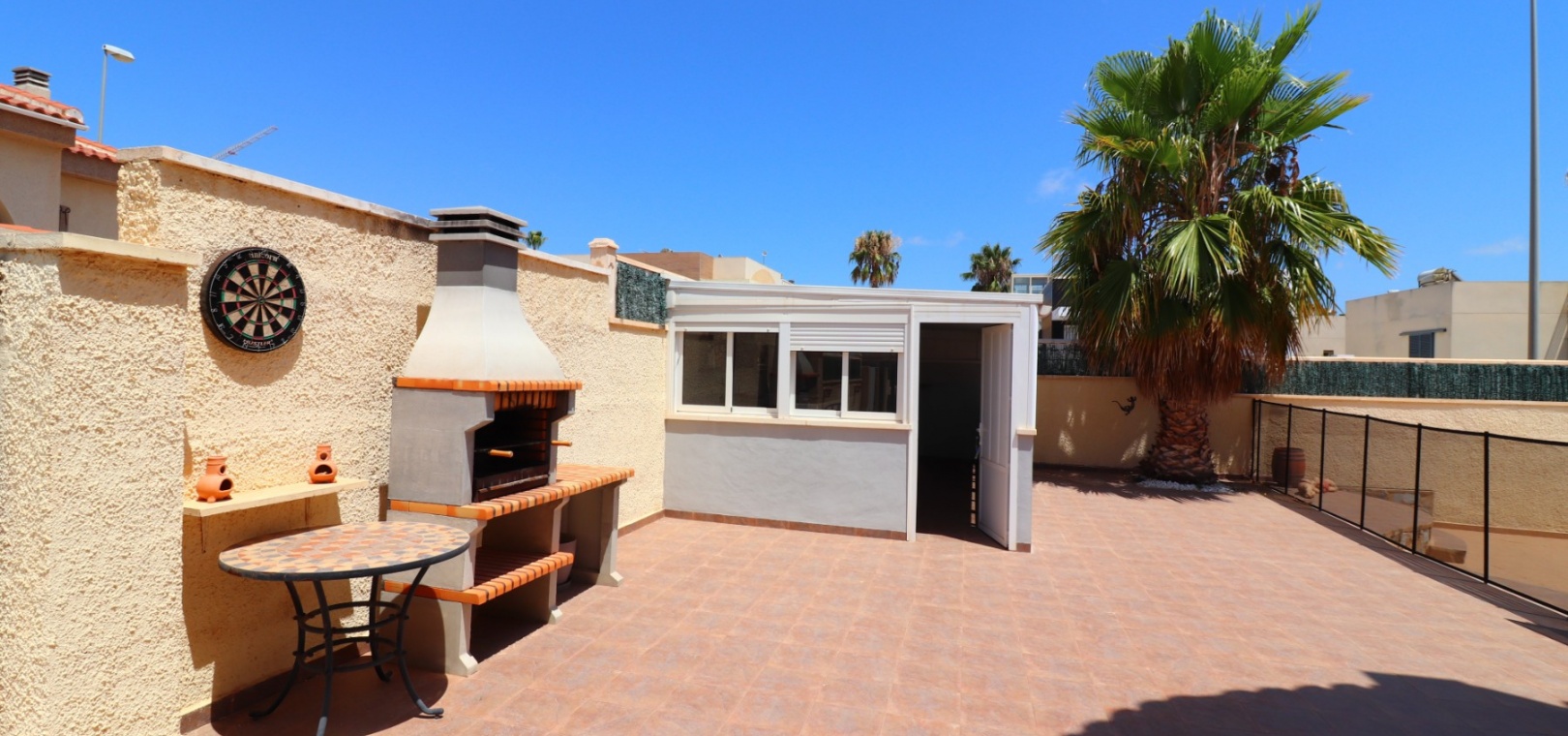 Deze vrijstaande villa met vijf slaapkamers, gelegen op het oosten in Atalaya Park, ligt vlakbij het Rojales Aquapark en op slechts enkele minuten van de bruisende winkelstraat Quesada, met een breed scala aan restaurants, cafés en winkels. De golfbaan La Marquesa ligt op slechts 5 minuten rijden en de prachtige stranden van de Costa Blanca Zuid zijn in ongeveer 15 minuten te bereiken. Deze ruime villa van 202 m² ligt op een betegeld perceel van 420 m² en beschikt over een overdekt terras dat leidt naar een lichte, gebogen woonkamer met drie ramen en een pelletkachel. De open, in Amerikaanse stijl ingerichte keuken wordt aangevuld door een aparte bijkeuken. Op de begane grond bevinden zich drie tweepersoonsslaapkamers met inbouwkasten, een familiebadkamer met douche en een hoofdslaapkamer met eigen badkamer. De onderbouw, die van buitenaf toegankelijk is, biedt uitstekende accommodatie voor gasten of gezinnen met een grote familie met twee extra tweepersoonsslaapkamers, een natte ruimte en een ruime woon-/eetkamer. Een buitentrap leidt naar een solarium met prachtig uitzicht op de bergen en het gemeenschappelijke zwembad. De buitenruimte omvat een gerenoveerd privézwembad met zout water, een aparte afgesloten ruimte die momenteel als bar wordt gebruikt, een barbecueplek en parkeergelegenheid op eigen terrein. Alle slaapkamers zijn voorzien van airconditioning, waardoor dit het hele jaar door een comfortabel huis is. Een uitzonderlijke en veelzijdige woning op een goed bereikbare locatie aan de Costa Blanca Zuid.