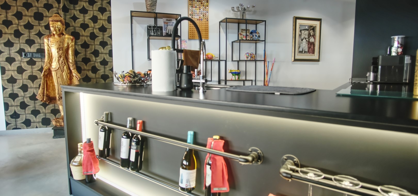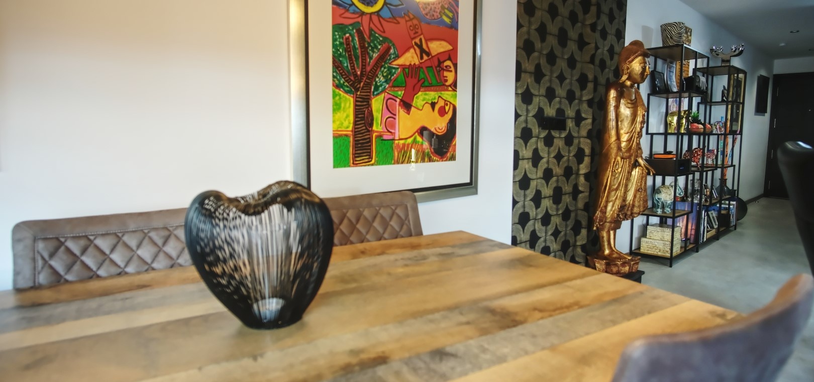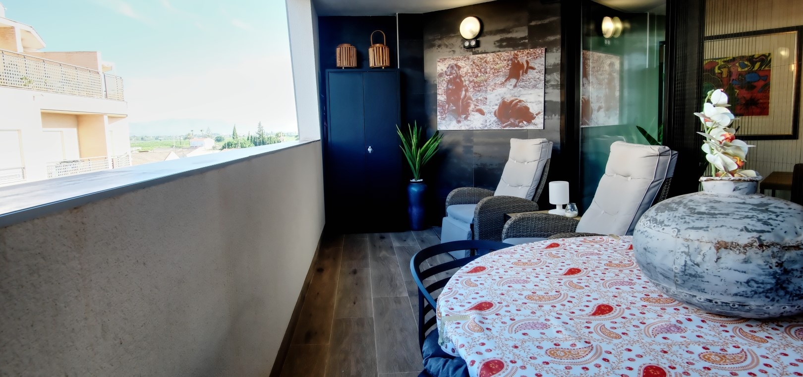 De open woonkamer, eetkamer en keuken met Balay-inbouwapparatuur creëren een uitnodigende ruimte voor zowel entertainment als dagelijks gebruik. Grote glazen deuren leiden naar een ruim balkon op het westen, ideaal om te zonnebaden, buiten te eten of 's avonds te ontspannen.