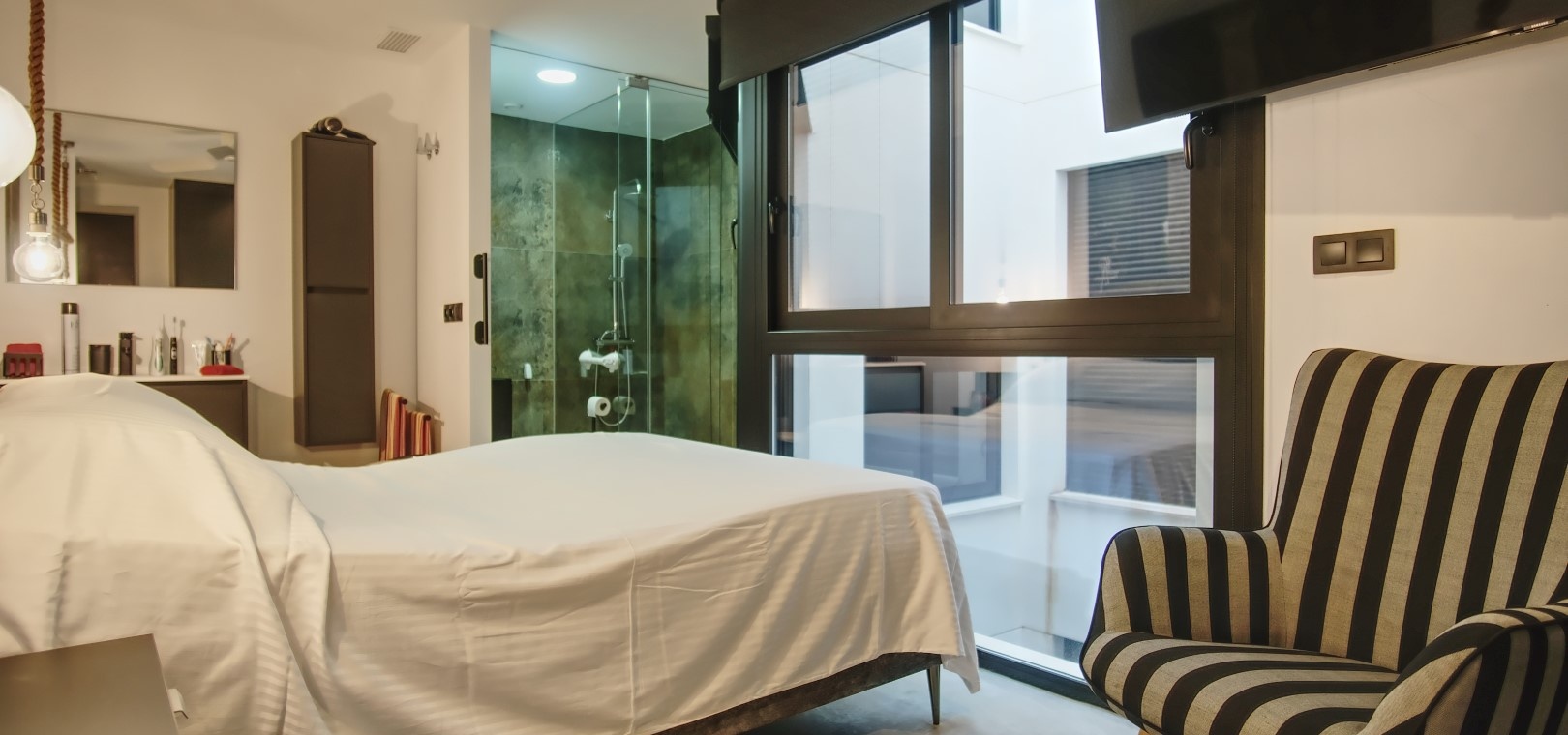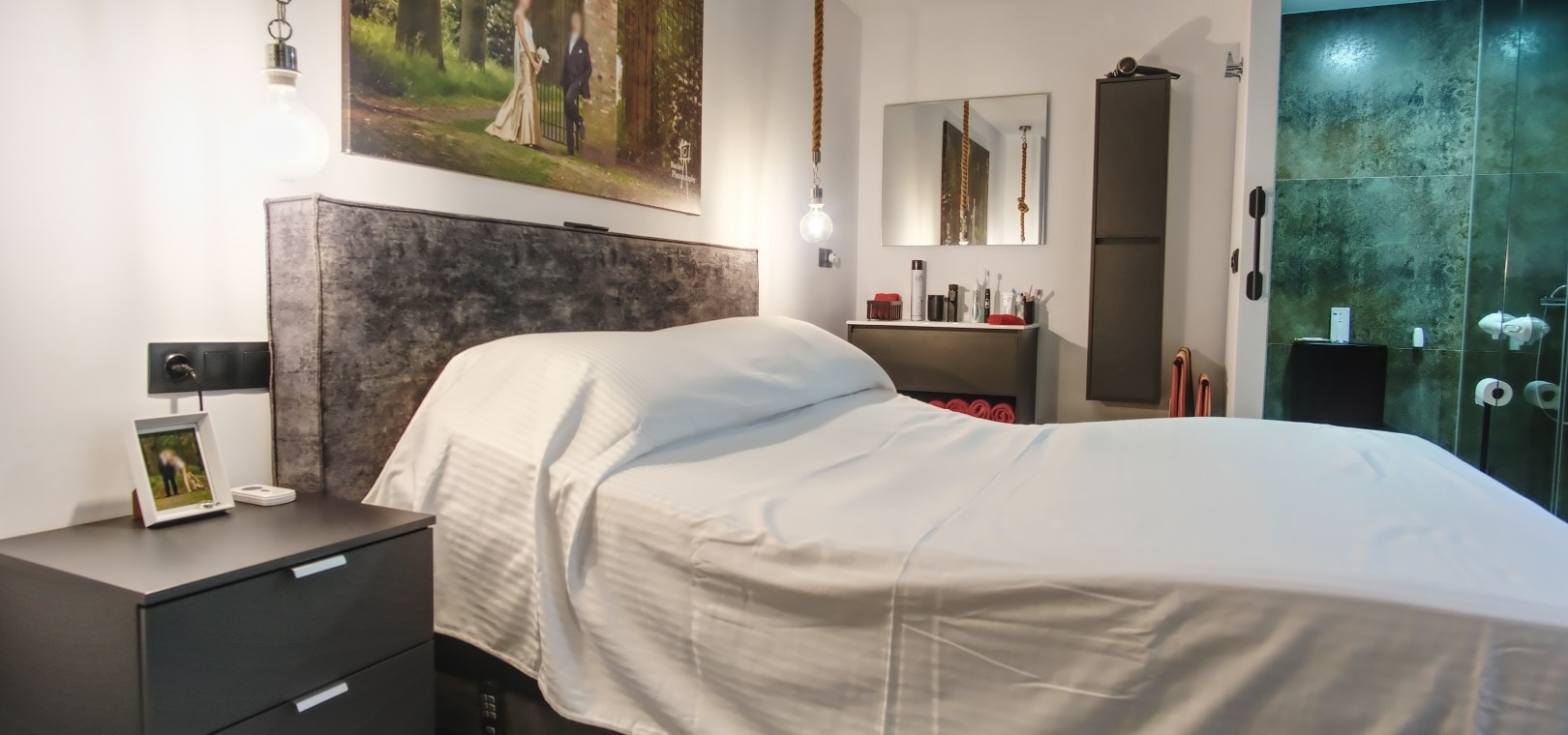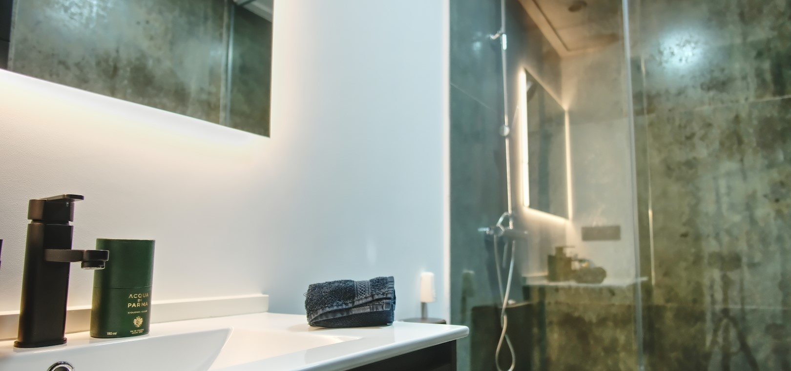 Het appartement beschikt over twee ruime slaapkamers, elk met ingebouwde kasten en een elegante eigen doucheruimte, waardoor u veel privacy en gemak ervaart.