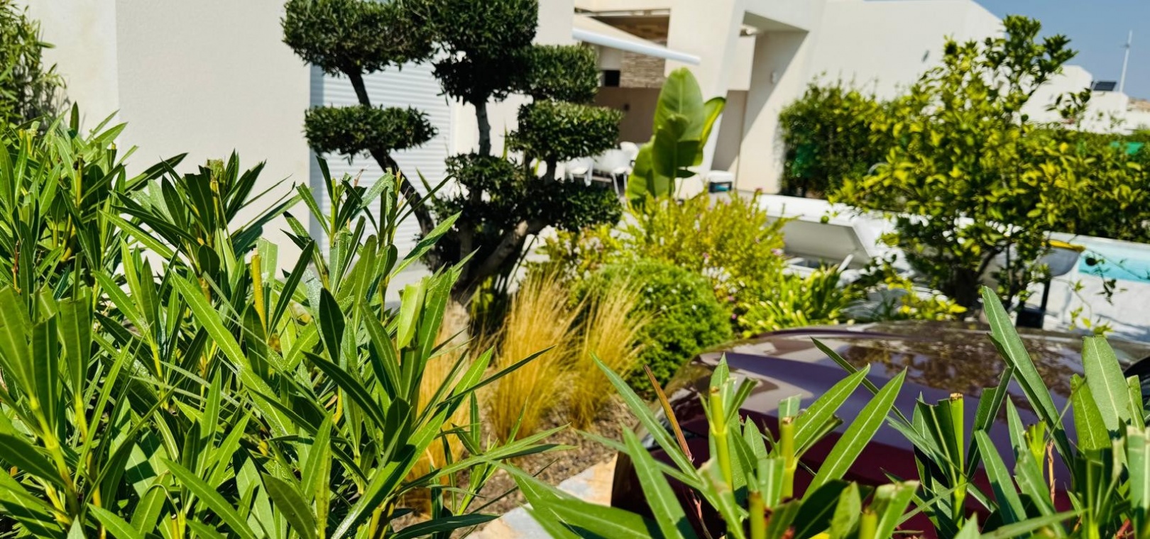 De prachtig aangelegde tuin, compleet met palmbomen, bloemen en fruitbomen, biedt privacy en comfort. Een terras op het oosten met een ingebouwde barbecue is ideaal om buiten te eten, terwijl het privézwembad met brede instaptreden perfect is om te ontspannen. Bewoners hebben ook toegang tot een groot gemeenschappelijk zwembad binnen het resort.
