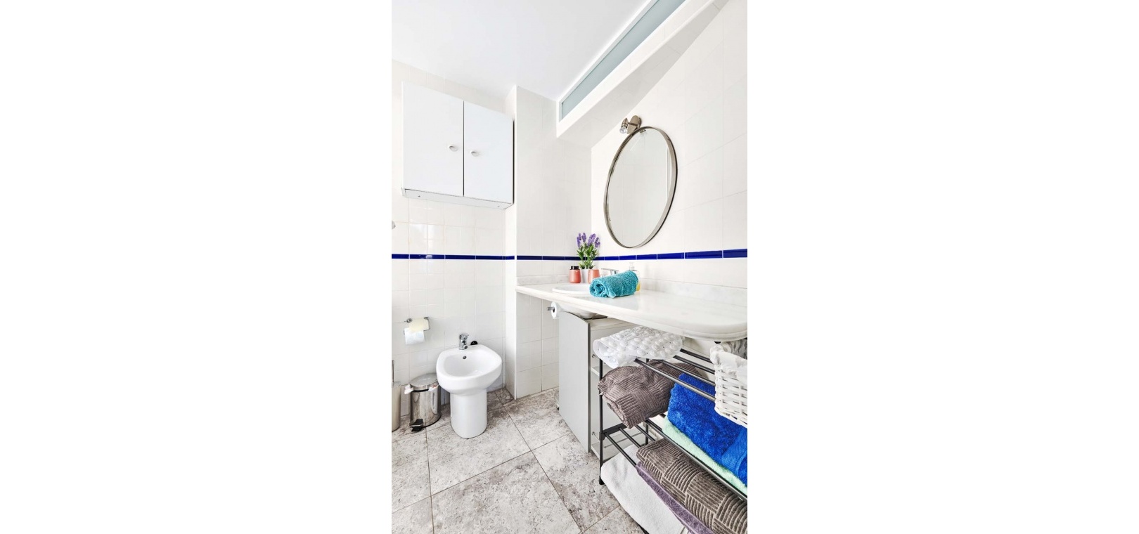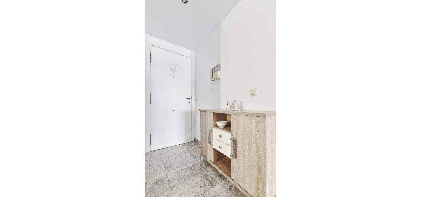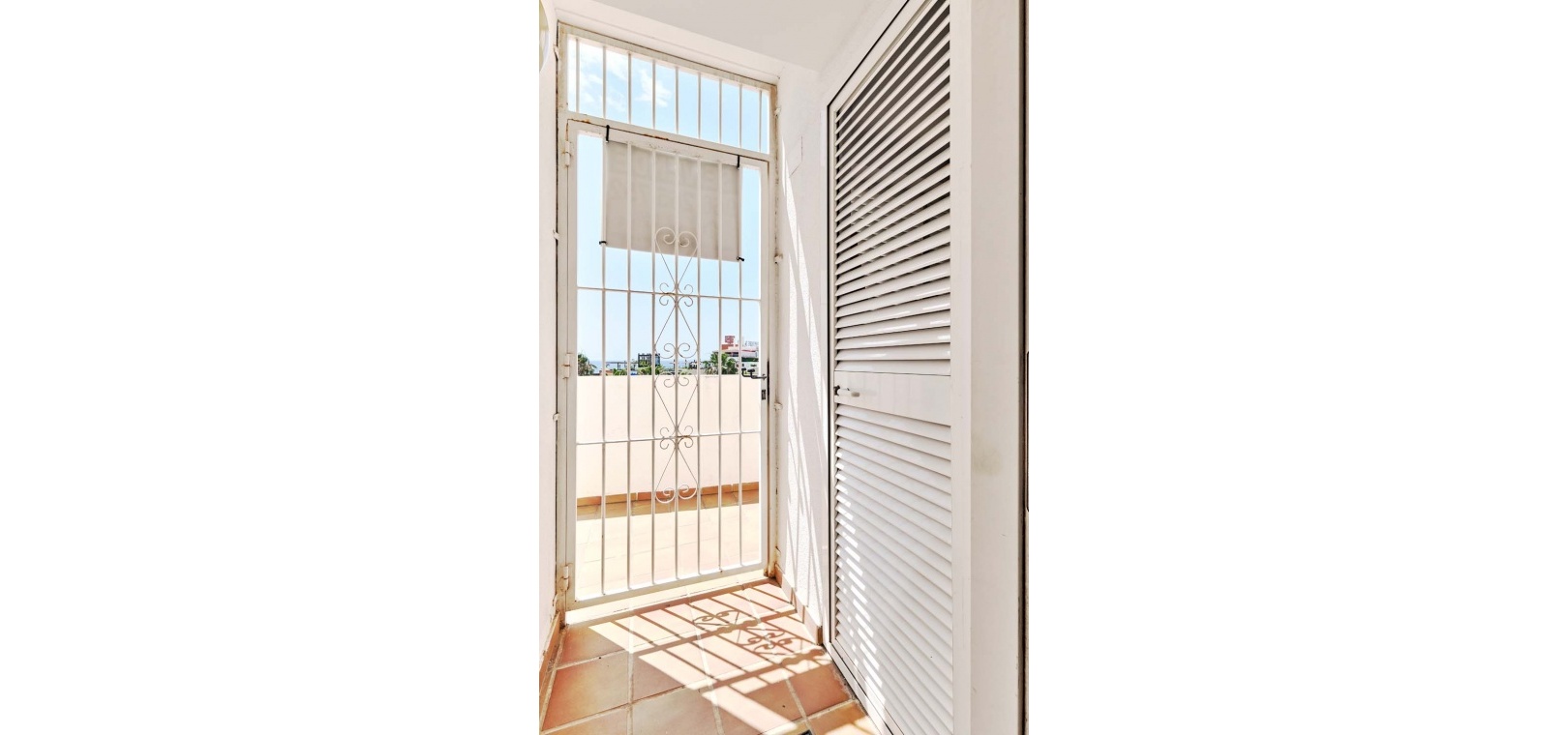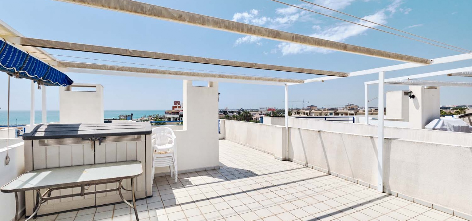 Een van de meest opvallende kenmerken is het grote privé-solarium, bereikbaar via een trap net buiten de ingang van het appartement. Vanaf hier geniet u van een spectaculair uitzicht op zee, met een zonnescherm dat schaduw biedt wanneer nodig – perfect om te ontspannen of gasten te ontvangen.
