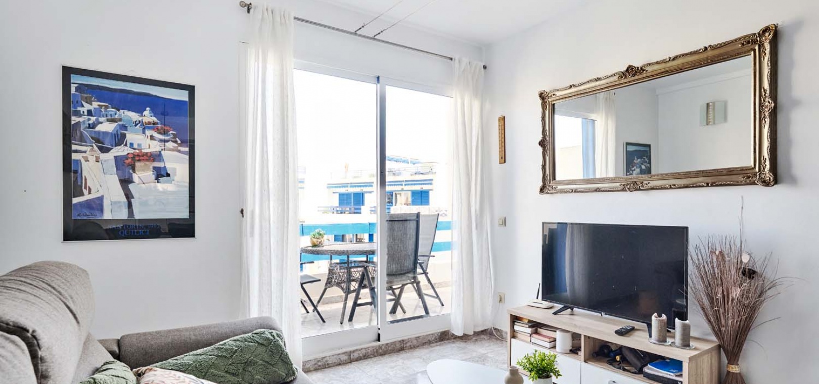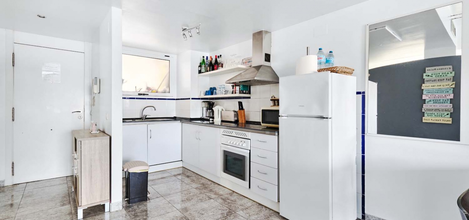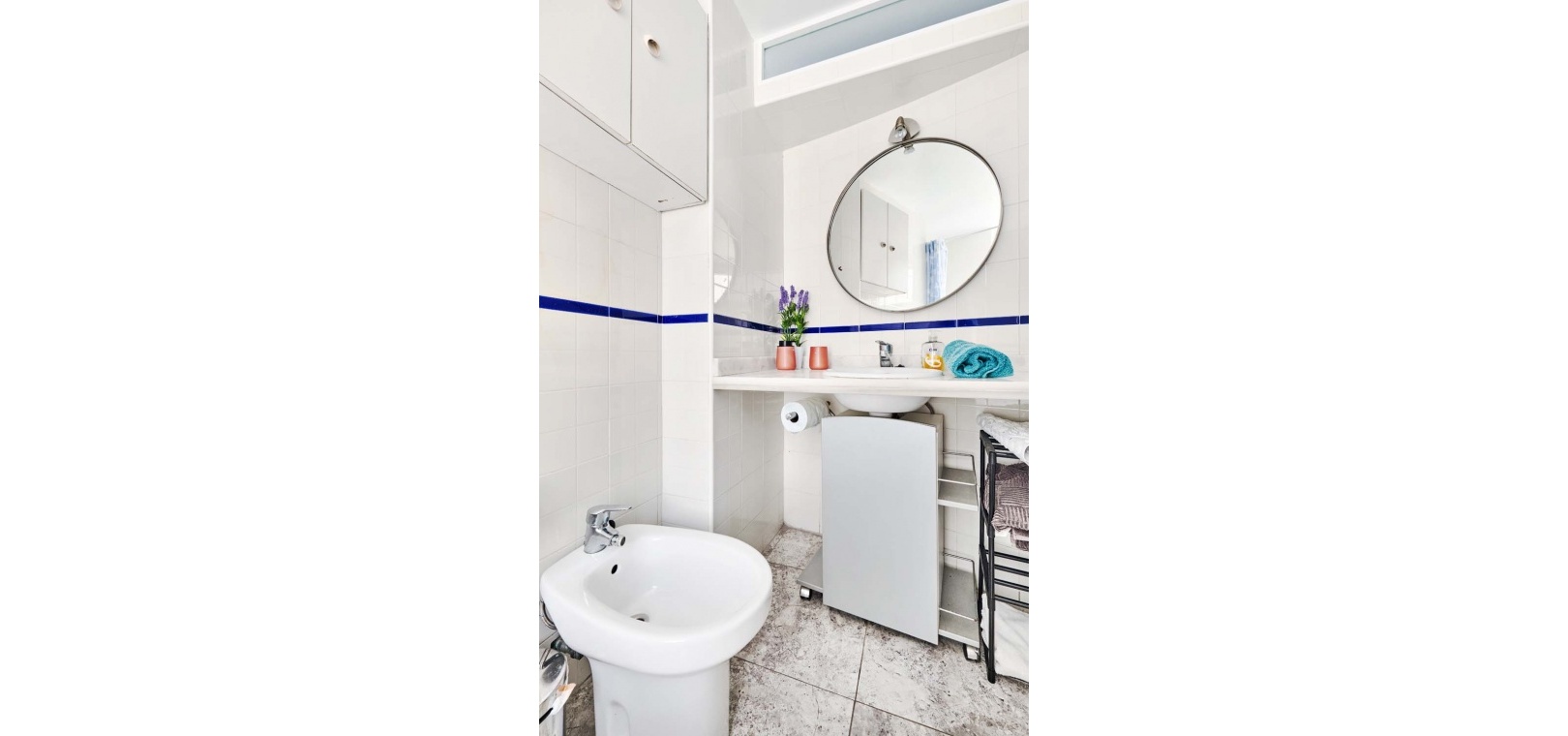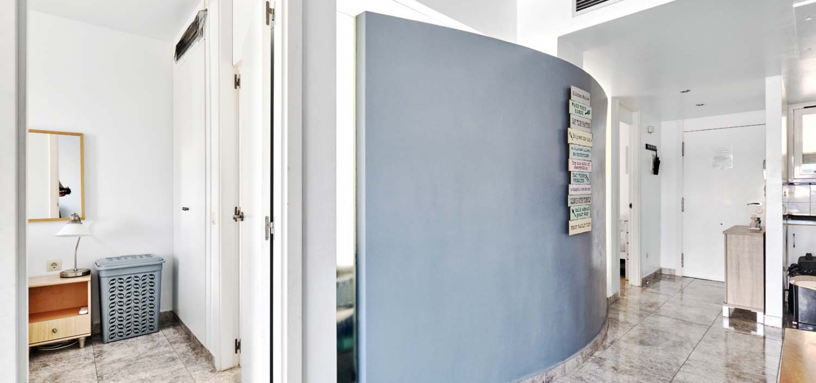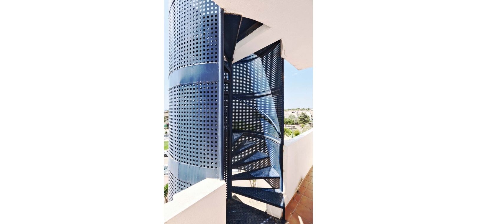 Een van de meest opvallende kenmerken is het grote privé-solarium, bereikbaar via een trap net buiten de ingang van het appartement. Vanaf hier geniet u van een spectaculair uitzicht op zee, met een zonnescherm dat schaduw biedt wanneer nodig – perfect om te ontspannen of gasten te ontvangen.