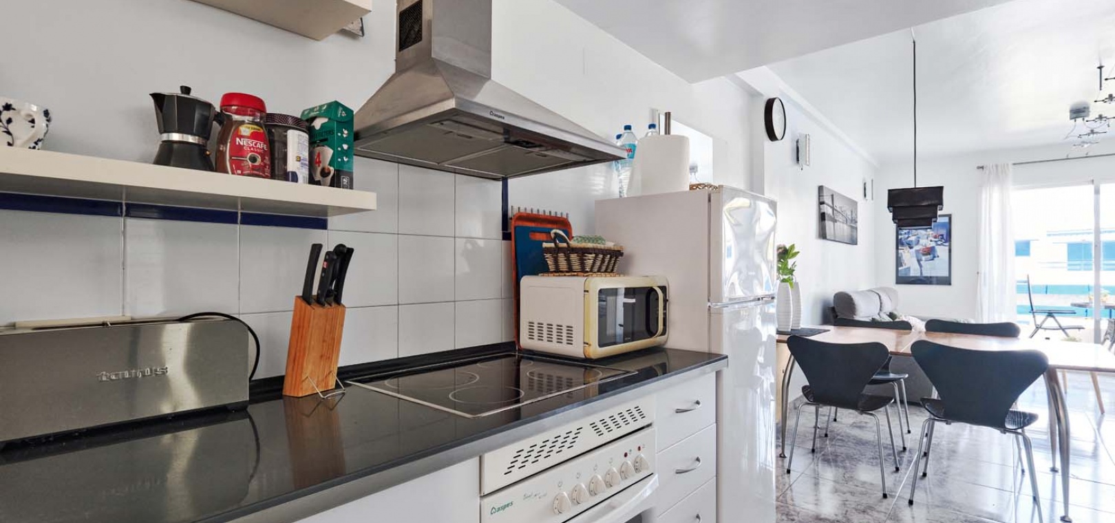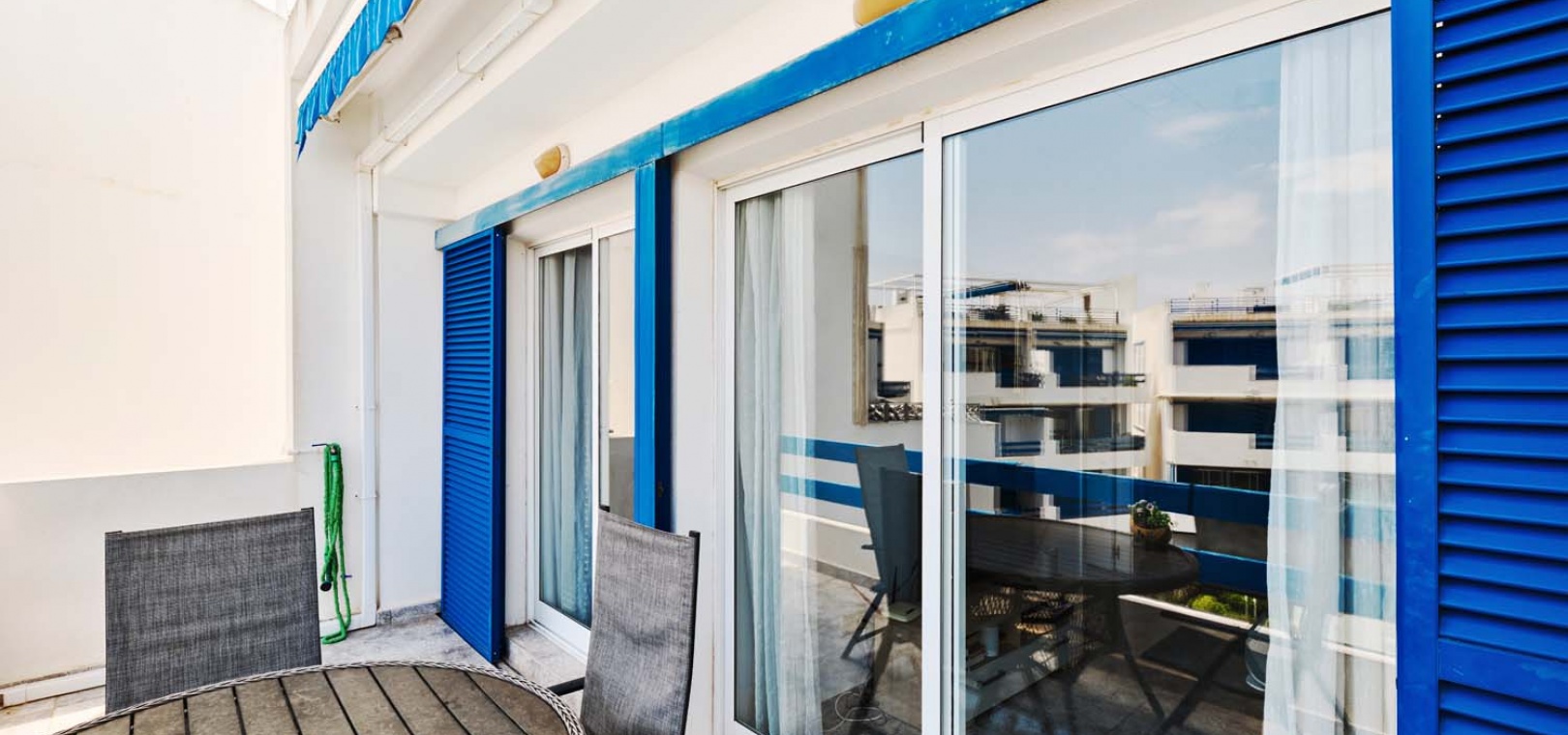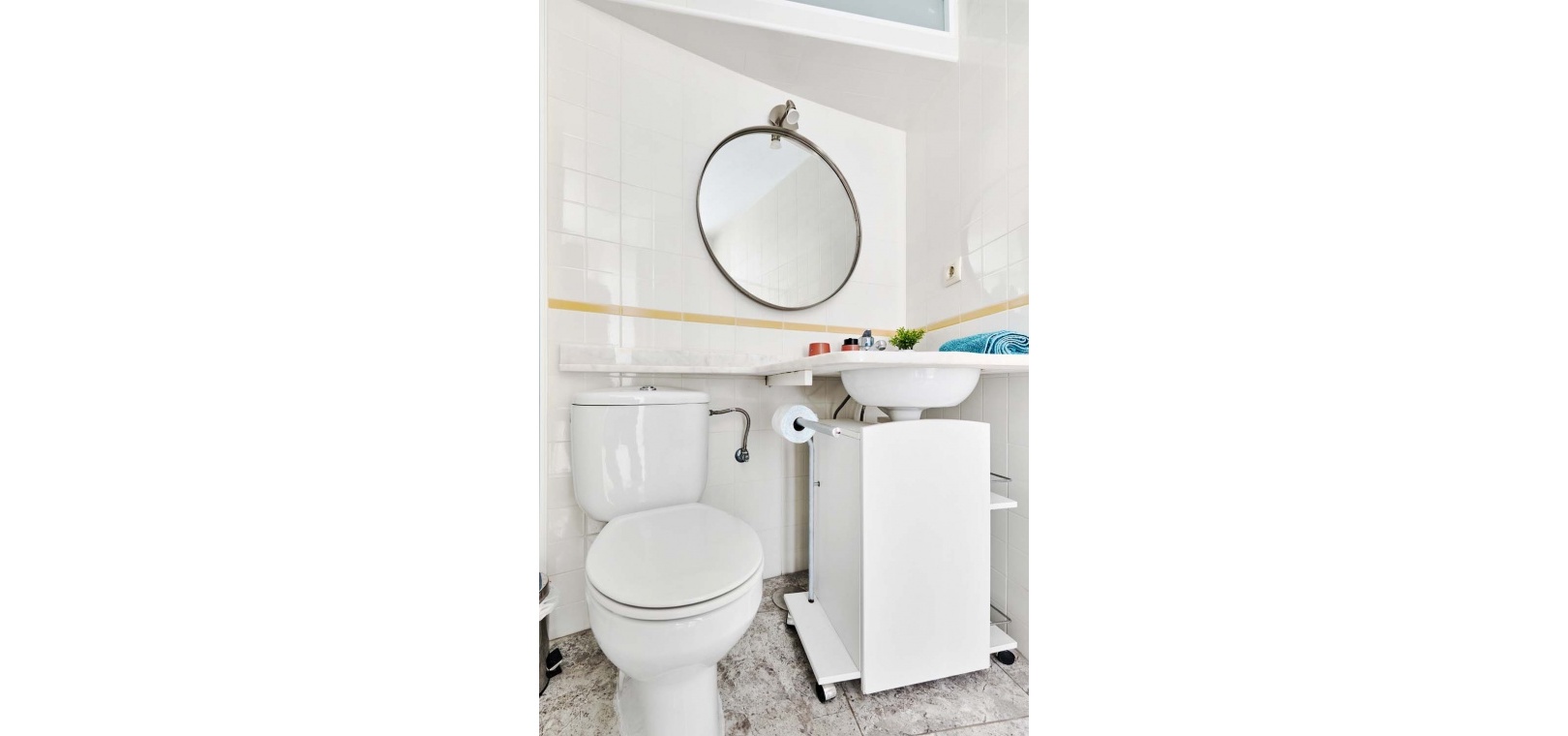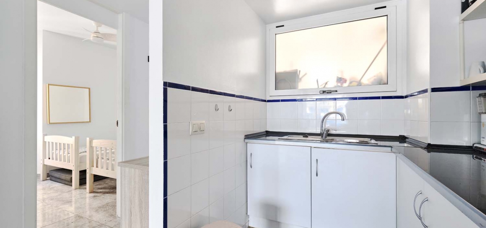 Een van de meest opvallende kenmerken is het grote privé-solarium, bereikbaar via een trap net buiten de ingang van het appartement. Vanaf hier geniet u van een spectaculair uitzicht op zee, met een zonnescherm dat schaduw biedt wanneer nodig – perfect om te ontspannen of gasten te ontvangen.