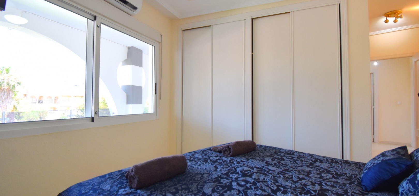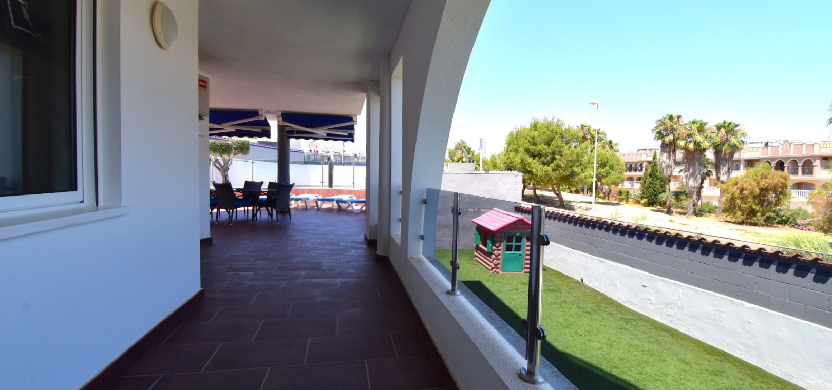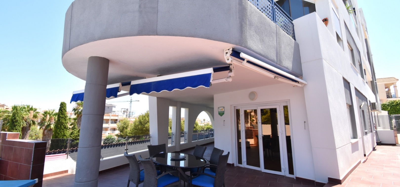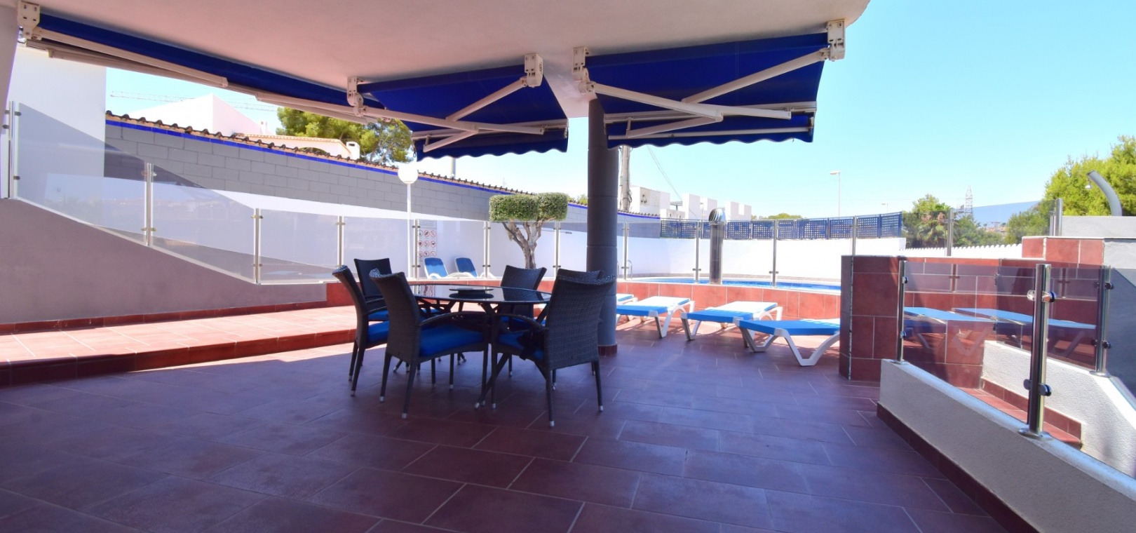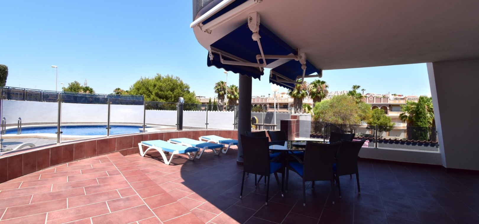 Met een oppervlakte van 99 m² beschikt het appartement over een lichte, open woonkamer met directe toegang tot een indrukwekkend, gedeeltelijk overdekt terras met uitzicht op het prachtige gemeenschappelijke zwembad . De moderne keuken is voorzien van een ontbijtbar en een aparte bijkeuken. Drie slaapkamers zijn voorzien van inbouwkasten. De hoofdslaapkamer biedt ook directe toegang tot het terras.