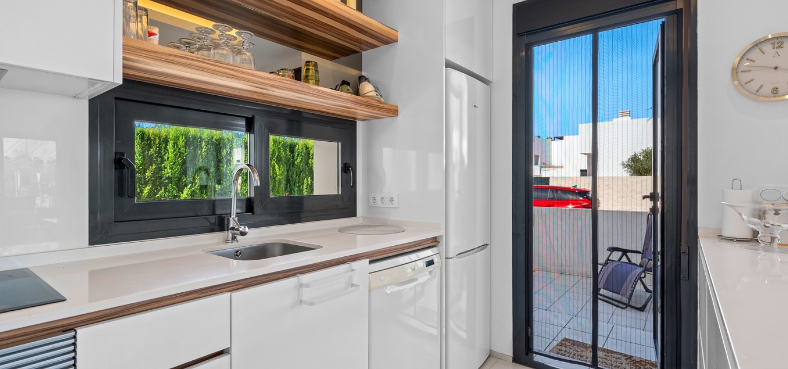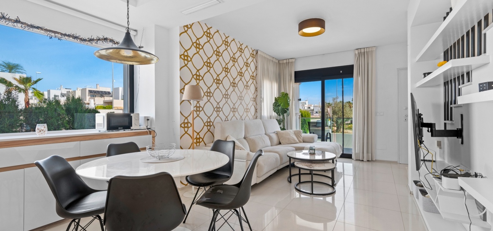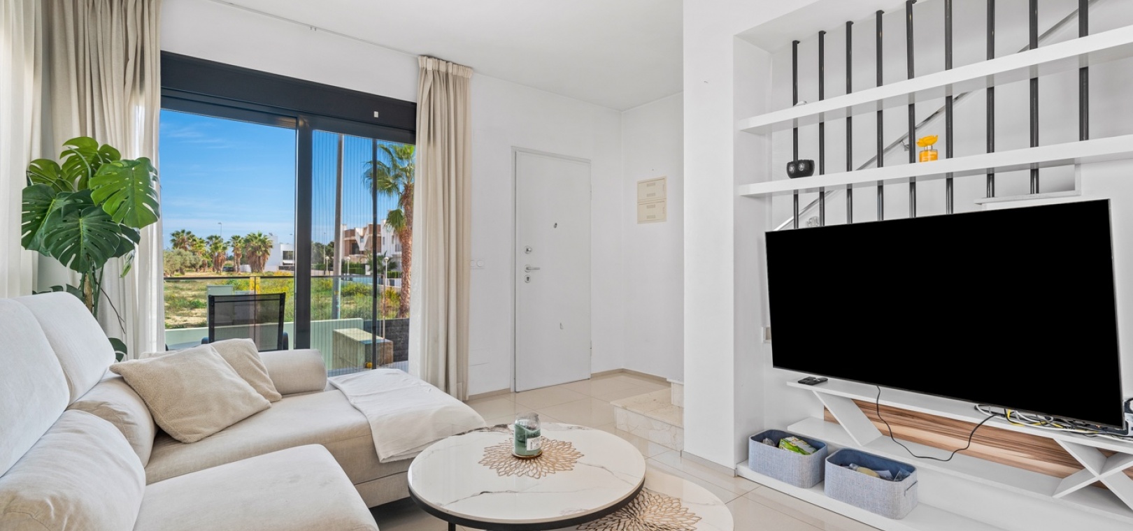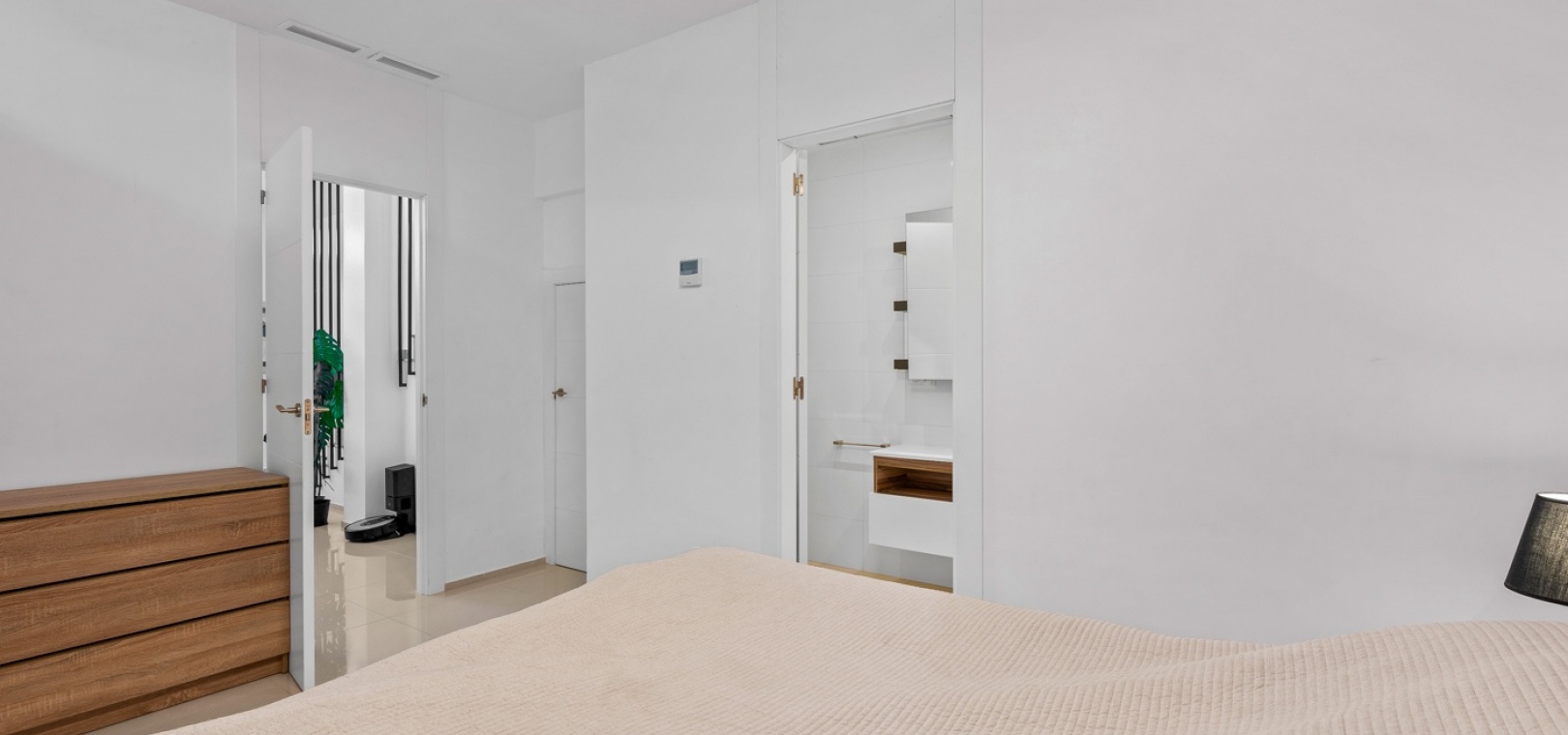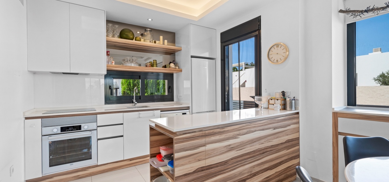 Het interieur is zorgvuldig ontworpen met functionaliteit en comfort in gedachten. Op de begane grond sluit een ruime woonkamer naadloos aan op een moderne open keuken. Beide ruimtes komen direct uit op de privétuin – de perfecte plek om te genieten van uw ochtendkoffie of te dineren bij zonsondergang in de warme Spaanse bries. Op deze verdieping bevinden zich ook een gastentoilet en een praktische bijkeuken.