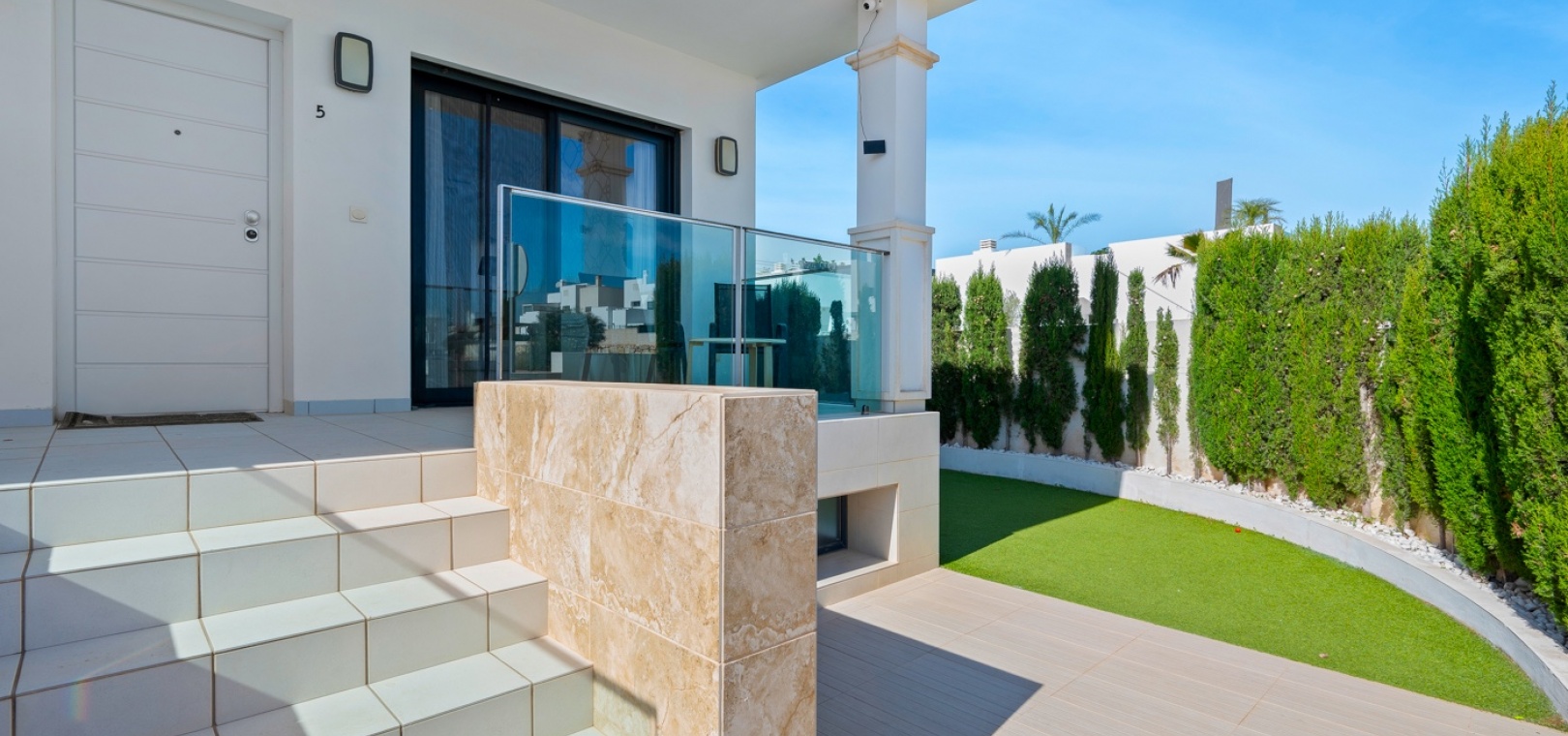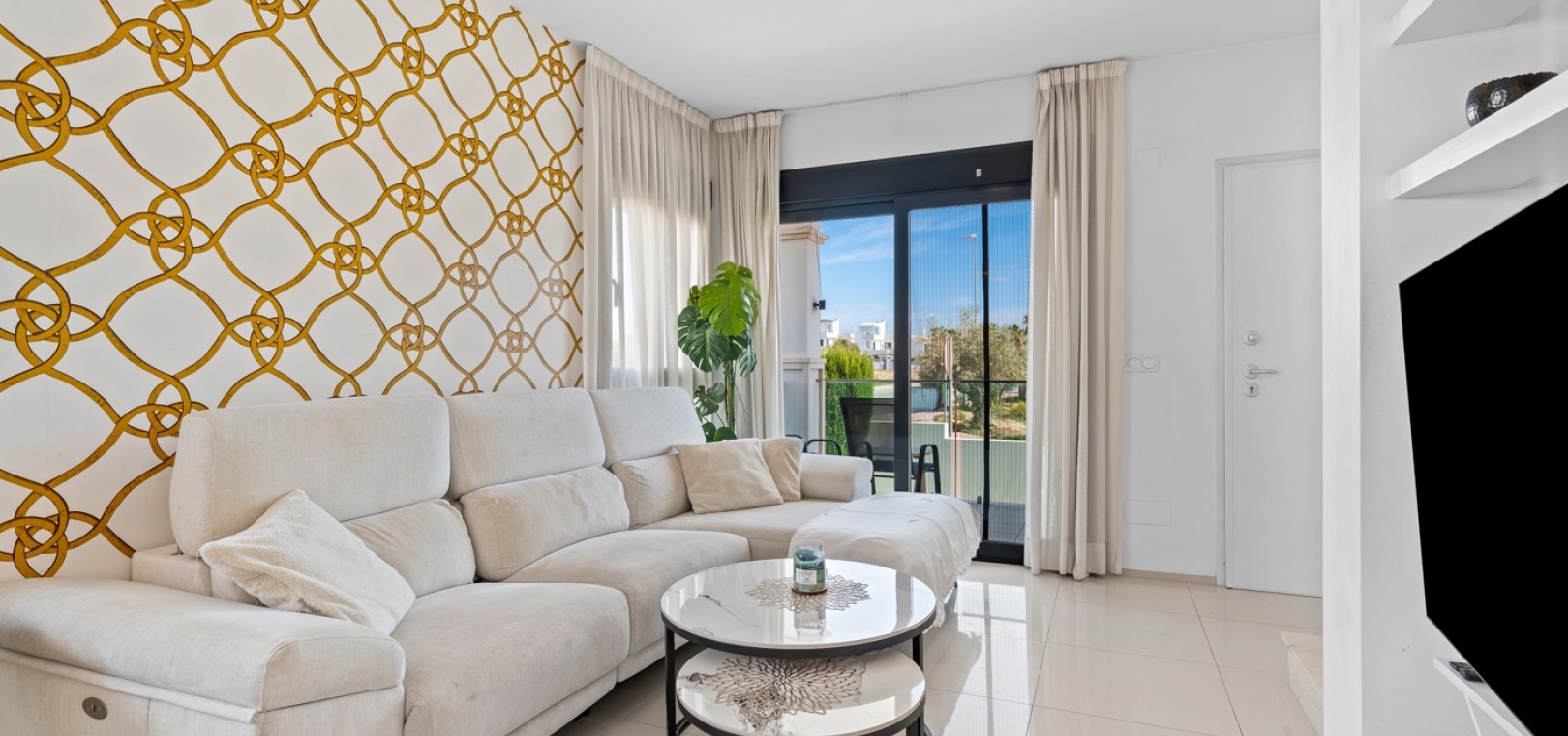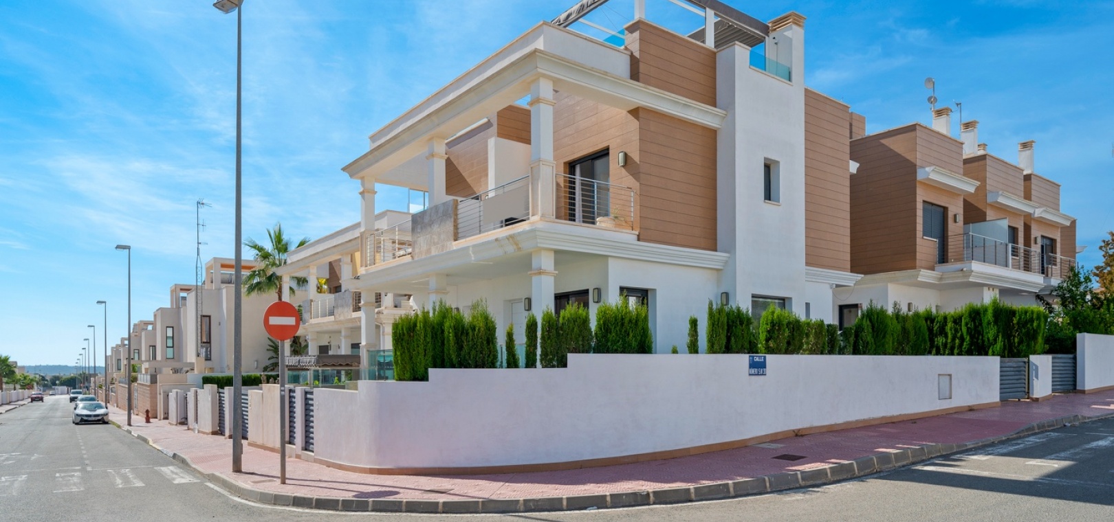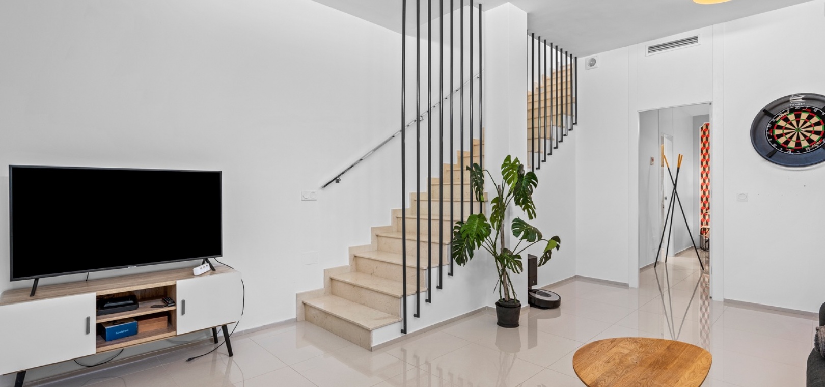 Het interieur is zorgvuldig ontworpen met functionaliteit en comfort in gedachten. Op de begane grond sluit een ruime woonkamer naadloos aan op een moderne open keuken. Beide ruimtes komen direct uit op de privétuin – de perfecte plek om te genieten van uw ochtendkoffie of te dineren bij zonsondergang in de warme Spaanse bries. Op deze verdieping bevinden zich ook een gastentoilet en een praktische bijkeuken.