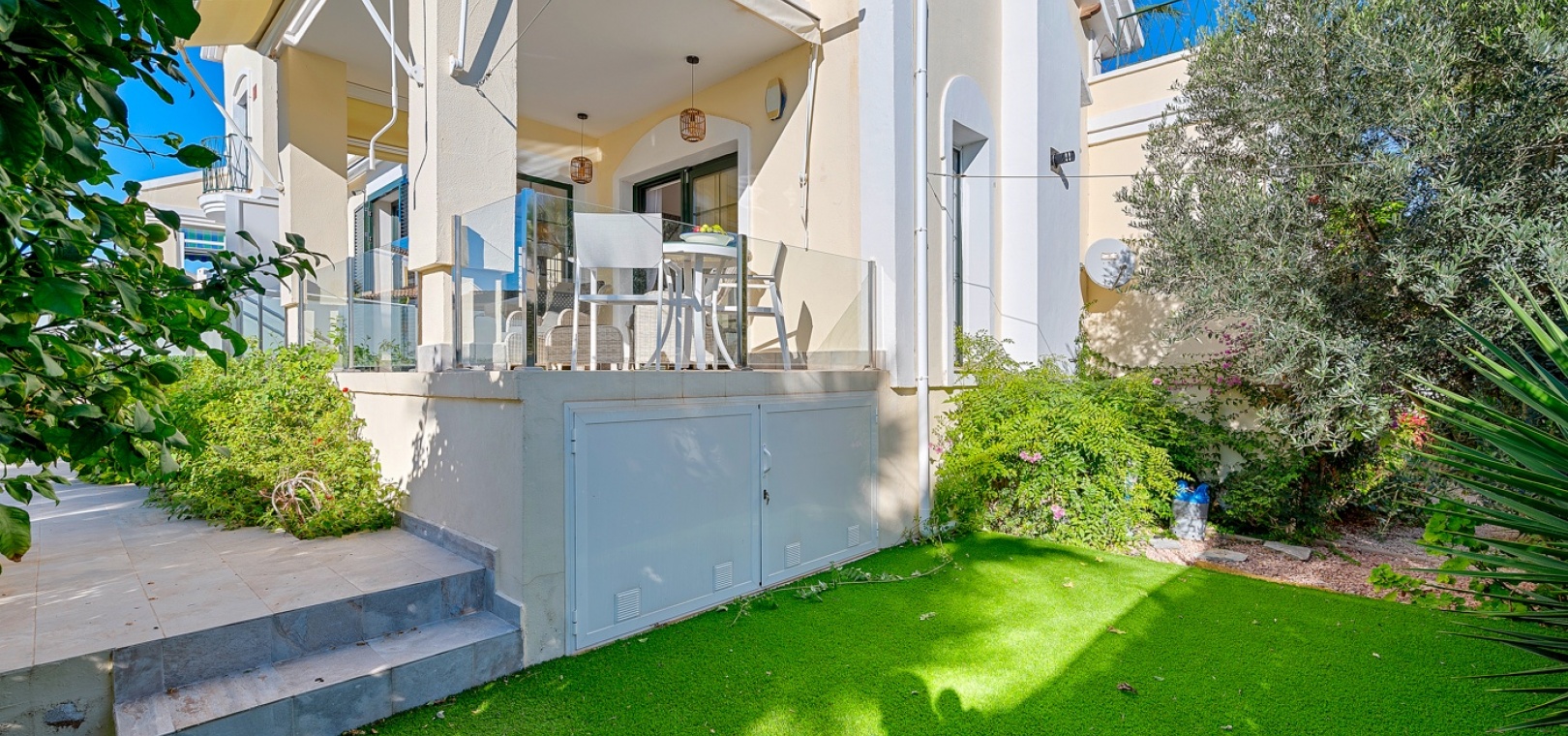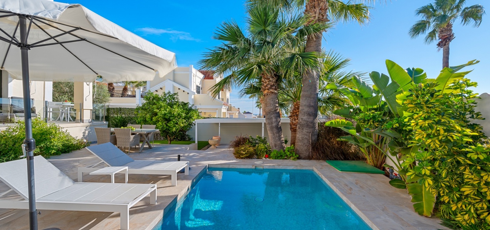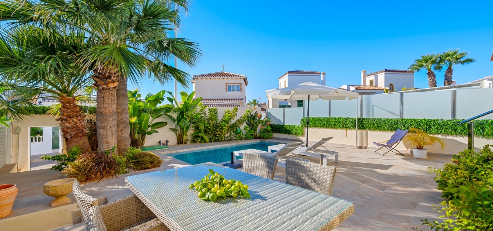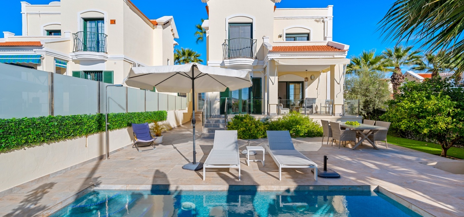 Gelegen op een perceel van 249 m² op het zuiden , biedt de buitenruimte veel privacy en diverse plekken om te ontspannen. Geniet van overvloedig natuurlijk licht , of u nu op het terras, in de tuin of bij het privézwembad bent . Het terras grenzend aan de woonkamer biedt een prachtig uitzicht op het zwembad en de zee .