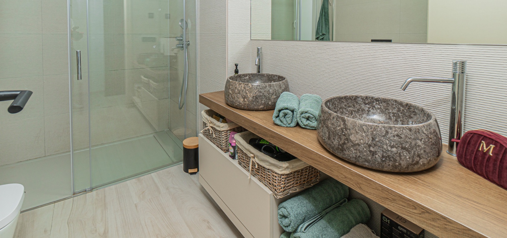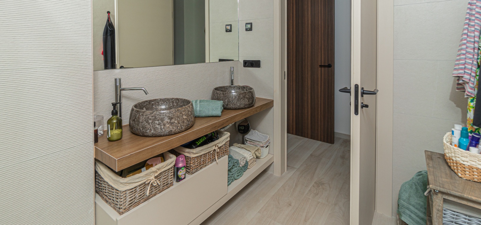 Er zijn drie slaapkamers, waarvan de hoofdslaapkamer beschikt over directe toegang tot de tuin en het zonneterras, een grote inloopkast met spiegels en een luxe badkamer met dubbele wastafel. De andere twee slaapkamers hebben inbouwkasten en delen een moderne badkamer met douche.