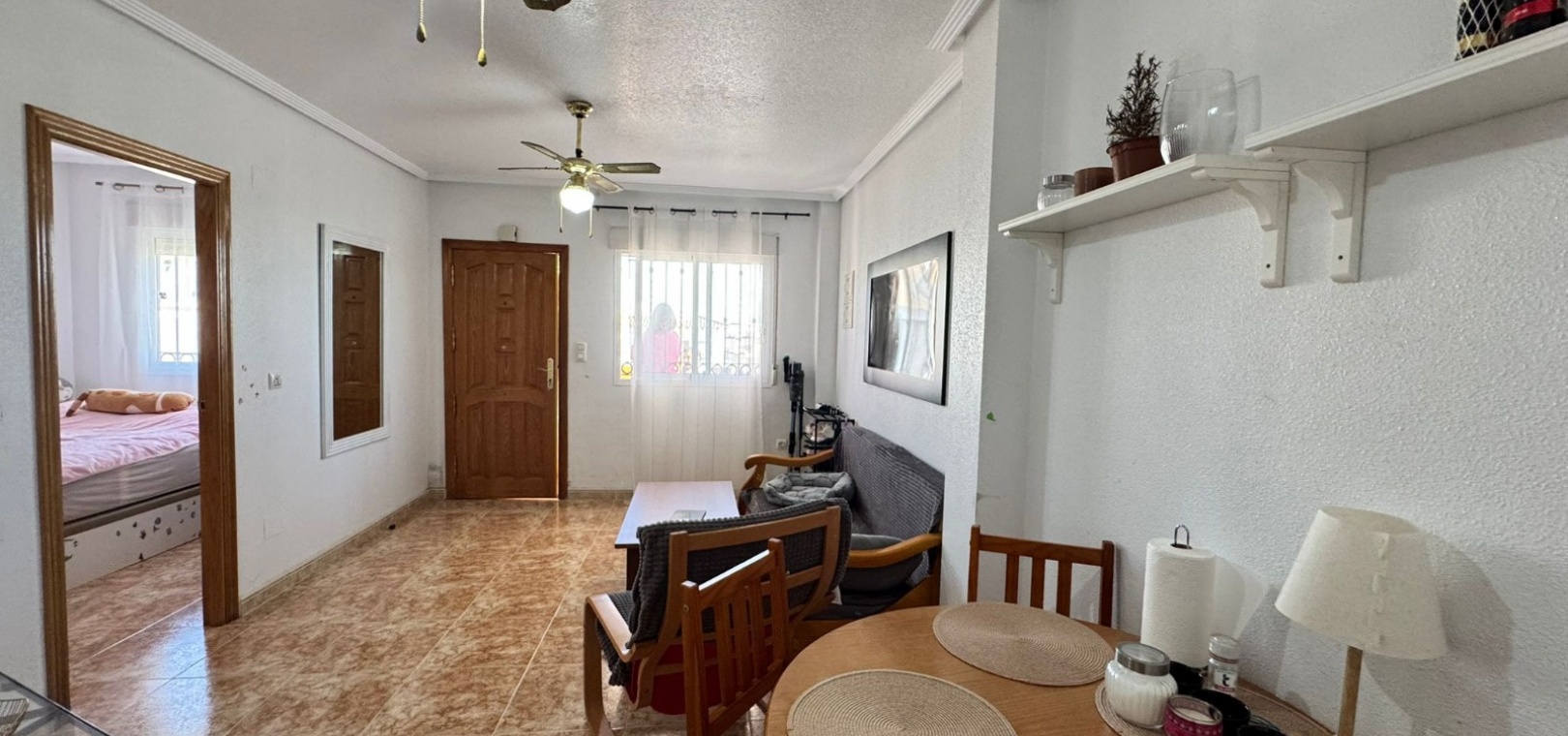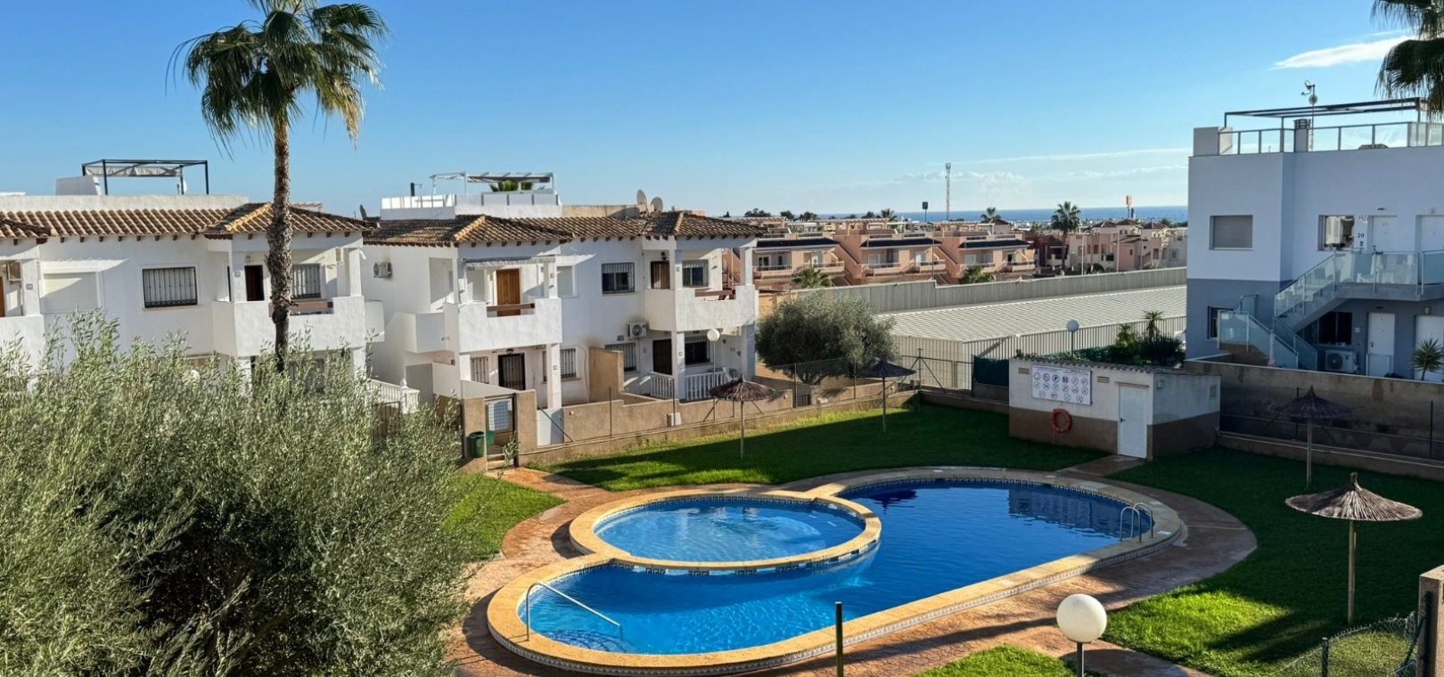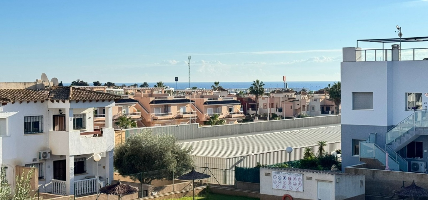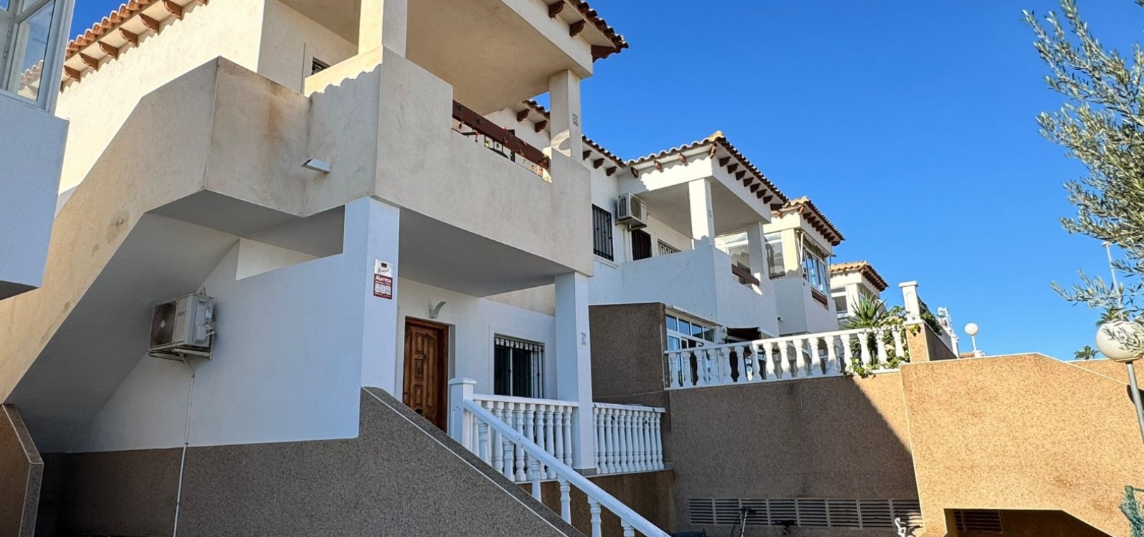 Dit te koop aangeboden appartement bevindt zich in het beveiligde complex Ciñuelica, dat bestaat uit rijtjeshuizen met een begane grond en een eerste verdieping (volgens de Spaanse normen "bajo" en "primer piso"). Het appartement is gelegen op de eerste verdieping ("primer piso"). De ingang is bereikbaar via een trap die leidt naar een klein balkon/terras met uitzicht op het zwembad, een perfecte plek om van de buitenlucht te genieten. Binnen beschikt het appartement over twee slaapkamers, een badkamer, een ruime woonkamer en een keuken met een aparte uitgang naar een solarium. Het solarium van 26 vierkante meter is ideaal om te zonnebaden, 's avonds te ontspannen of gasten buiten te ontvangen, en biedt een aangenaam uitzicht over het complex. Het appartement ligt op slechts 1,5 km van de zee, waardoor de stranden van Punta Prima gemakkelijk te bereiken zijn, terwijl de rust en privacy gewaarborgd blijven. Het grote winkelcentrum La Zenia Boulevard ligt op ongeveer 5 minuten rijden met de auto, het ziekenhuis van Torrevieja op ongeveer 10 minuten, het centrum van Torrevieja op ongeveer 8-10 minuten rijden en de dichtstbijzijnde luchthaven, Alicante, op circa 45 minuten afstand. Dit maakt deze woning zeer gunstig gelegen voor zowel vakanties als permanente bewoning. In de buurt vindt u restaurants, bars, supermarkten en haltes van het openbaar vervoer, waardoor alle nodige voorzieningen gemakkelijk bereikbaar zijn. Het Ciñuelica-complex beschikt tevens over een gemeenschappelijk zwembad, perfect om af te koelen na een zonnige dag of te ontspannen in een rustige omgeving. Dit appartement is ideaal voor zowel permanente bewoning als verhuur en combineert comfort, de veiligheid van een afgesloten complex, een uitstekende locatie en de nabijheid van de zee, wat zorgt voor fantastische recreatiemogelijkheden in Punta Prima en omgeving.