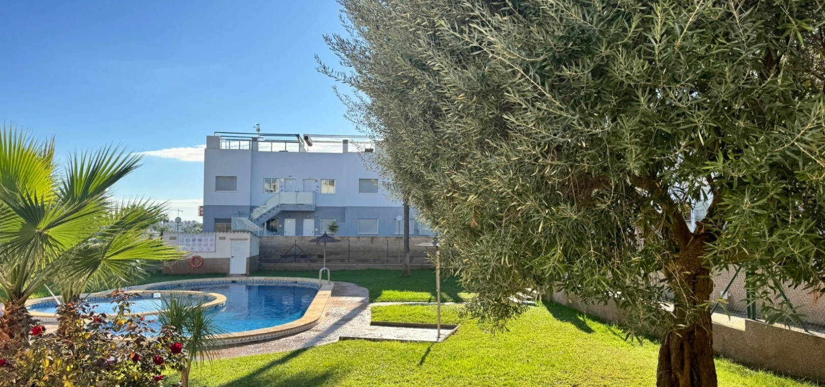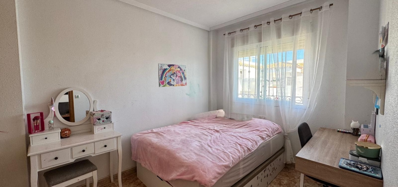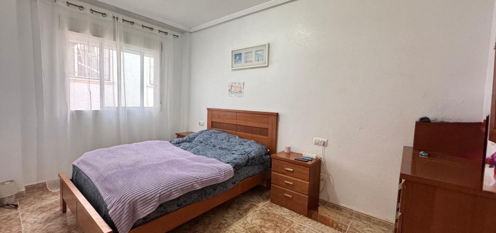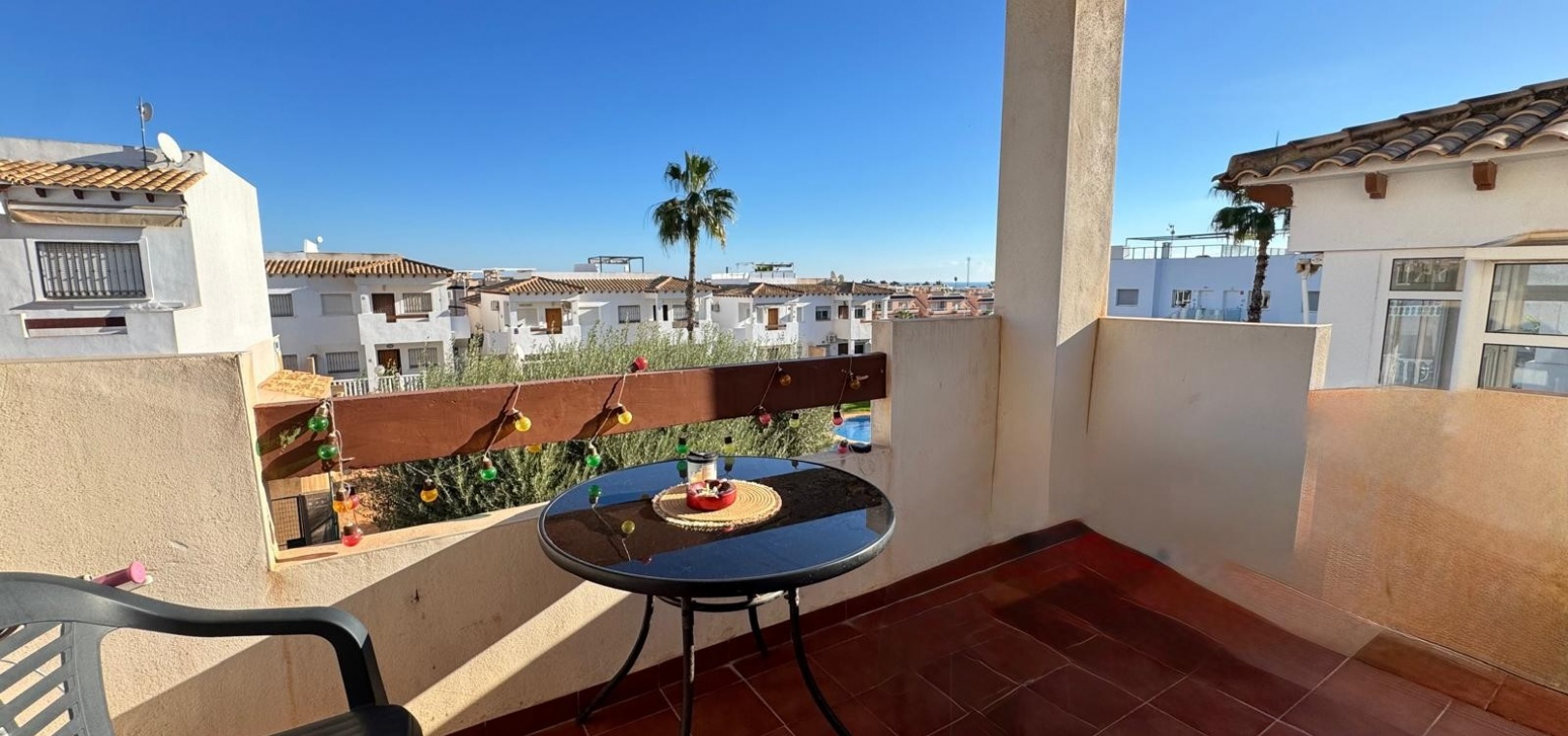 Dit te koop aangeboden appartement bevindt zich in het beveiligde complex Ciñuelica, dat bestaat uit rijtjeshuizen met een begane grond en een eerste verdieping (volgens de Spaanse normen "bajo" en "primer piso"). Het appartement is gelegen op de eerste verdieping ("primer piso"). De ingang is bereikbaar via een trap die leidt naar een klein balkon/terras met uitzicht op het zwembad, een perfecte plek om van de buitenlucht te genieten. Binnen beschikt het appartement over twee slaapkamers, een badkamer, een ruime woonkamer en een keuken met een aparte uitgang naar een solarium. Het solarium van 26 vierkante meter is ideaal om te zonnebaden, 's avonds te ontspannen of gasten buiten te ontvangen, en biedt een aangenaam uitzicht over het complex. Het appartement ligt op slechts 1,5 km van de zee, waardoor de stranden van Punta Prima gemakkelijk te bereiken zijn, terwijl de rust en privacy gewaarborgd blijven. Het grote winkelcentrum La Zenia Boulevard ligt op ongeveer 5 minuten rijden met de auto, het ziekenhuis van Torrevieja op ongeveer 10 minuten, het centrum van Torrevieja op ongeveer 8-10 minuten rijden en de dichtstbijzijnde luchthaven, Alicante, op circa 45 minuten afstand. Dit maakt deze woning zeer gunstig gelegen voor zowel vakanties als permanente bewoning. In de buurt vindt u restaurants, bars, supermarkten en haltes van het openbaar vervoer, waardoor alle nodige voorzieningen gemakkelijk bereikbaar zijn. Het Ciñuelica-complex beschikt tevens over een gemeenschappelijk zwembad, perfect om af te koelen na een zonnige dag of te ontspannen in een rustige omgeving. Dit appartement is ideaal voor zowel permanente bewoning als verhuur en combineert comfort, de veiligheid van een afgesloten complex, een uitstekende locatie en de nabijheid van de zee, wat zorgt voor fantastische recreatiemogelijkheden in Punta Prima en omgeving.