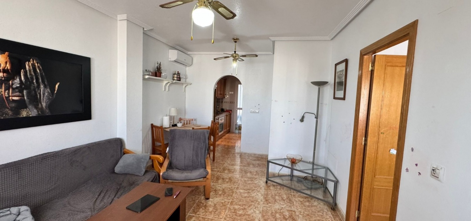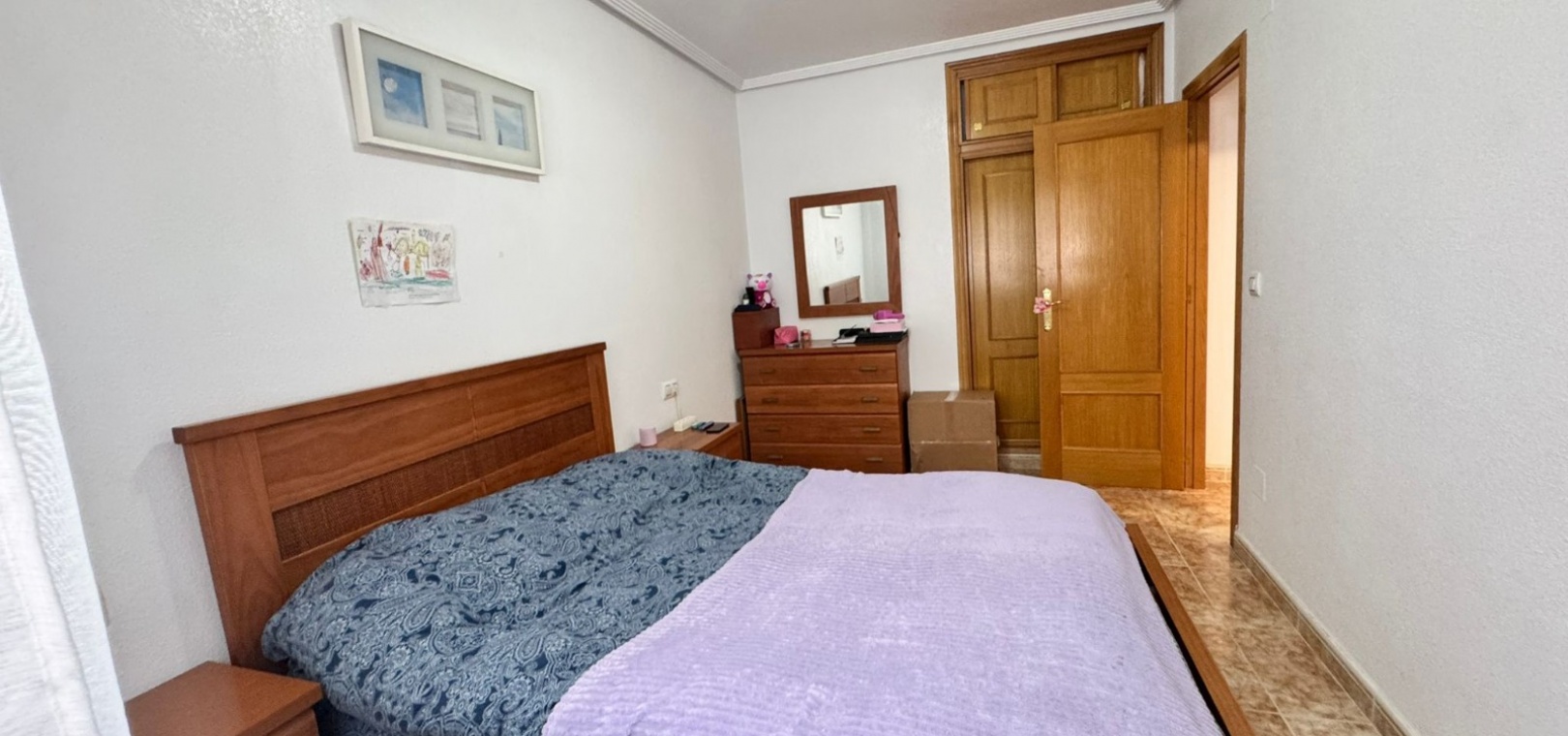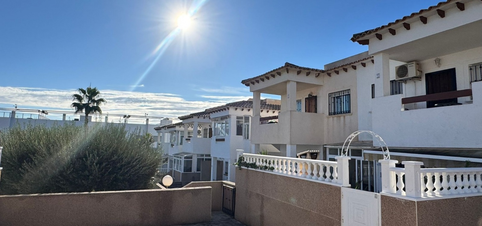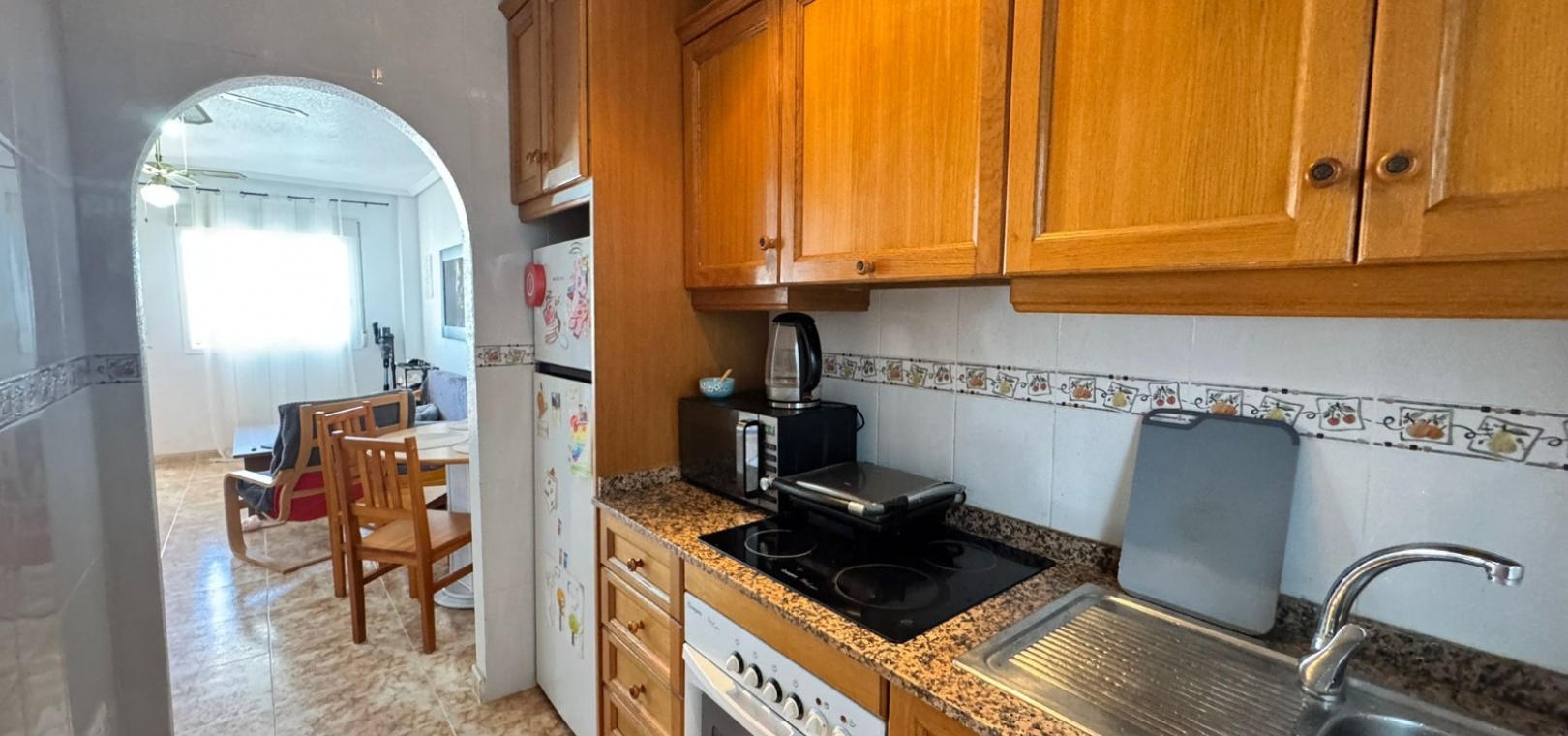 Dit te koop aangeboden appartement bevindt zich in het beveiligde complex Ciñuelica, dat bestaat uit rijtjeshuizen met een begane grond en een eerste verdieping (volgens de Spaanse normen "bajo" en "primer piso"). Het appartement is gelegen op de eerste verdieping ("primer piso"). De ingang is bereikbaar via een trap die leidt naar een klein balkon/terras met uitzicht op het zwembad, een perfecte plek om van de buitenlucht te genieten. Binnen beschikt het appartement over twee slaapkamers, een badkamer, een ruime woonkamer en een keuken met een aparte uitgang naar een solarium. Het solarium van 26 vierkante meter is ideaal om te zonnebaden, 's avonds te ontspannen of gasten buiten te ontvangen, en biedt een aangenaam uitzicht over het complex. Het appartement ligt op slechts 1,5 km van de zee, waardoor de stranden van Punta Prima gemakkelijk te bereiken zijn, terwijl de rust en privacy gewaarborgd blijven. Het grote winkelcentrum La Zenia Boulevard ligt op ongeveer 5 minuten rijden met de auto, het ziekenhuis van Torrevieja op ongeveer 10 minuten, het centrum van Torrevieja op ongeveer 8-10 minuten rijden en de dichtstbijzijnde luchthaven, Alicante, op circa 45 minuten afstand. Dit maakt deze woning zeer gunstig gelegen voor zowel vakanties als permanente bewoning. In de buurt vindt u restaurants, bars, supermarkten en haltes van het openbaar vervoer, waardoor alle nodige voorzieningen gemakkelijk bereikbaar zijn. Het Ciñuelica-complex beschikt tevens over een gemeenschappelijk zwembad, perfect om af te koelen na een zonnige dag of te ontspannen in een rustige omgeving. Dit appartement is ideaal voor zowel permanente bewoning als verhuur en combineert comfort, de veiligheid van een afgesloten complex, een uitstekende locatie en de nabijheid van de zee, wat zorgt voor fantastische recreatiemogelijkheden in Punta Prima en omgeving.