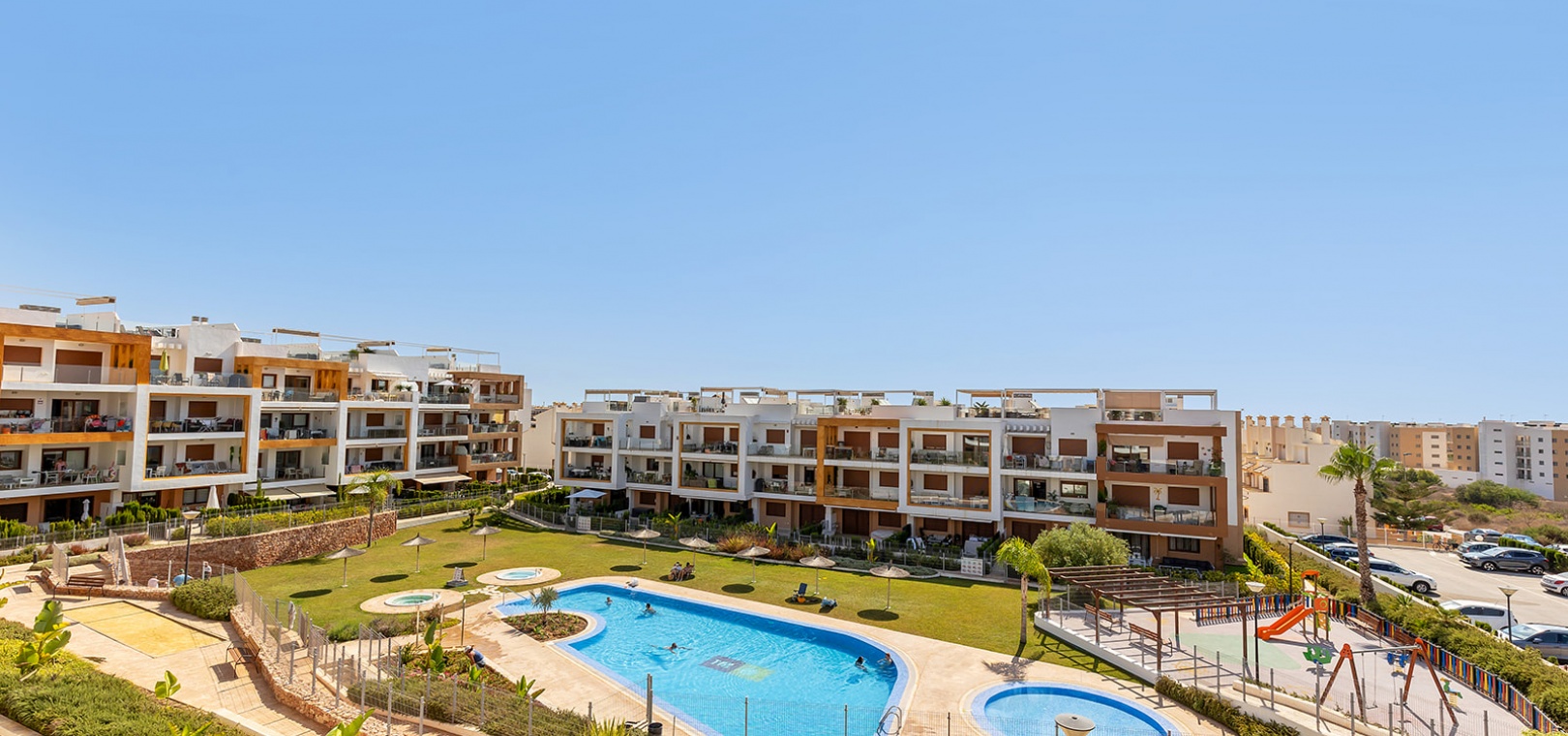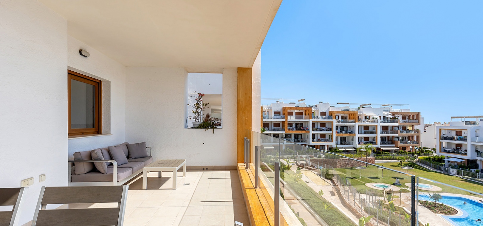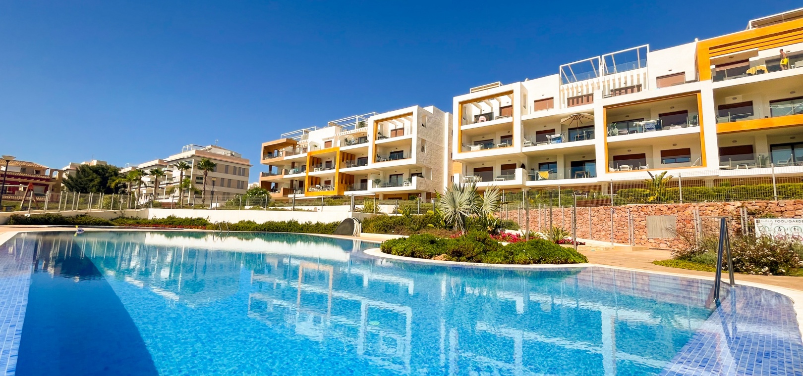 Gelegen in het exclusieve wooncomplex 'Gala' kunnen bewoners genieten van fantastische voorzieningen zoals een gemeenschappelijk zwembad, jacuzzi en goed onderhouden tuinen. Het appartement beschikt ook over een eigen parkeerplaats voor extra gemak.