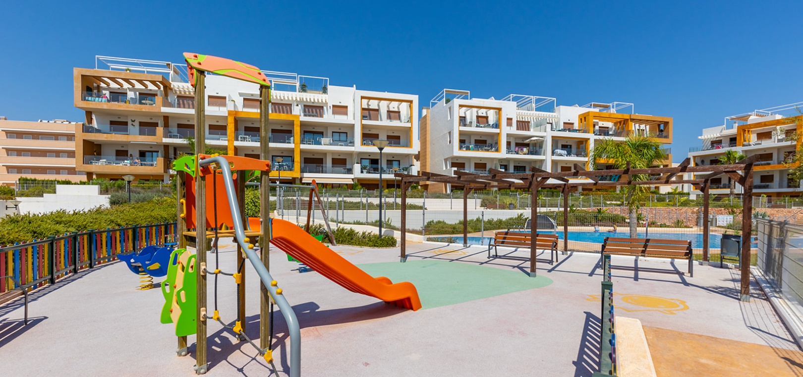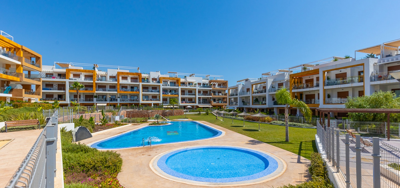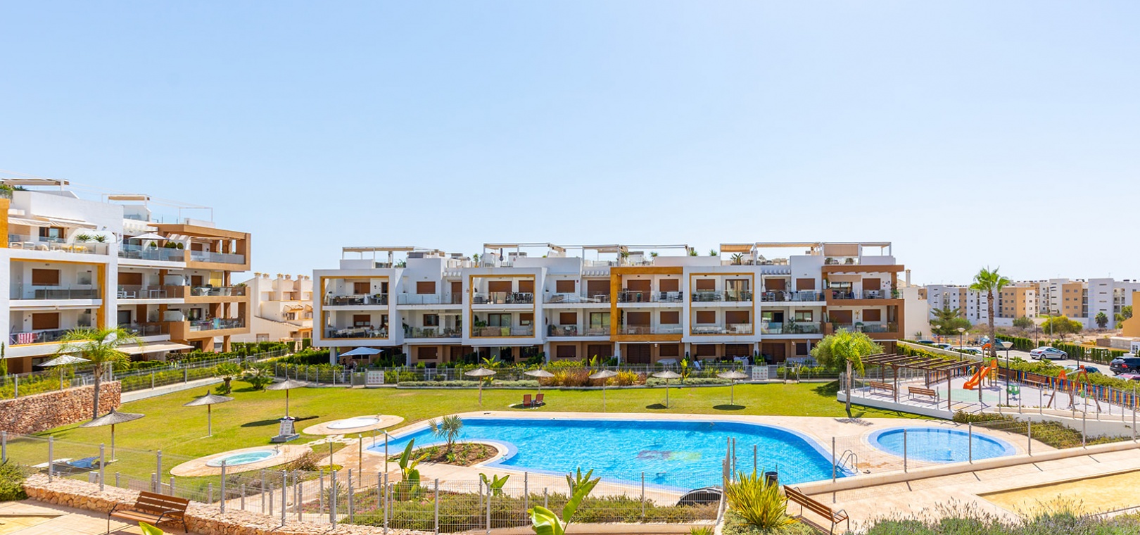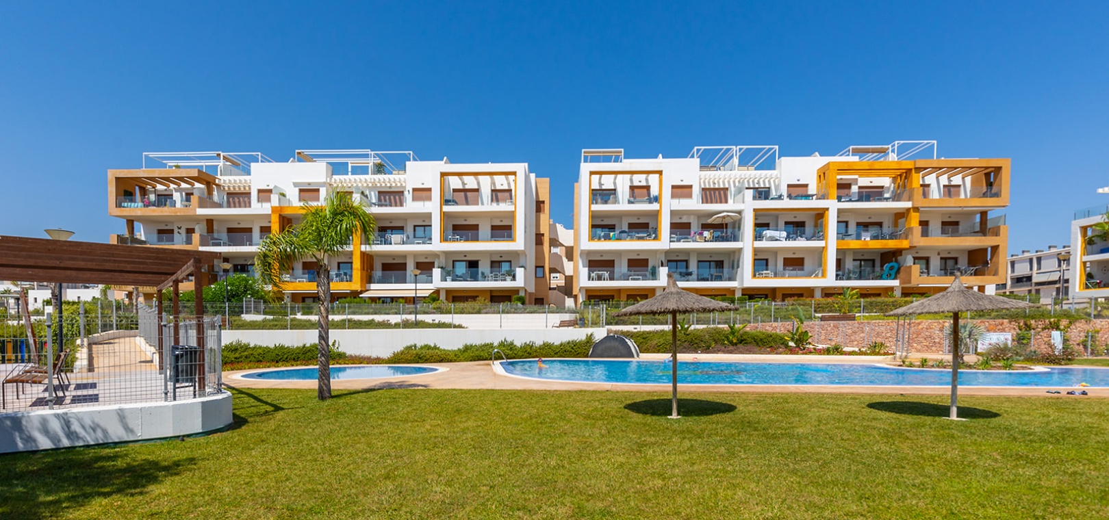 Gelegen in het exclusieve wooncomplex 'Gala' kunnen bewoners genieten van fantastische voorzieningen zoals een gemeenschappelijk zwembad, jacuzzi en goed onderhouden tuinen. Het appartement beschikt ook over een eigen parkeerplaats voor extra gemak.