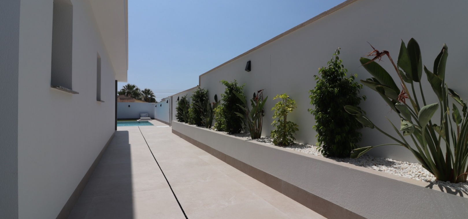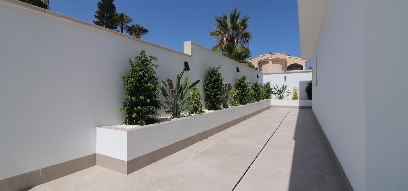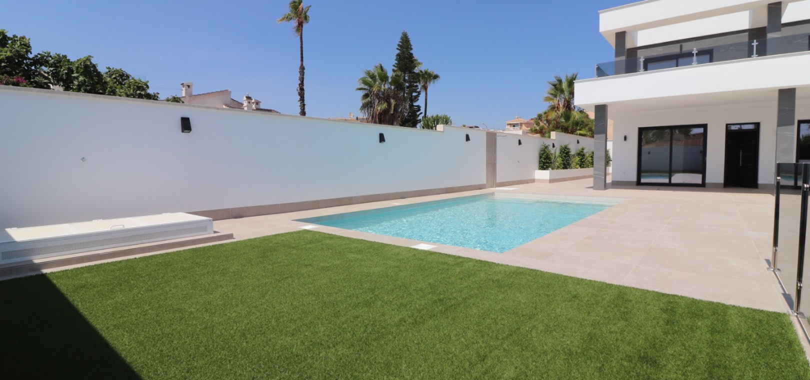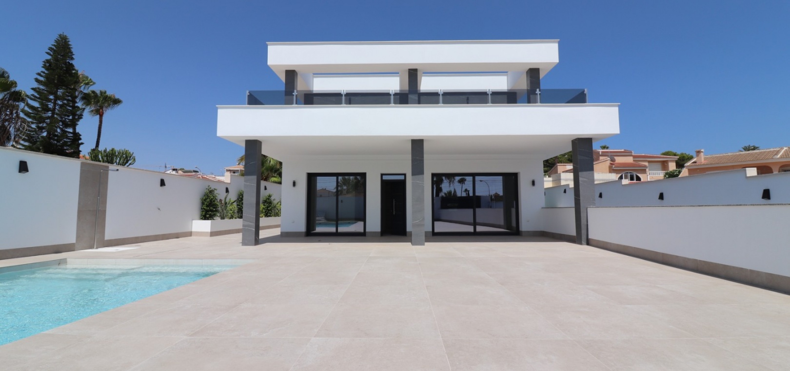 Sleutelklaar en instapklaar 311 m² bebouwd over drie verdiepingen op een privéperceel van 550 m² Drie tweepersoonsslaapkamers, elk met een eigen badkamer met douche Extra gastentoilet op de begane grond Lichte, open woon- en eetkamer met grote schuifdeuren Moderne ingerichte keuken met aparte bijkeuken Vloerverwarming door het hele huis met individuele kamerthermostaten Geïntegreerde airconditioning Voorinstallatie voor zonnepanelen en opladen elektrische auto's Ruim boventerras met directe toegang vanuit de slaapkamers Privézwembad van 8 x 4 meter Aangelegde, onderhoudsarme tuin met kunstgras en verhoogde plantenbakken Veilig, ommuurd perceel met elektrische opritpoort Grote onderbouw met interne toegang en ruimte voor meerdere voertuigen of verdere ontwikkeling