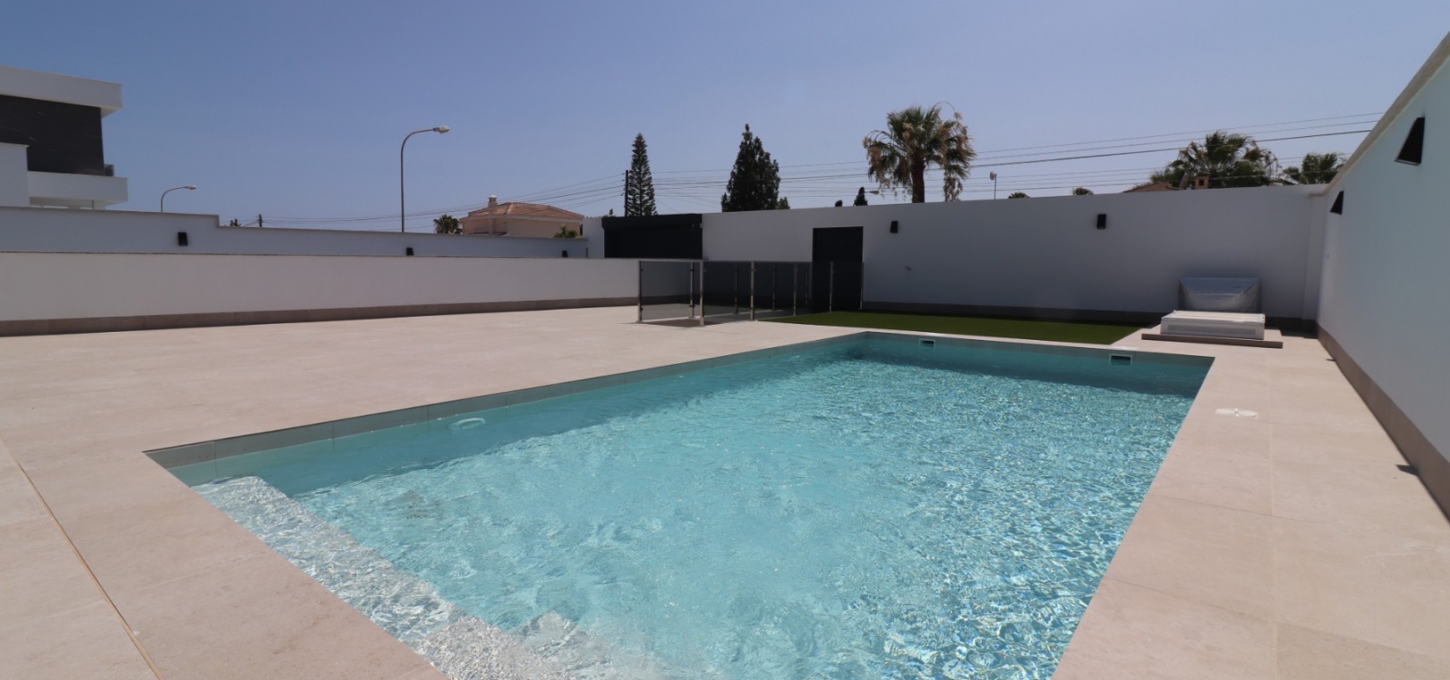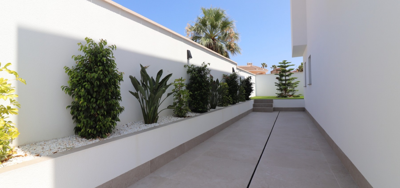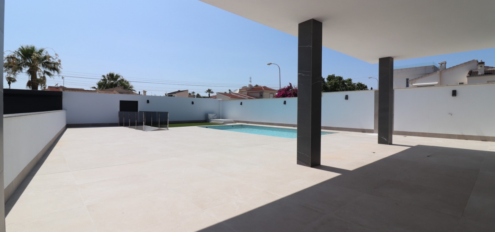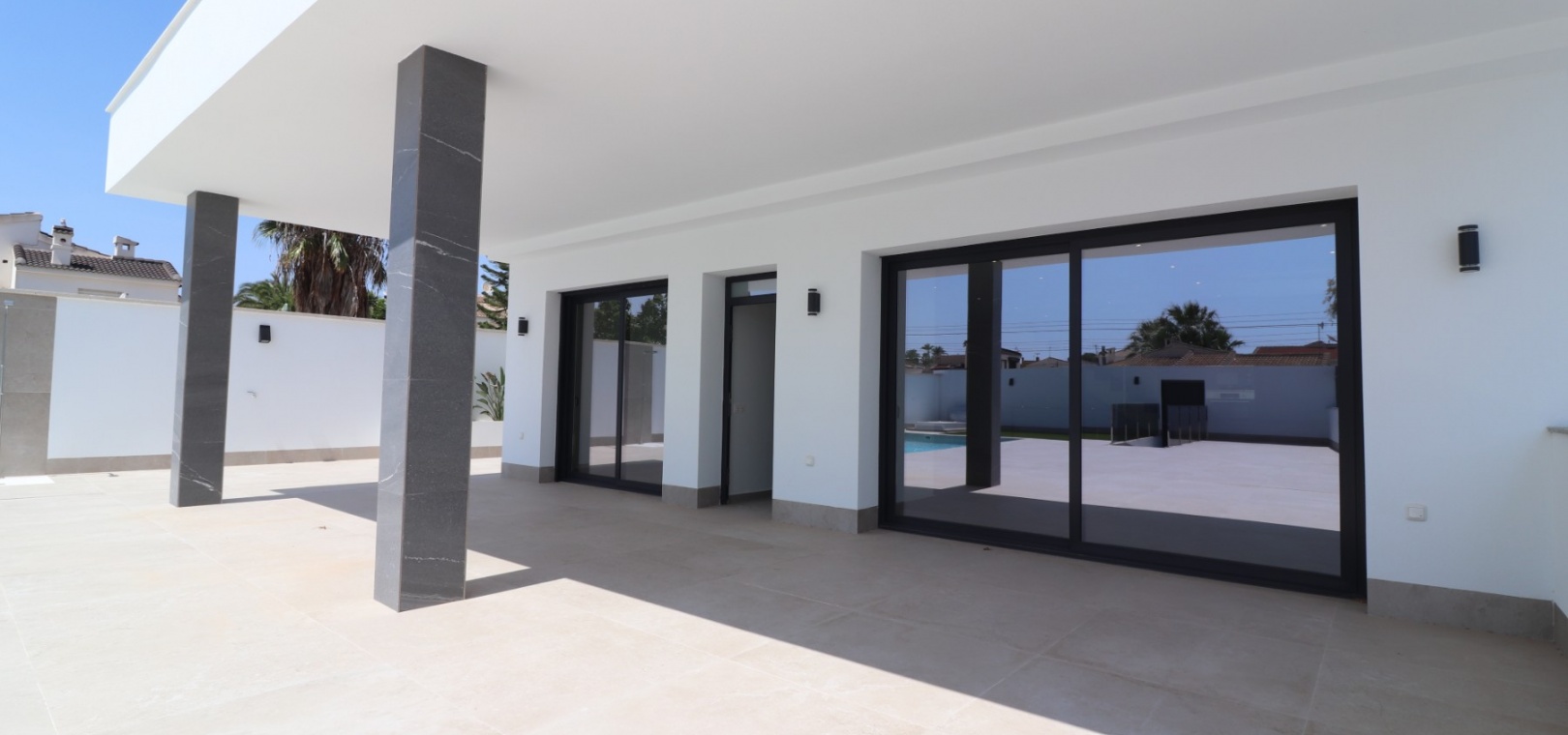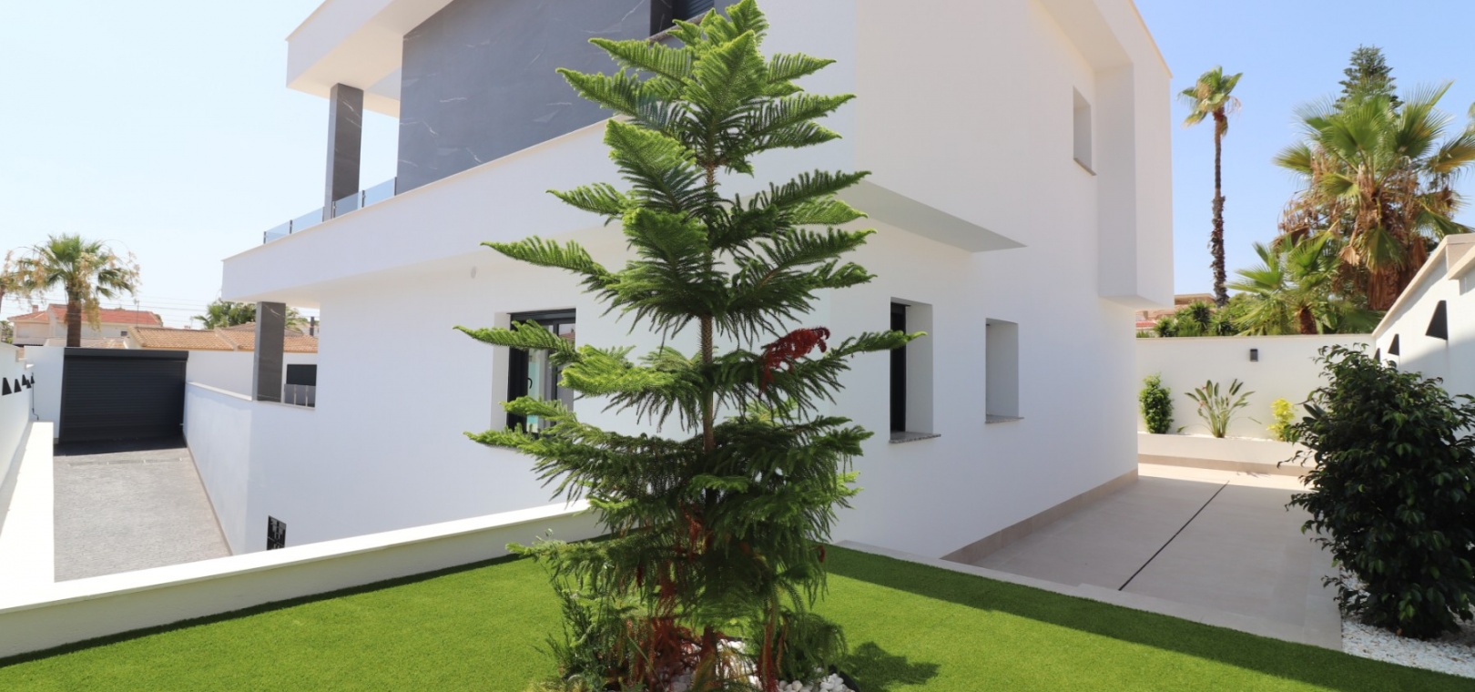 Sleutelklaar en instapklaar 311 m² bebouwd over drie verdiepingen op een privéperceel van 550 m² Drie tweepersoonsslaapkamers, elk met een eigen badkamer met douche Extra gastentoilet op de begane grond Lichte, open woon- en eetkamer met grote schuifdeuren Moderne ingerichte keuken met aparte bijkeuken Vloerverwarming door het hele huis met individuele kamerthermostaten Geïntegreerde airconditioning Voorinstallatie voor zonnepanelen en opladen elektrische auto's Ruim boventerras met directe toegang vanuit de slaapkamers Privézwembad van 8 x 4 meter Aangelegde, onderhoudsarme tuin met kunstgras en verhoogde plantenbakken Veilig, ommuurd perceel met elektrische opritpoort Grote onderbouw met interne toegang en ruimte voor meerdere voertuigen of verdere ontwikkeling