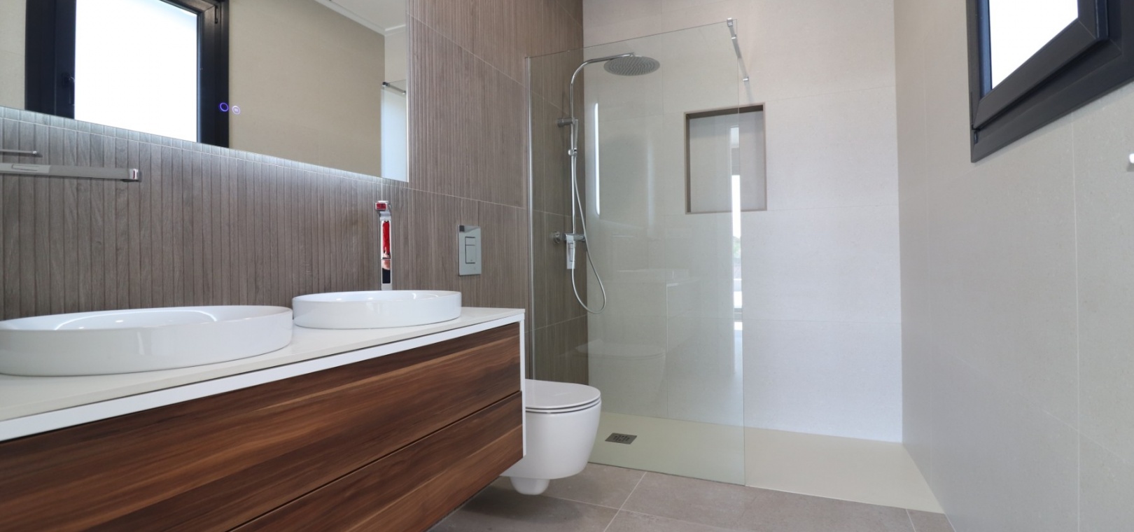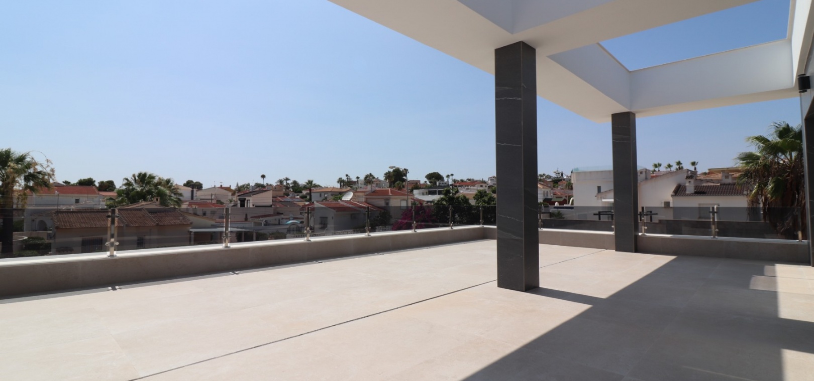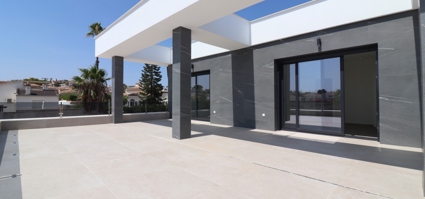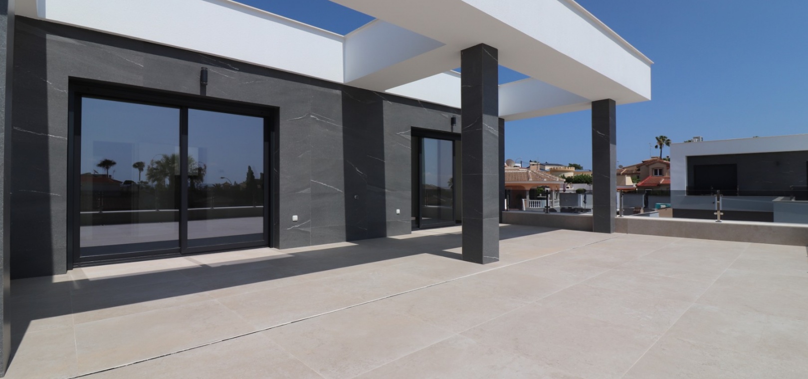 Sleutelklaar en instapklaar 311 m² bebouwd over drie verdiepingen op een privéperceel van 550 m² Drie tweepersoonsslaapkamers, elk met een eigen badkamer met douche Extra gastentoilet op de begane grond Lichte, open woon- en eetkamer met grote schuifdeuren Moderne ingerichte keuken met aparte bijkeuken Vloerverwarming door het hele huis met individuele kamerthermostaten Geïntegreerde airconditioning Voorinstallatie voor zonnepanelen en opladen elektrische auto's Ruim boventerras met directe toegang vanuit de slaapkamers Privézwembad van 8 x 4 meter Aangelegde, onderhoudsarme tuin met kunstgras en verhoogde plantenbakken Veilig, ommuurd perceel met elektrische opritpoort Grote onderbouw met interne toegang en ruimte voor meerdere voertuigen of verdere ontwikkeling