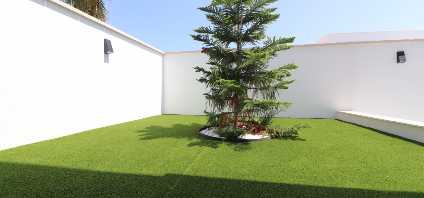 De buitenkant is ontworpen met oog op zowel schoonheid als functionaliteit, met betegelde oppervlakken voor eenvoudig onderhoud, verhoogde borders met planten en een weelderig kunstgrasgedeelte. Het privézwembad is perfect om te ontspannen of gasten te ontvangen, met voldoende ruimte voor tuinmeubilair.